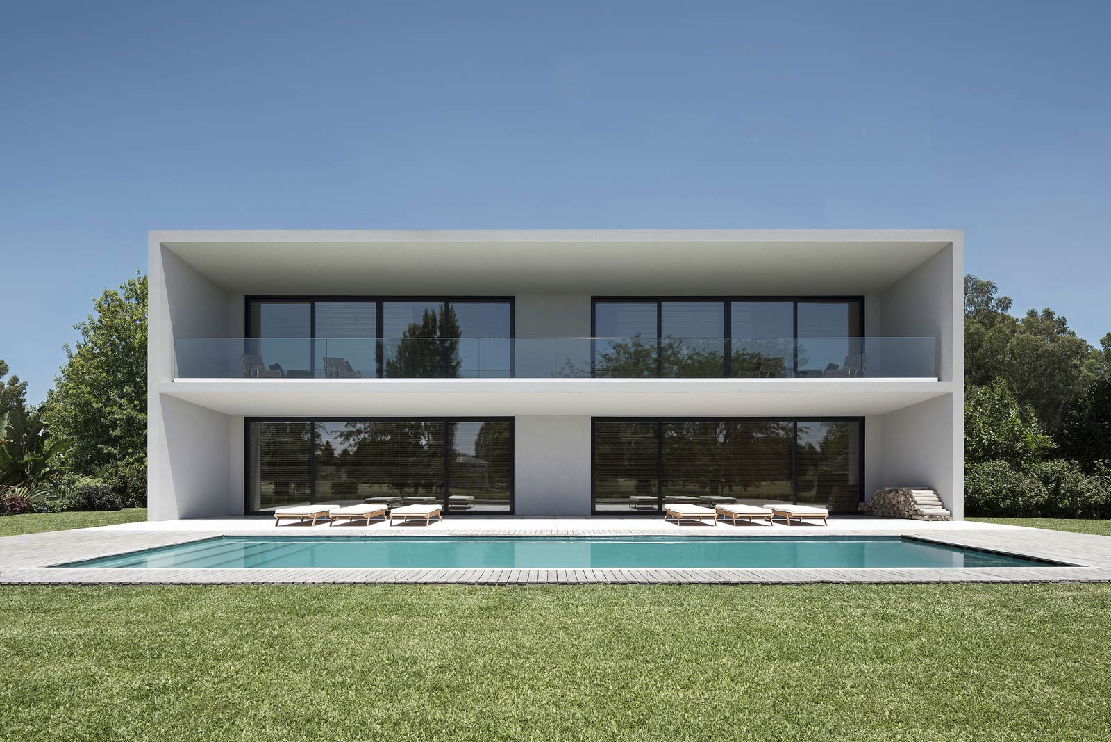 Un terreno de forma irregular con vistas a una espectacular cancha de golf y la voluntad de generar el escenario de la vida cotidiana de una familia fueron los dos ejes del desafío para el Estudio. Así se proyectó una vivienda determinada por la existencia de dos bloques con subsuelo y dos plantas, unidos mediante un hall central que contiene a la circulación vertical. A modo de fuelle entre ambos bloques, este espacio se resolvió mediante una estructura metálica y vidrio, generando ligereza y transparencia. En sintonía con la disposición trapezoidal del lote, el módulo del contrafrente duplica en tamaño al del frente. Grandes ventanales funden a la construcción con el verde que la rodea. Predomina la paleta de los grises en el revestimiento exterior, con aberturas en aluminio negro. Para los pisos de toda la casa se utilizó madera de roble americano. El Estudio fue autor del equipamiento interior, que consta de una serie de muebles a medida, modulados y empotrados con acabado laqueado, con terminaciones de altísima prestación. Muebles de diseño moderno inspirados en la década del 50 y algunos toques de impronta escandinava completaron la puesta interior.