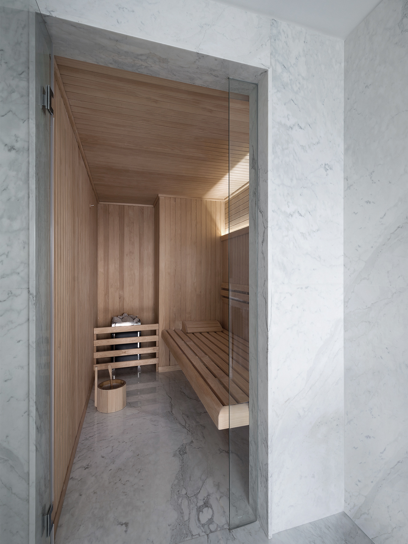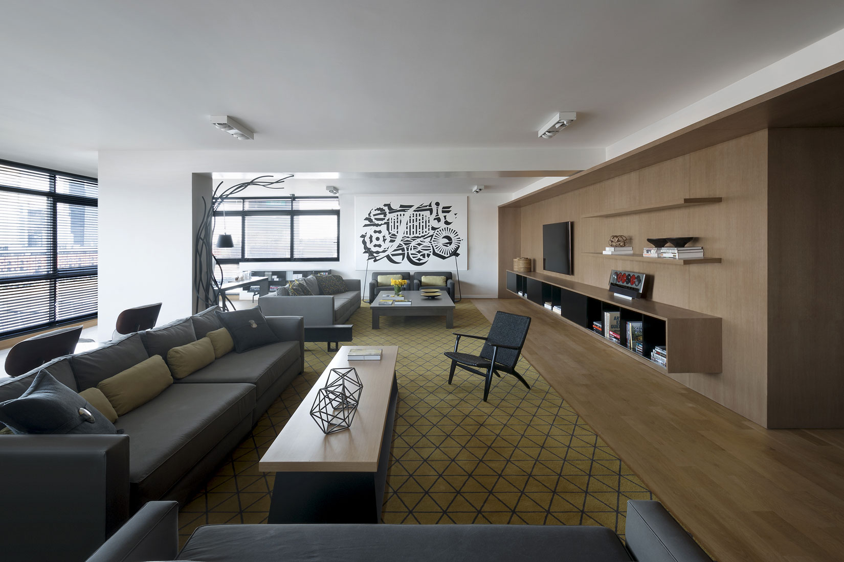 El encargo al Estudio fue crear casi de cero y desarrollar una intervención total en una planta muy amplia, de 450 metros cuadrados. Muros derribados, baños trasladados, ambientes reubicados, todo para satisfacer las necesidades de una familia integrada por un matrimonio y sus tres hijos. En consonancia con el estilo de arquitectura e interiorismo por los que el Estudio es reconocido, se buscó generar continuidad en toda la vivienda, para lo cual se recurrió a pocos materiales que cosieran la totalidad del espacio. Uno de los mejores ejemplos es el piso de roble americano, que recorre todo el departamento, incluidos la cocina y el hall de ingreso. Y el del equipamiento, diseñado a medida para cada uno de los ambientes, en gran parte ejecutados en la mencionada madera. En la recepción se trazaron dos grandes áreas, integradas priorizando las vistas extraordinarias que ofrece el piso. La sensación es la de estar en la cubierta de un barco disfrutando de la perspectiva del dique y de las embarcaciones, como también de algunos hitos urbanos que también se ven como en pantalla gigante. Una carpeta hecha a medida recorre toda la extensión del espacio, que despliega dos obras de Pablo Siquier en los extremos y una escultura de Pablo Reinoso en el centro. Los cuartos, de grandes dimensiones y todos en suite, fueron resueltos con los mismos materiales que se trabajaron en el área social, con la madera de roble nuevamente como protagonista. La cocina fue virtualmente subdividida en sectores: el central para la cocción, hacia un lado el comedor diario y, en el extremo opuesto, una zona de guardado de vajilla que se conecta con el comedor. El concepto de unificación de materiales rigió también en este espacio, corazón de la casa, donde la madera de roble y el laqueado del mobiliario potenciaron la continuidad. Todos los baños, de generosas dimensiones, fueron revestidos en mármol calacata.