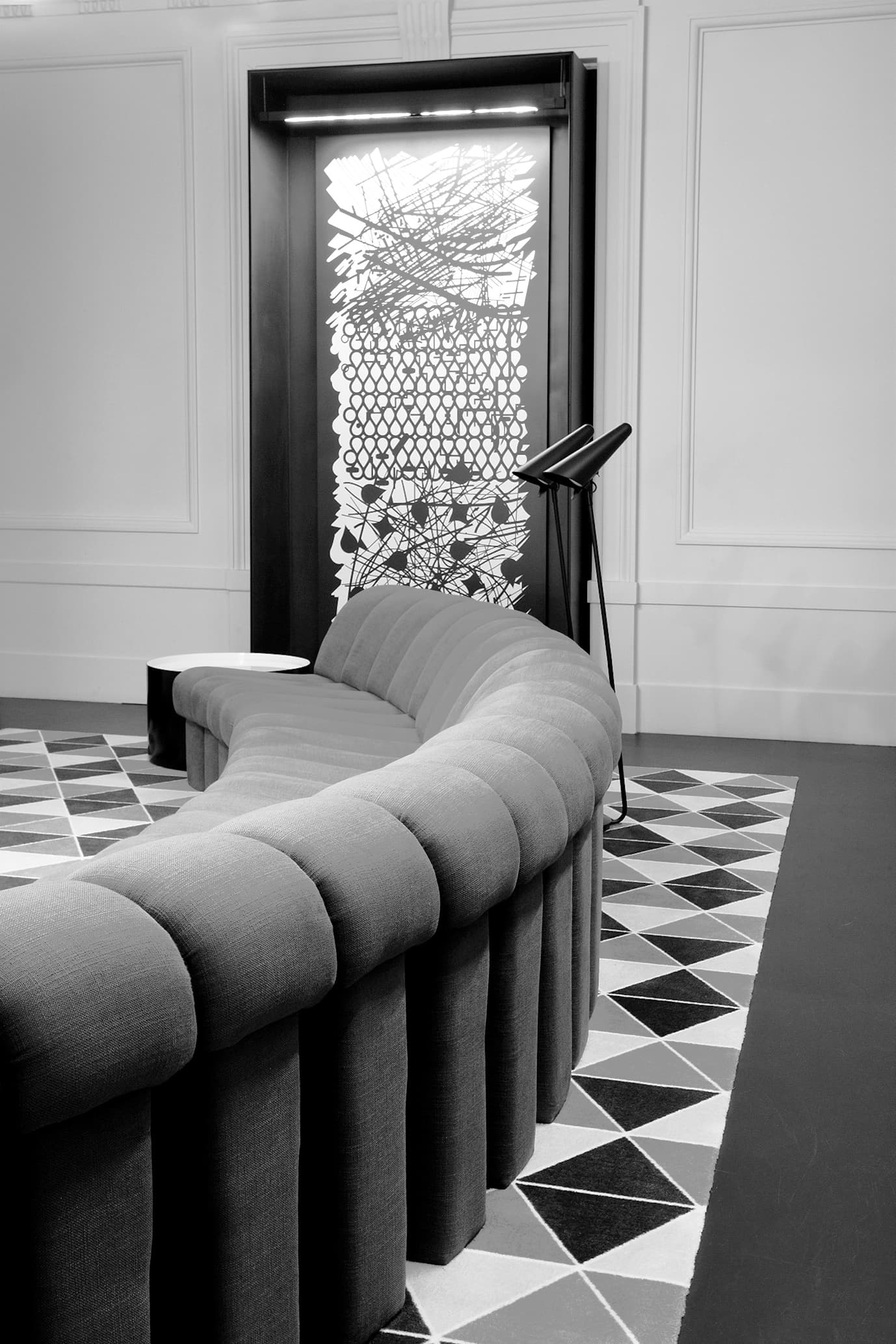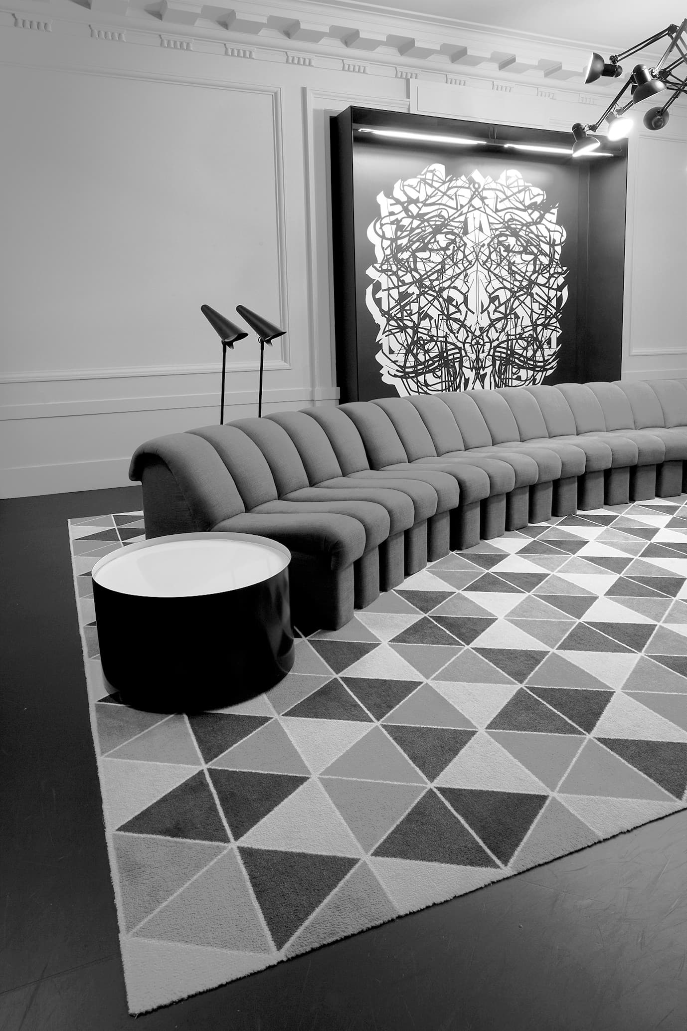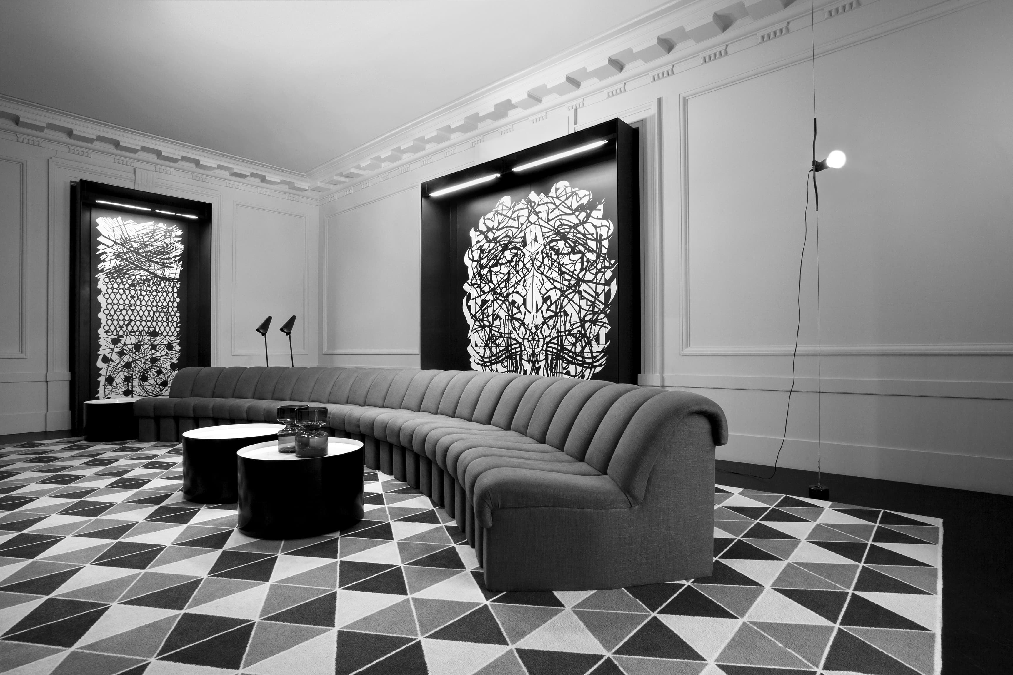 Our proposed intervention honors the building’s eclectic architecture, and actually enhances it by incorporating contemporary elements, which clearly contrast with the pre-existing ornamentation on the walls, doors and ceiling. The elements chosen to interact within this space were selected with great precision, picked by their potential to impose a specific mark on the place. Each element balances out the rest, creating a calm atmosphere in a symmetrical space. These elements are: metallic porticos which frame the openings, artwork by the prestigious visual artist Pablo Siquier, a grand rug designed by our studio, a DS600 sofa – a classic 1970’s design piece – and finally, a chandelier made out of a series of modern table lamps. Our project entailed a spatial intervention which kept the original architecture intact, further restoring and highlighting it through the inclusion of new elements that add value to the essence of the building and update its original splendor.
