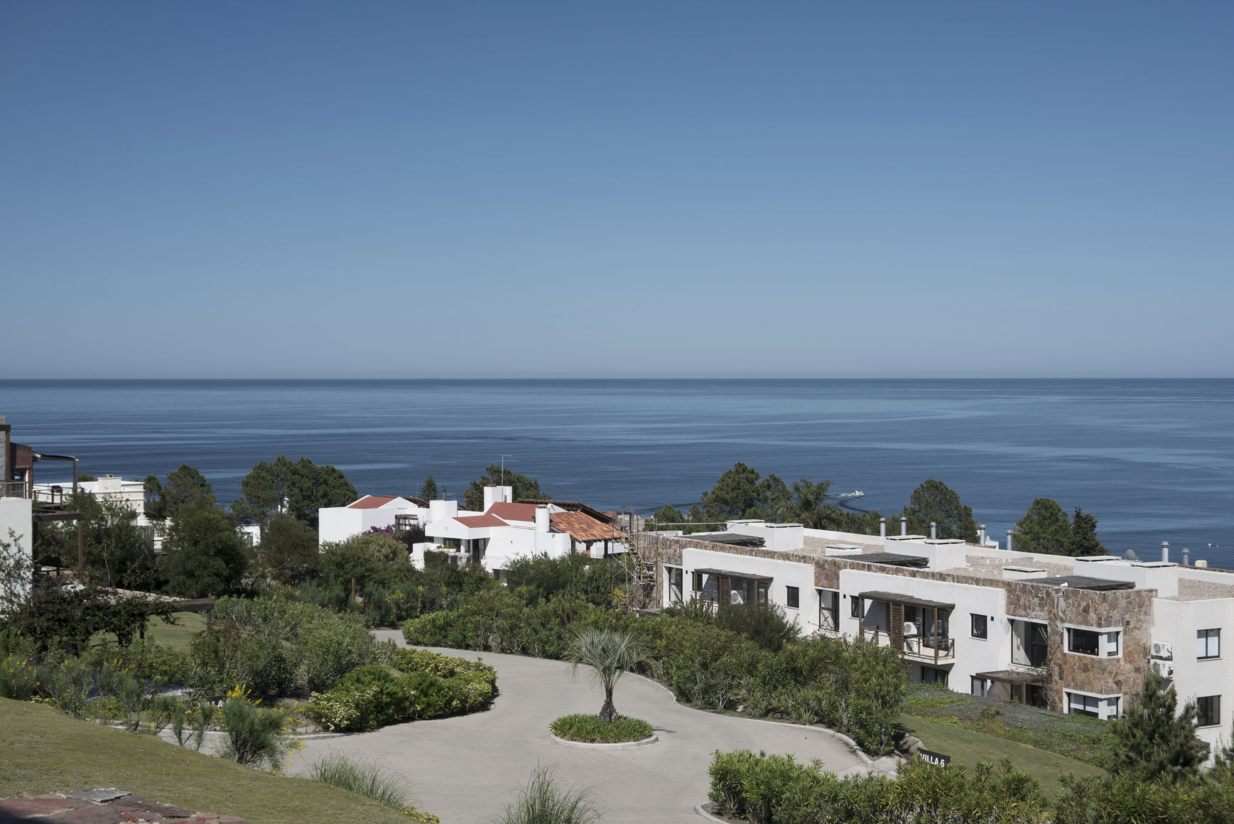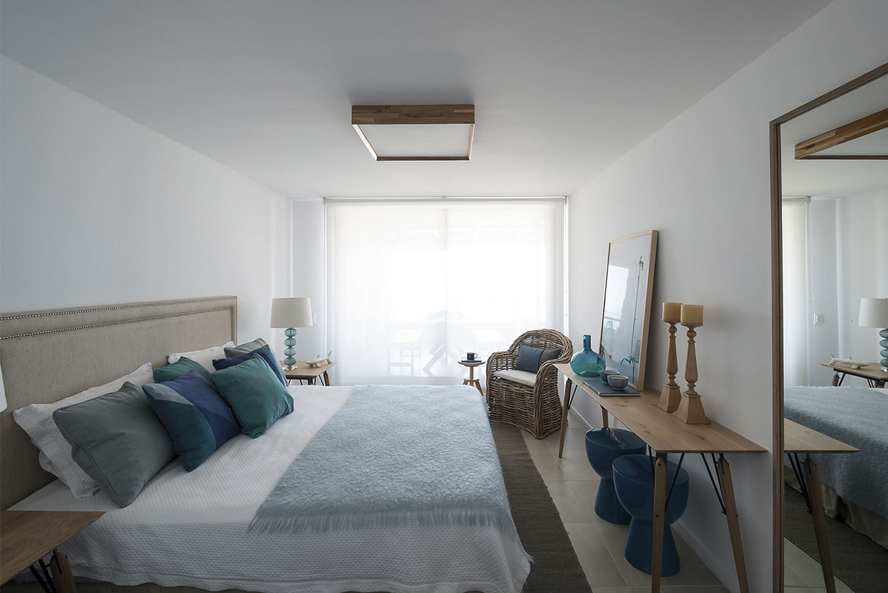 This construction is located in Quartier Punta Ballena, about 15 kilometers south of Punta del Este. The building serves as a great balcony over the sea, right on the natural slope sketched out by coast geography, taking advantage of the breathtaking sunset views that the Mansa beach has to offer. On a horizontal layout that extends out into an ample terrace with walls made out of Uruguayan stone, this apartment, originally very well built, was in perfect shape, so the Studio concentrated on its proposal for the interior design. As is the usual procedure in these cases, the goal was to deliver an atmosphere with plenty of white. Wood was the chosen material to achieve a synthesis between refinement and coziness in a series of custom equipment. A blue and turquoise color scheme skillfully introduced the marine theme together with some elements in wicker such as the dining room lamp, purchased at Iluminación Agüero in Buenos Aires, and the Asian couch set in the master bedroom. Among the local stores that provided furniture and objects, two are worth naming: Marabierto and Occidente. One of the guidelines for the reform was to produce the maximum integration possible between the indoor unit and the terrace by prolonging the outdoor roof made of wood and canes which creates a semi-covered area ideal for sunny days, cool afternoon and windy nights. Through this additional area gained from the outdoors, this apartment acquired new dimensions and ended up blending into the spectacular marine surroundings.