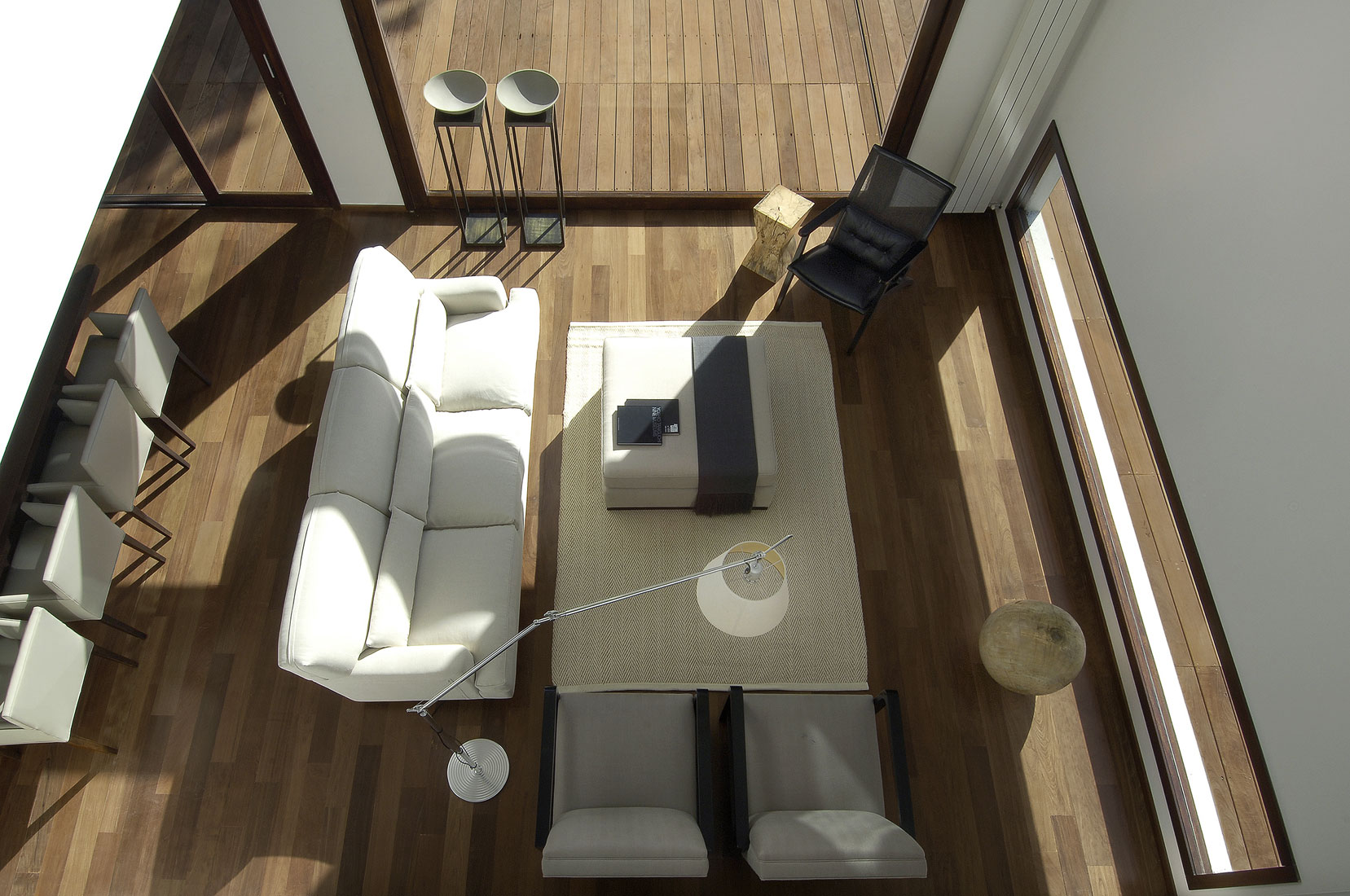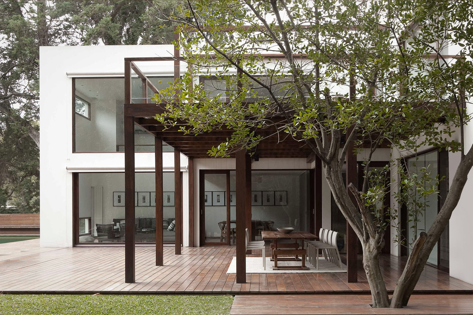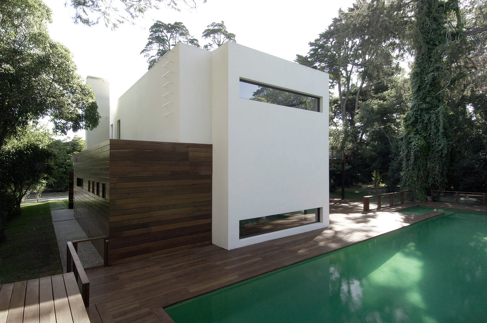 Inside a gated community, located at the end of a street facing a cul-de-sac, the lot on which this house is built was special because of its lush grove. Both the commissioners and the Studio truly valued the existing vegetation so they took it as a starting point for this project. The L-shaped layout opens out into the back and to one side of the building, with a view to green spaces shared by the community. Between these two glass facades which embrace their surroundings, a wooden structure serves as a terrace on the top story, creating a semi-covered area on the ground floor. A deck made of the same wood connects the house to the swimming pool, offering visual continuity and completing the social area of the project. Inversely, the front façade and the other lateral, where the service areas are located, have smaller openings aiming to protect the privacy of those dwelling in the house while also increasing their sense of refuge. The architectural language here is refined, with touches of modernism, daring strokes, and a will to honor austerity by reducing the use of building materials. Wood takes center stage since it is used in openings, decks and flooring in the social areas of the house, nurturing a continuous exchange between inner and outer spaces. Along the same lines, to ensure visual continuity, green was the chosen color for pool coverings so that it could blend into the surrounding vegetation. The Studio was integrally in charge of the design, from the first sketches down to the last details of the interior design, which guaranteed the project was well coordinated and harmonious.
