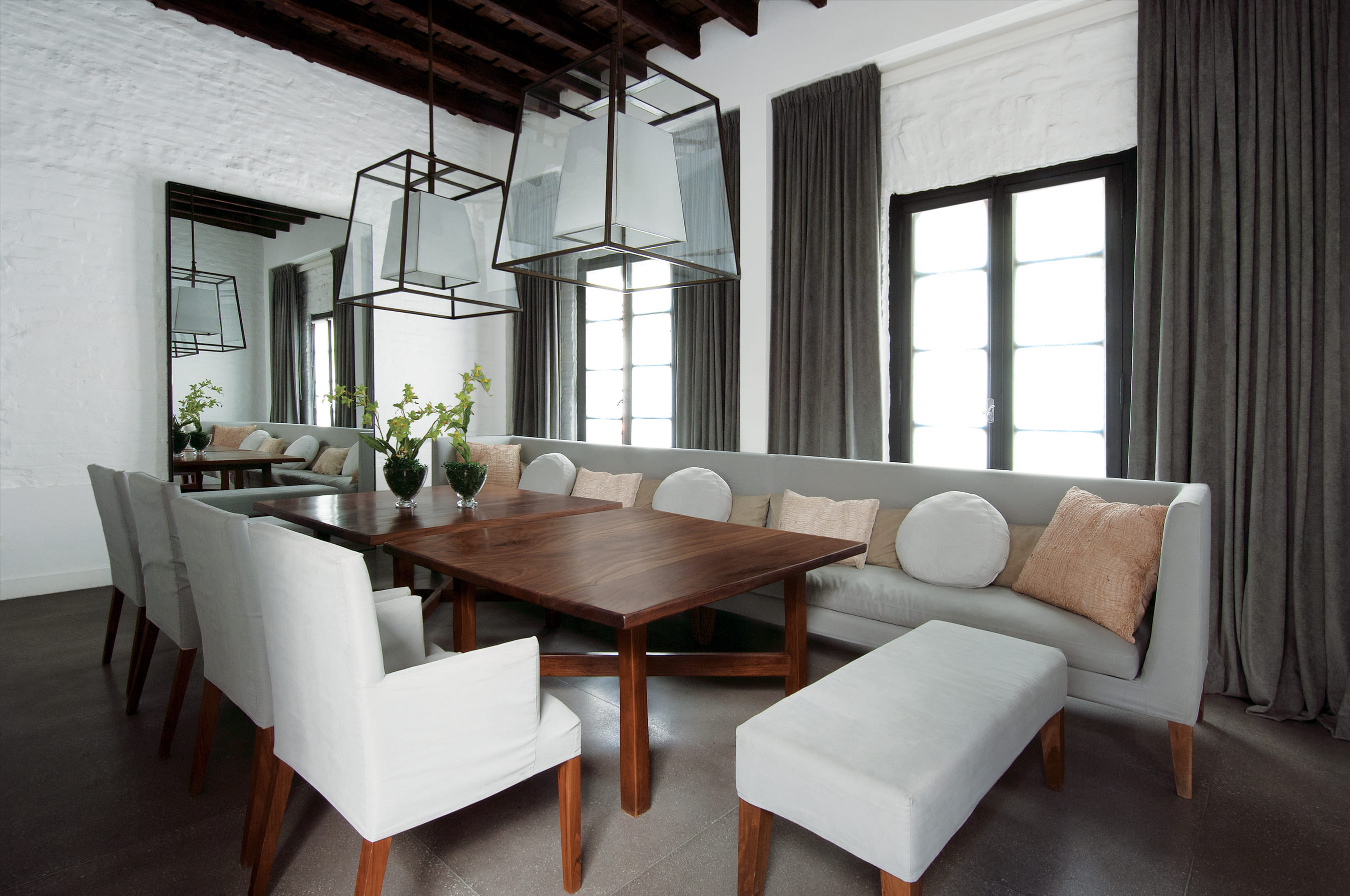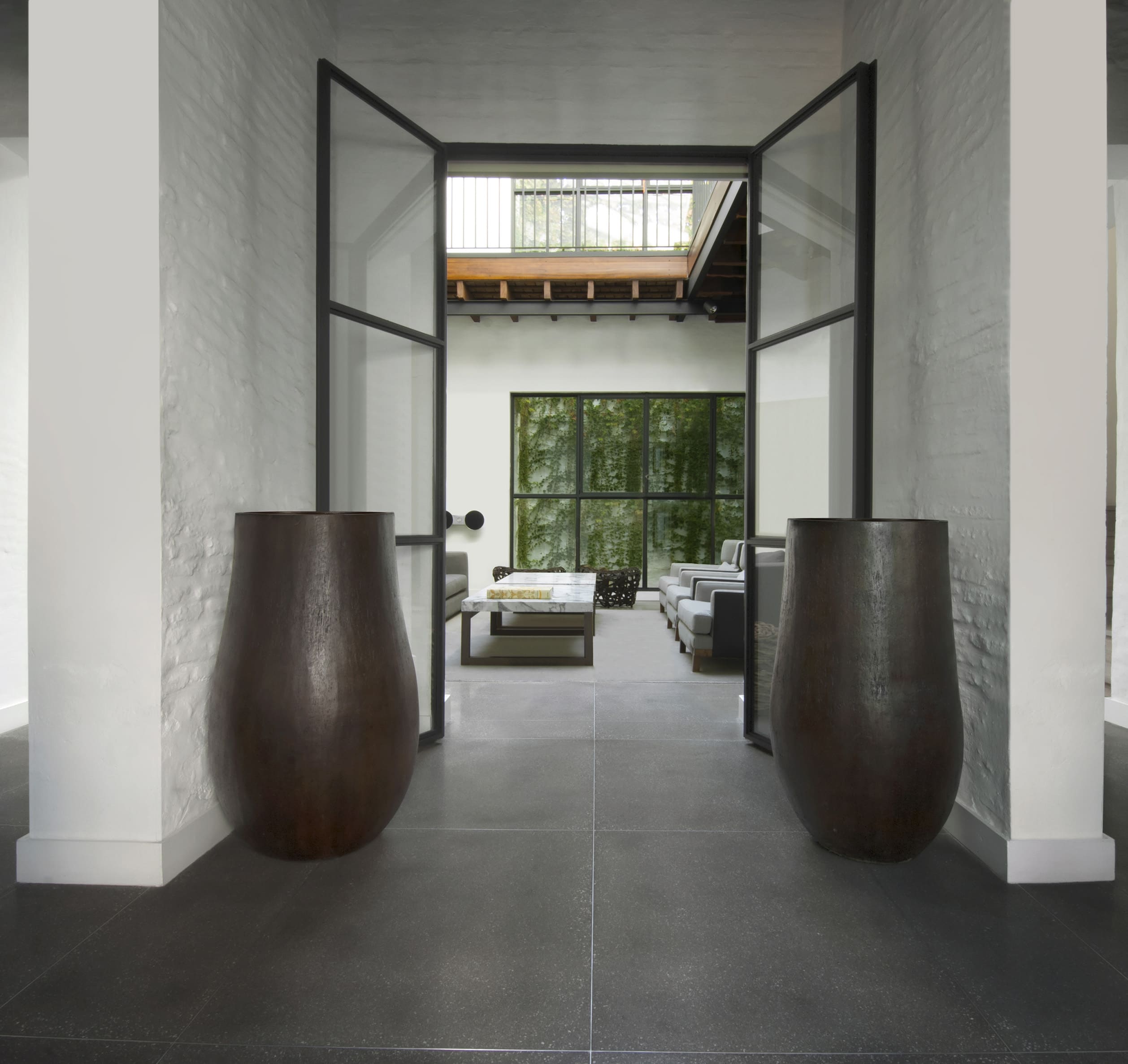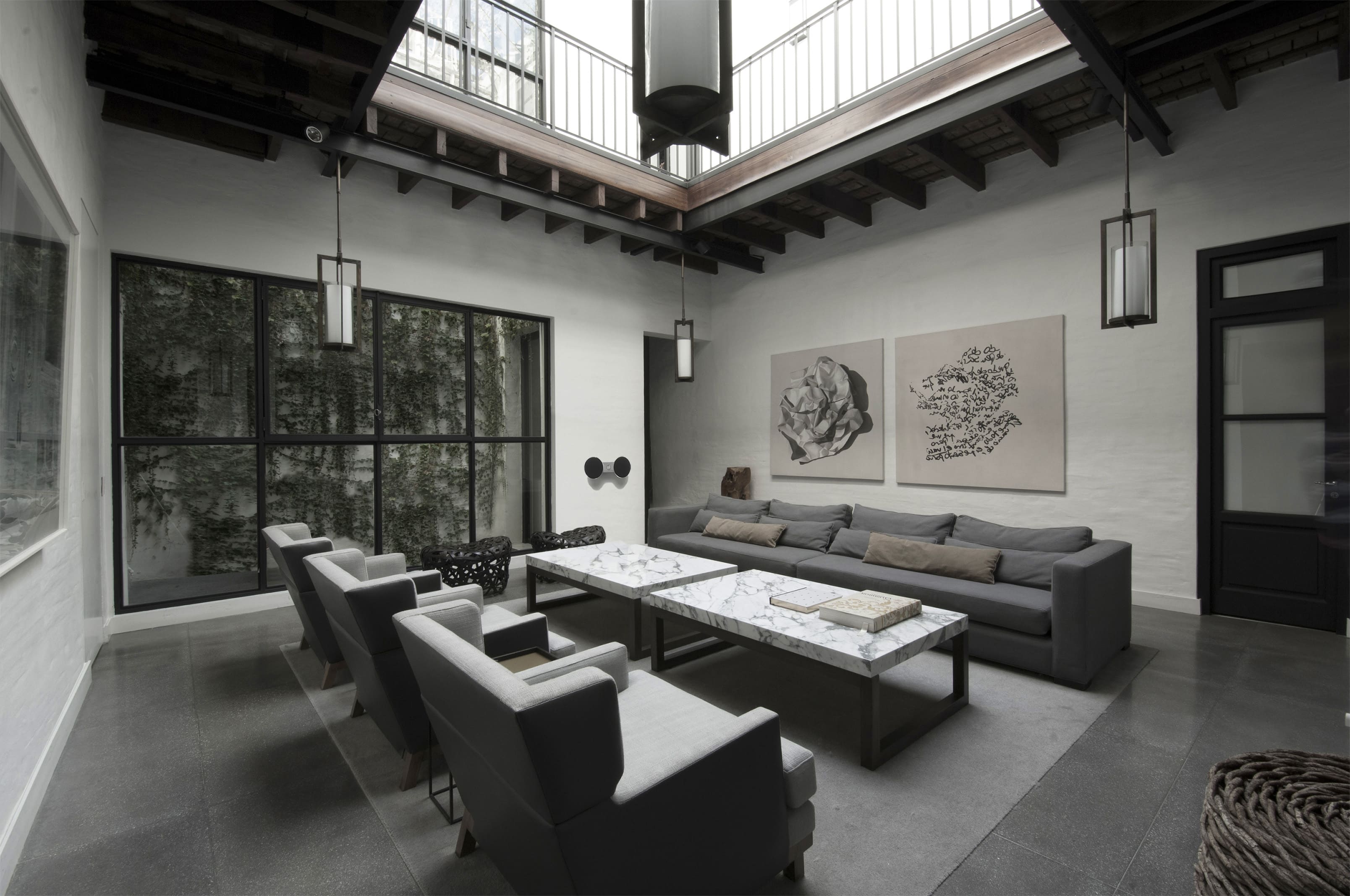 This house is located on a classic site in the Buenos Aires Historic District with a cloister layout on a square lot measuring 15 x 15 meters. Years earlier, the unit had been redone to improve quality. However, after living here for a decade, the owners realized they wanted certain functional changes, in terms of esthetics and technology, which would upgrade the property to offer them a life style that was more in sync with their needs. The reconditioning efforts flowed in perfect harmony with the clients - a prestigious advertising executive, his wife and their three children - who were enthusiastic about living with contemporary advantages while still conserving the magical air of history. One of the pillars of this project was generating the utmost integration with the central courtyard, the soul of the house, by turning this new design into an expansive living room. Large iron and glass windows were designed, the one on the top floor reaches up towards a dome that bathes every room in natural light. A playful conversation between different historic eras became the leitmotif of this renovation, the box was not covered, and the exposed bricks were painted white. In opposition, the iron components – the windows, the gallery cantilever gate and the original wooden doors – were painted black. The roofs made out of pinotea wood beams, and the exposed bricks without coverings, remain as a testimony to the past. While the wooden floors on the upper story were whitened, floors on the ground level were built in situ in granite colored cement. To complement all these choices, which prove that harmony among contrasting elements is possible when compatible lines are drawn, a detailed interior design effort ensued, incorporating modernly designed furniture, within a serene color palette, where white and gray are predominant in the equipment and where certain nods to times gone by can be found, adding a touch of warmth. The top level features a terrace with a pool. Once again, aiming for integration, the deck was painted black like the nearby urban attics. The counterpoint between black and white, added to the green in the vegetation, achieve a pleasant atmosphere of calm in a downtown area of the city.