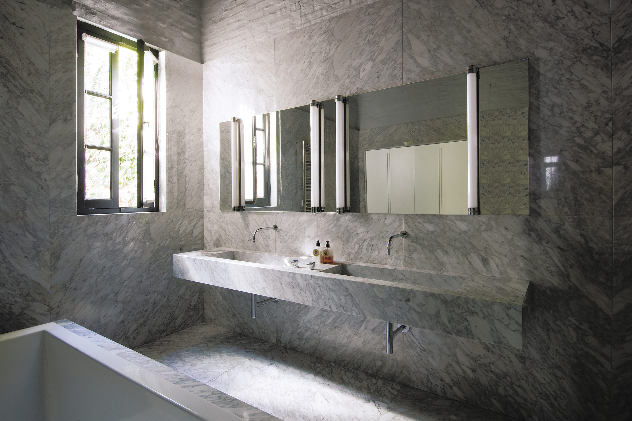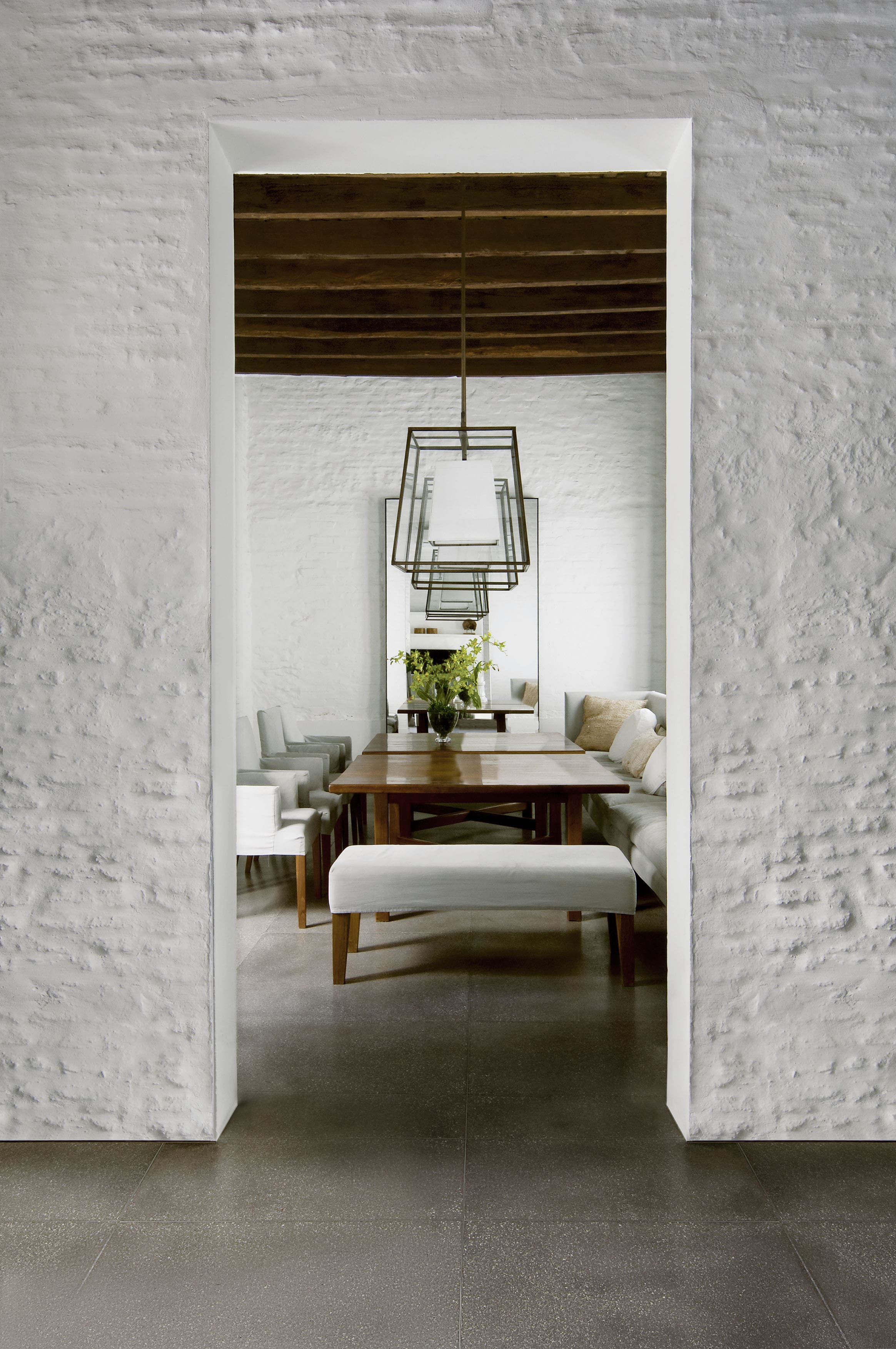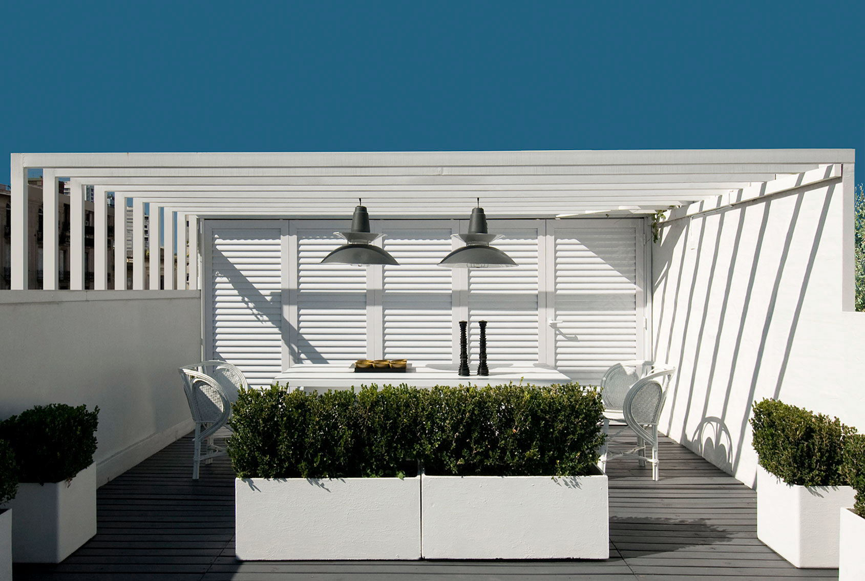 This house is located on a classic site in the Buenos Aires Historic District with a cloister layout on a square lot measuring 15 x 15 meters. Years earlier, the unit had been redone to improve quality. However, after living here for a decade, the owners realized they wanted certain functional changes, in terms of esthetics and technology, which would upgrade the property to offer them a life style that was more in sync with their needs. The reconditioning efforts flowed in perfect harmony with the clients - a prestigious advertising executive, his wife and their three children - who were enthusiastic about living with contemporary advantages while still conserving the magical air of history. One of the pillars of this project was generating the utmost integration with the central courtyard, the soul of the house, by turning this new design into an expansive living room. Large iron and glass windows were designed, the one on the top floor reaches up towards a dome that bathes every room in natural light. A playful conversation between different historic eras became the leitmotif of this renovation, the box was not covered, and the exposed bricks were painted white. In opposition, the iron components – the windows, the gallery cantilever gate and the original wooden doors – were painted black. The roofs made out of pinotea wood beams, and the exposed bricks without coverings, remain as a testimony to the past. While the wooden floors on the upper story were whitened, floors on the ground level were built in situ in granite colored cement. To complement all these choices, which prove that harmony among contrasting elements is possible when compatible lines are drawn, a detailed interior design effort ensued, incorporating modernly designed furniture, within a serene color palette, where white and gray are predominant in the equipment and where certain nods to times gone by can be found, adding a touch of warmth. The top level features a terrace with a pool. Once again, aiming for integration, the deck was painted black like the nearby urban attics. The counterpoint between black and white, added to the green in the vegetation, achieve a pleasant atmosphere of calm in a downtown area of the city.