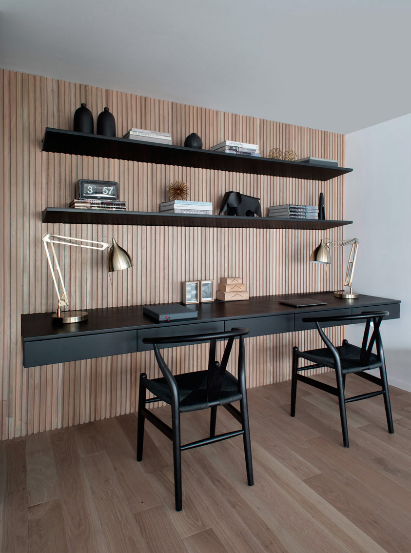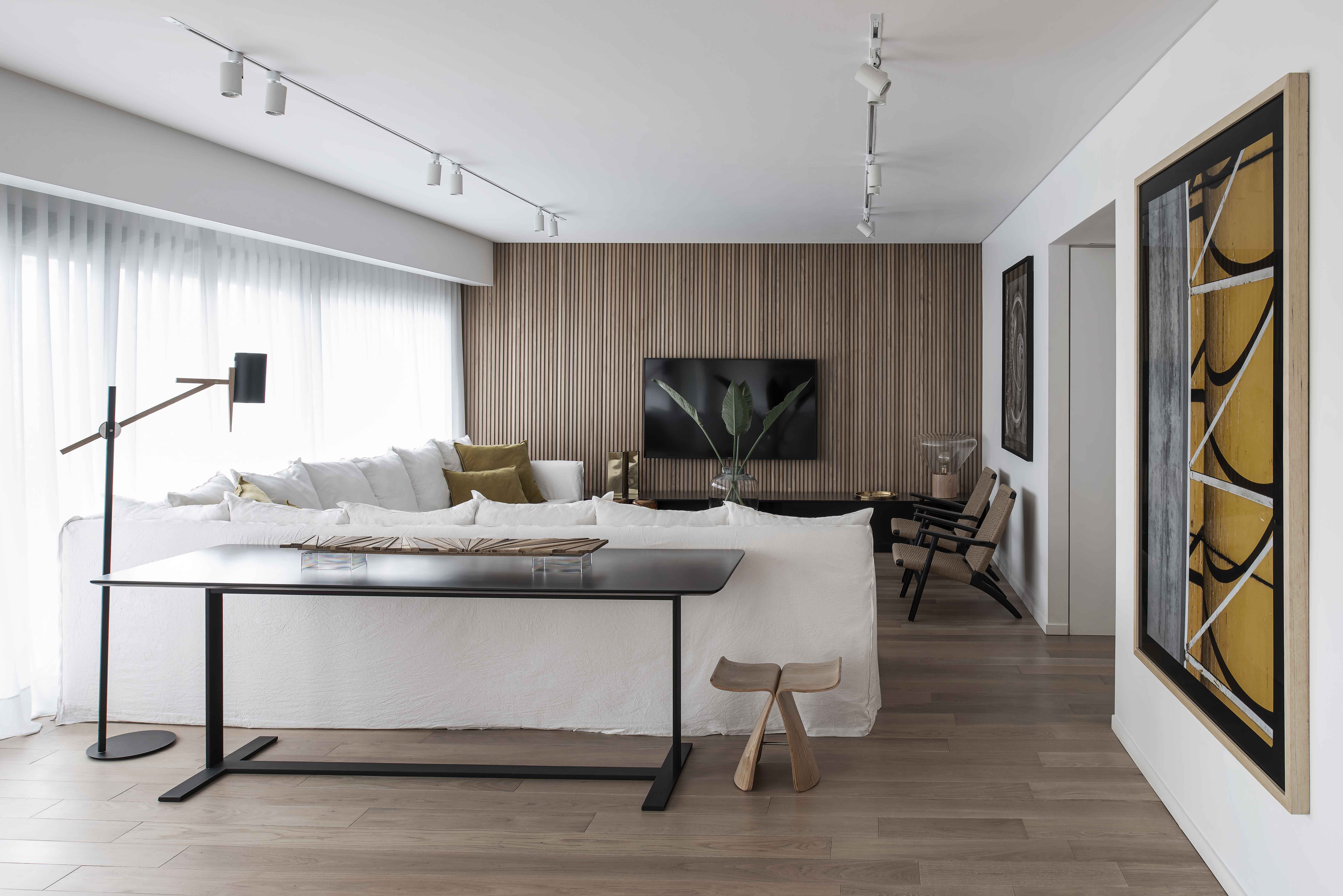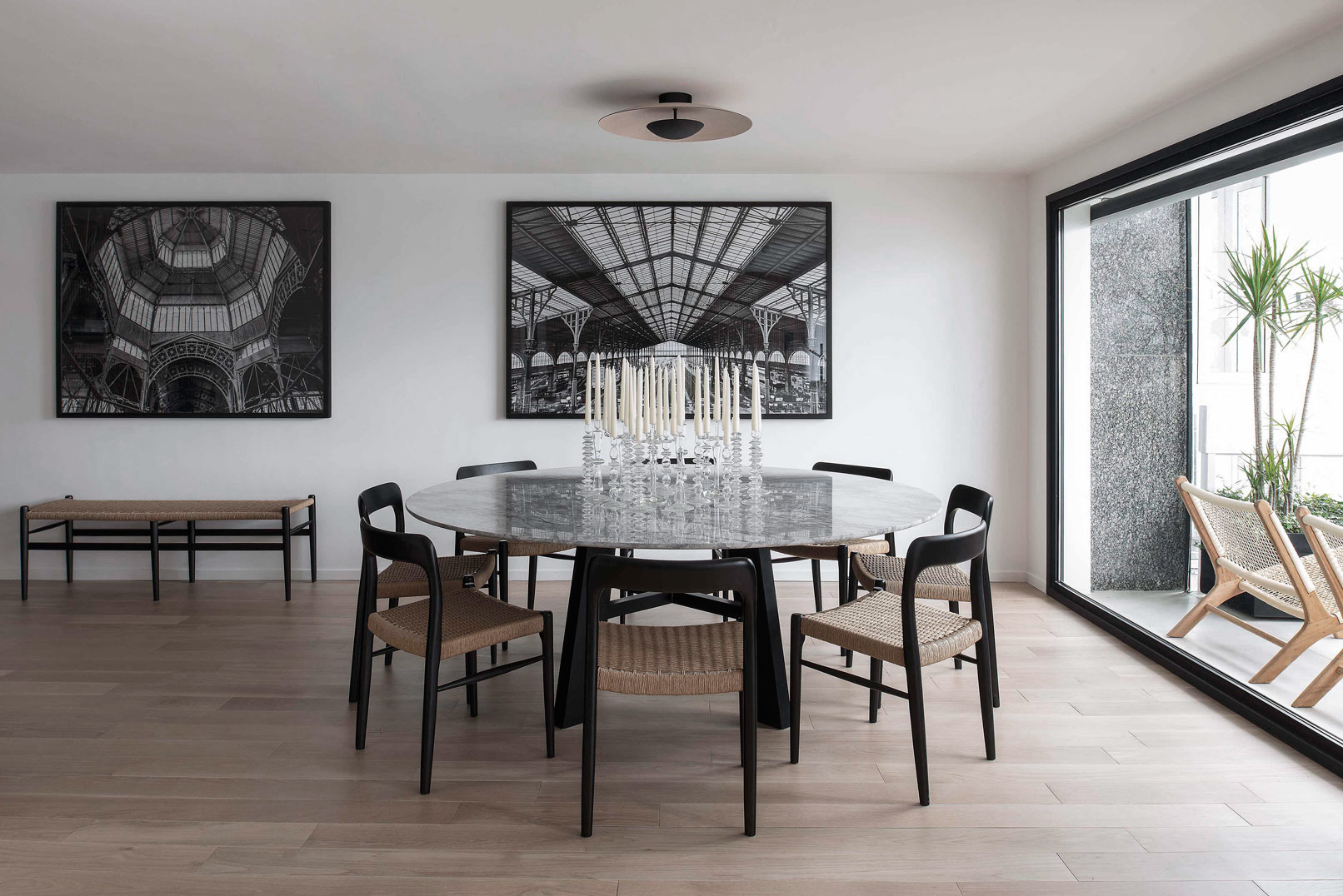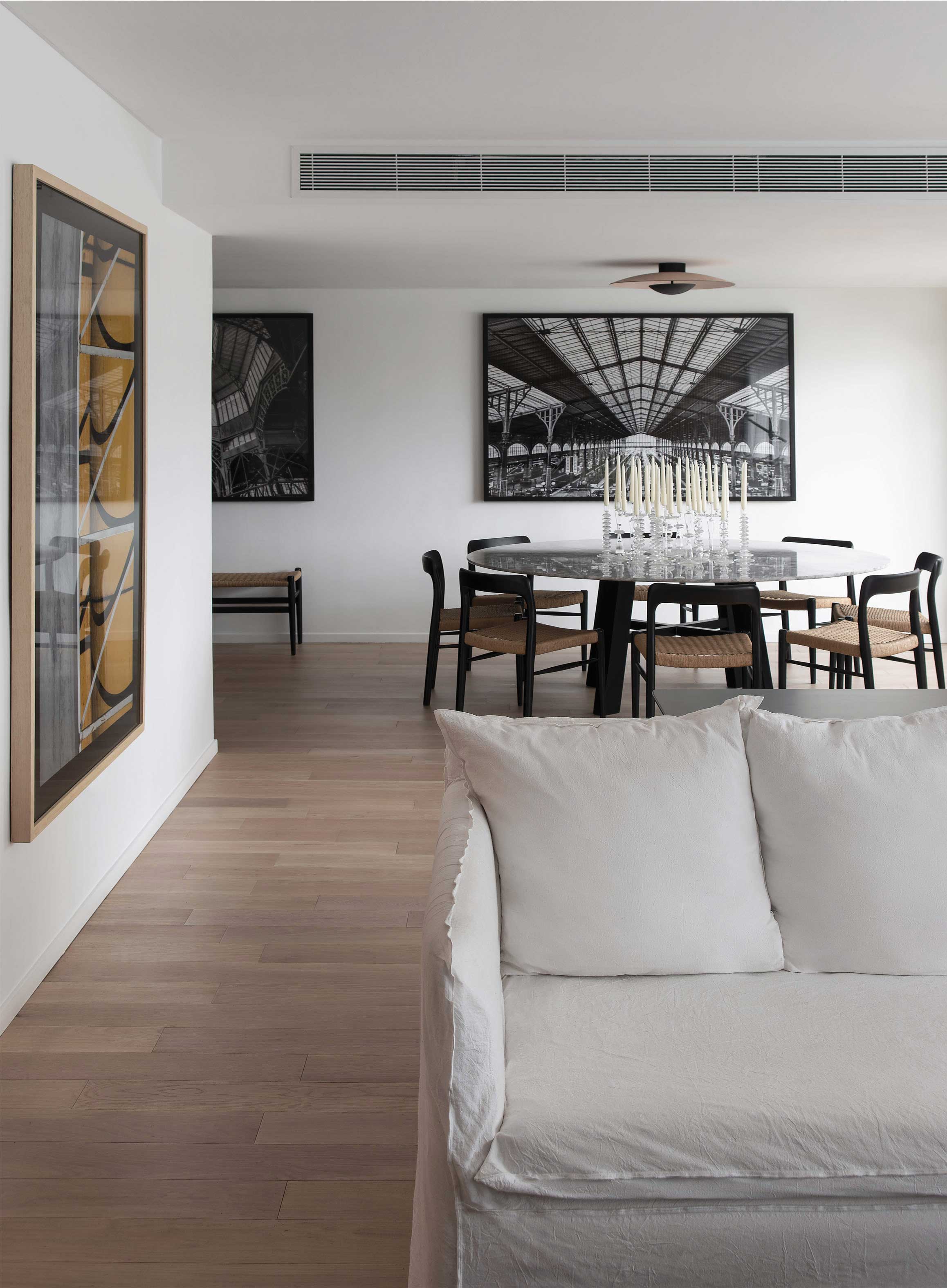 This endeavor towards integral reform was developed in an apartment located in the posh Palermo Chico neighborhood, inside an 80 year old building on Libertador Avenue. To carry out the task, Muradas Studio worked completely in sync with civil engineer Ignacio Iraola, a partner with Irgo; they had already worked together before for a common corporate client. While the Studio was in charge of interior design and equipment, Irgo was responsible for the construction work. The goal of this intervention was to adapt the apartment to the lifestyle requirements of the abovementioned engineer, his wife and their two children who are in elementary school. As for the layout, the original distribution of rooms was preserved in almost every space, although some circulation routes were altered to ensure an improved order. The guest bathroom was relocated and the service area was modified to allow for more kitchen space. The overall criteria was to establish an absolute fusion amongst all rooms, as they blend together through the same type of flooring – long American oak boards- and white walls featuring wood paneling in strategic places. Every wall covered in the Breeze Tauari material radiates its typical warmth throughout the apartment. This holds true in the living room, the study, the daily dining area and kitchen counter, the bathroom, and also on the wall that serves as a bedrest in the master bedroom. By resorting to the same strategy in different areas, the Studio managed to create a smooth continuity effect which is a staple of every project spearheaded by Muradas. The dining room, which functions as a pivoting point on the “L” marked between the living room and the study, was furnished with a round table which adds fluidity to the space. Designed by Acento, as well as the living room table, it features a Silver White marble tabletop. For the Scandinavian style pieces, openings and different furniture items, black was the chosen color, as it creates a counterpoint with the wood and the natural fibers on some of the sofas, chairs and stools. Upon the client’s special request, his favorite Wishbone model chairs were placed in the study. Photographs by Gastón Fernández Berengeno and Christophe Correy from France – both artists from Henri’s Gallery – were selected for the apartment. For the kitchen, which has scarce natural lighting, special white lacquered equipment was designed. The Scandinavian style furniture for the balcony, in light-colored wood and natural fibers, was chosen along the same lines as the interior furniture. In this project, esthetic coherence and visual continuity are the maxims that pervade every single detail.