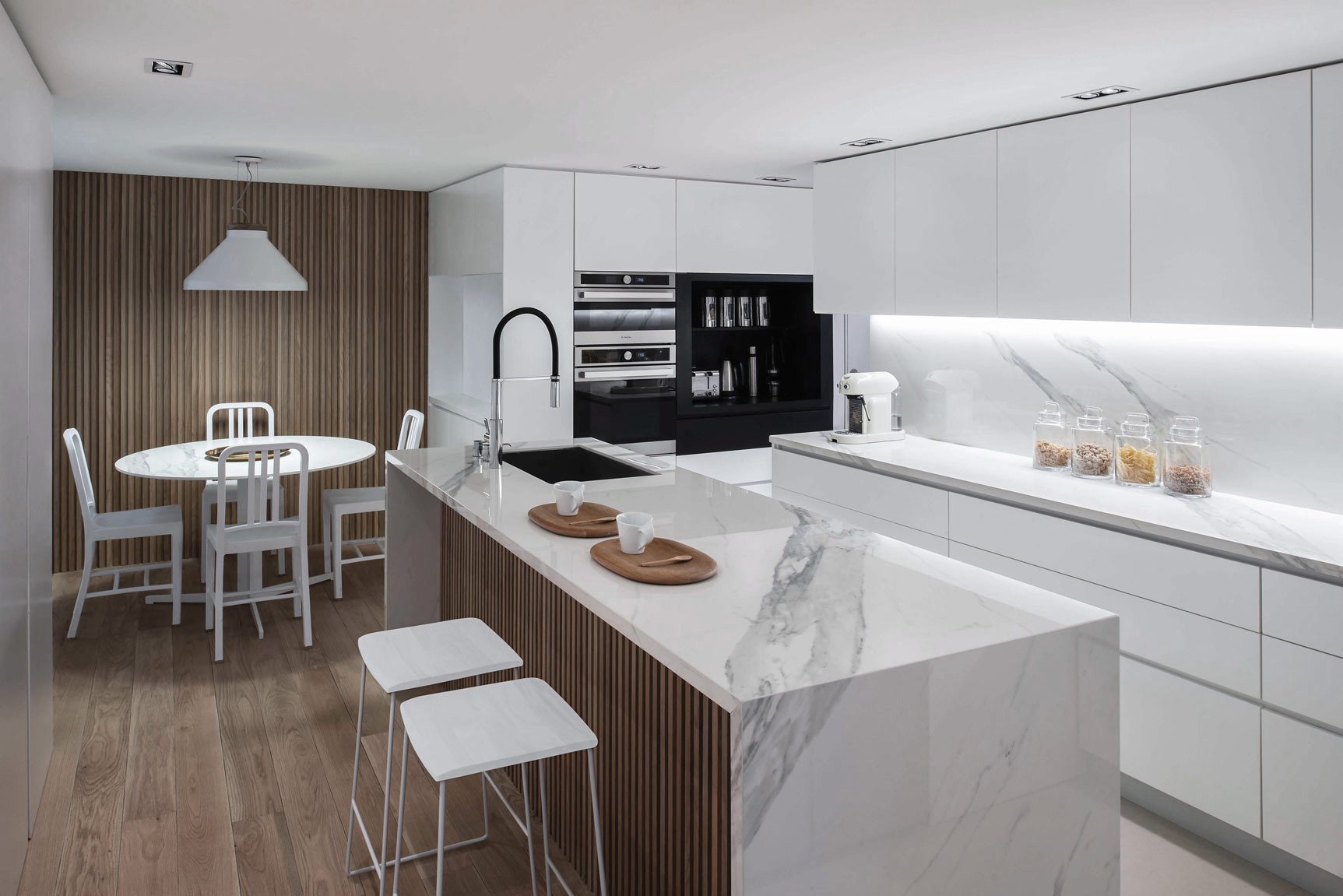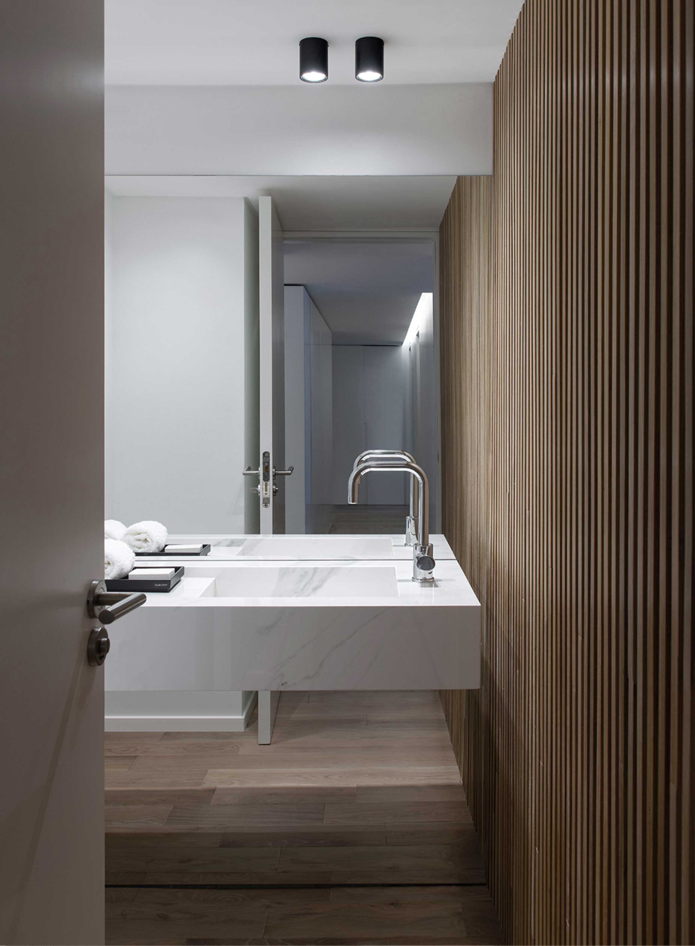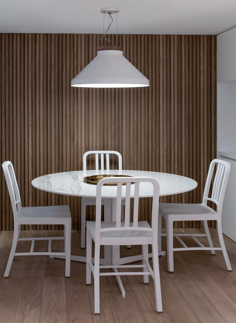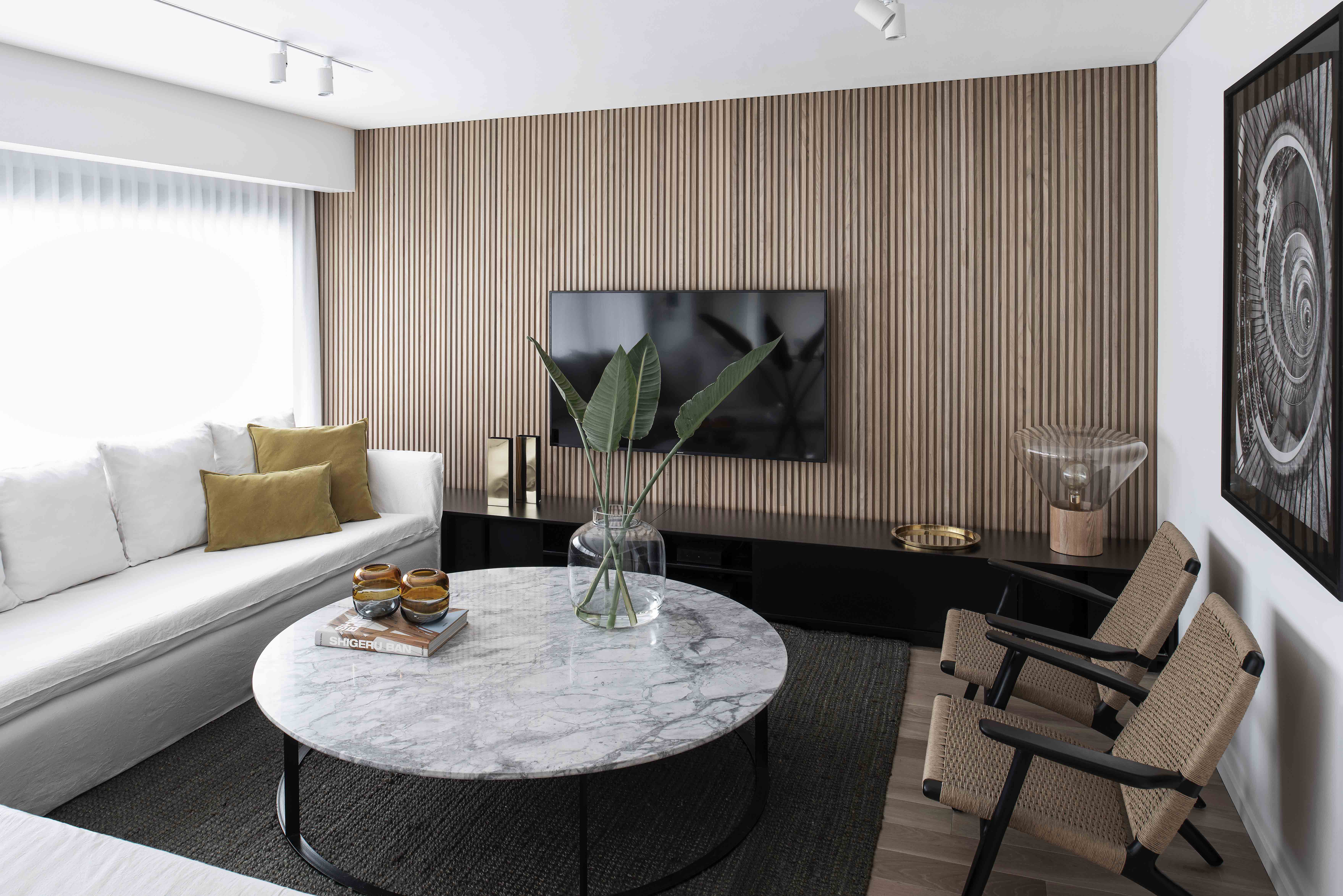 This endeavor towards integral reform was developed in an apartment located in the posh Palermo Chico neighborhood, inside an 80 year old building on Libertador Avenue. To carry out the task, Muradas Studio worked completely in sync with civil engineer Ignacio Iraola, a partner with Irgo; they had already worked together before for a common corporate client. While the Studio was in charge of interior design and equipment, Irgo was responsible for the construction work. The goal of this intervention was to adapt the apartment to the lifestyle requirements of the abovementioned engineer, his wife and their two children who are in elementary school. As for the layout, the original distribution of rooms was preserved in almost every space, although some circulation routes were altered to ensure an improved order. The guest bathroom was relocated and the service area was modified to allow for more kitchen space. The overall criteria was to establish an absolute fusion amongst all rooms, as they blend together through the same type of flooring – long American oak boards- and white walls featuring wood paneling in strategic places. Every wall covered in the Breeze Tauari material radiates its typical warmth throughout the apartment. This holds true in the living room, the study, the daily dining area and kitchen counter, the bathroom, and also on the wall that serves as a bedrest in the master bedroom. By resorting to the same strategy in different areas, the Studio managed to create a smooth continuity effect which is a staple of every project spearheaded by Muradas. The dining room, which functions as a pivoting point on the “L” marked between the living room and the study, was furnished with a round table which adds fluidity to the space. Designed by Acento, as well as the living room table, it features a Silver White marble tabletop. For the Scandinavian style pieces, openings and different furniture items, black was the chosen color, as it creates a counterpoint with the wood and the natural fibers on some of the sofas, chairs and stools. Upon the client’s special request, his favorite Wishbone model chairs were placed in the study. Photographs by Gastón Fernández Berengeno and Christophe Correy from France – both artists from Henri’s Gallery – were selected for the apartment. For the kitchen, which has scarce natural lighting, special white lacquered equipment was designed. The Scandinavian style furniture for the balcony, in light-colored wood and natural fibers, was chosen along the same lines as the interior furniture. In this project, esthetic coherence and visual continuity are the maxims that pervade every single detail.