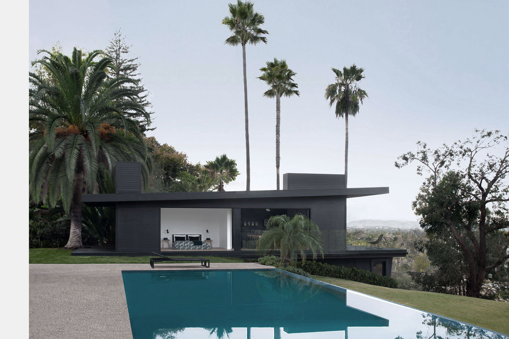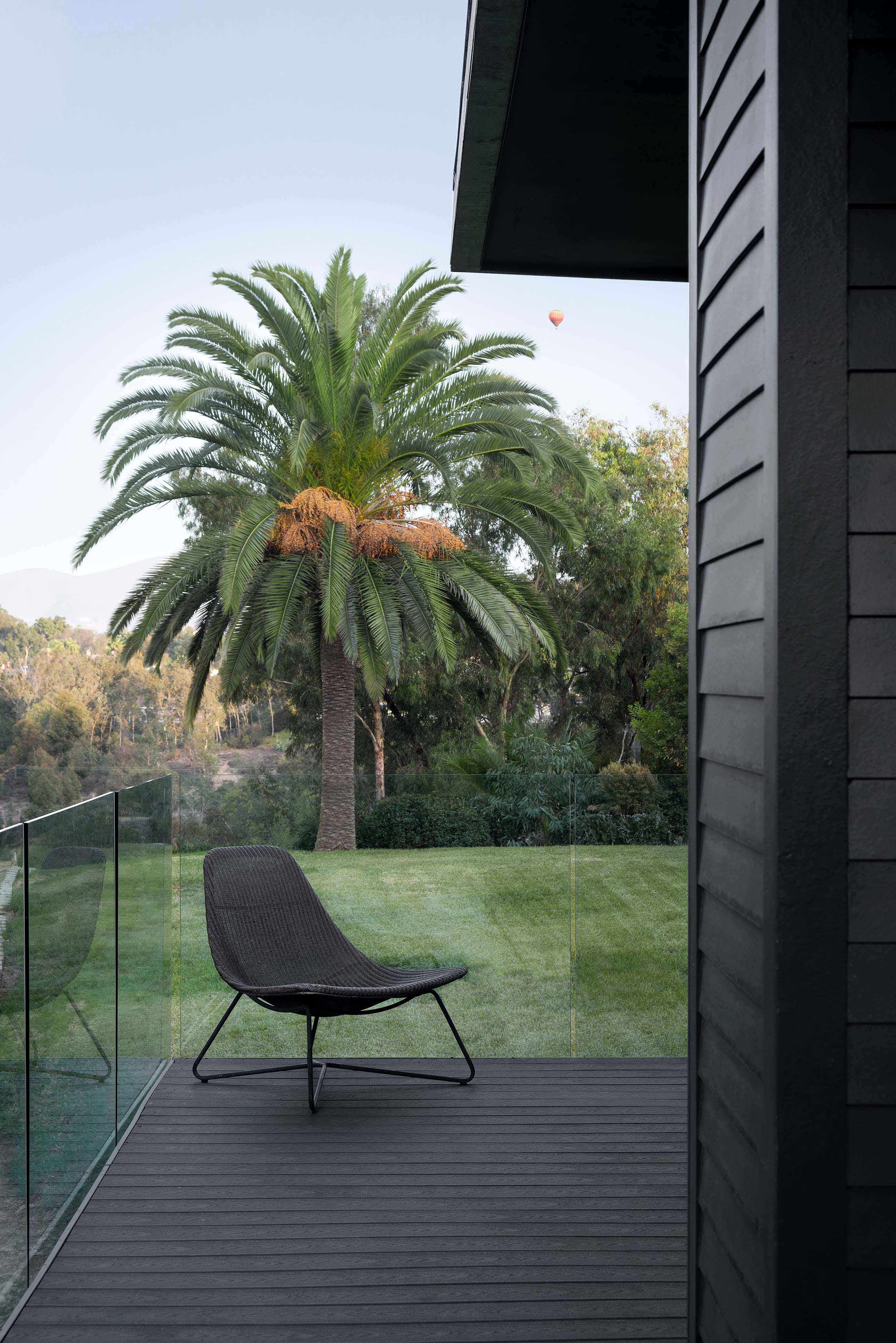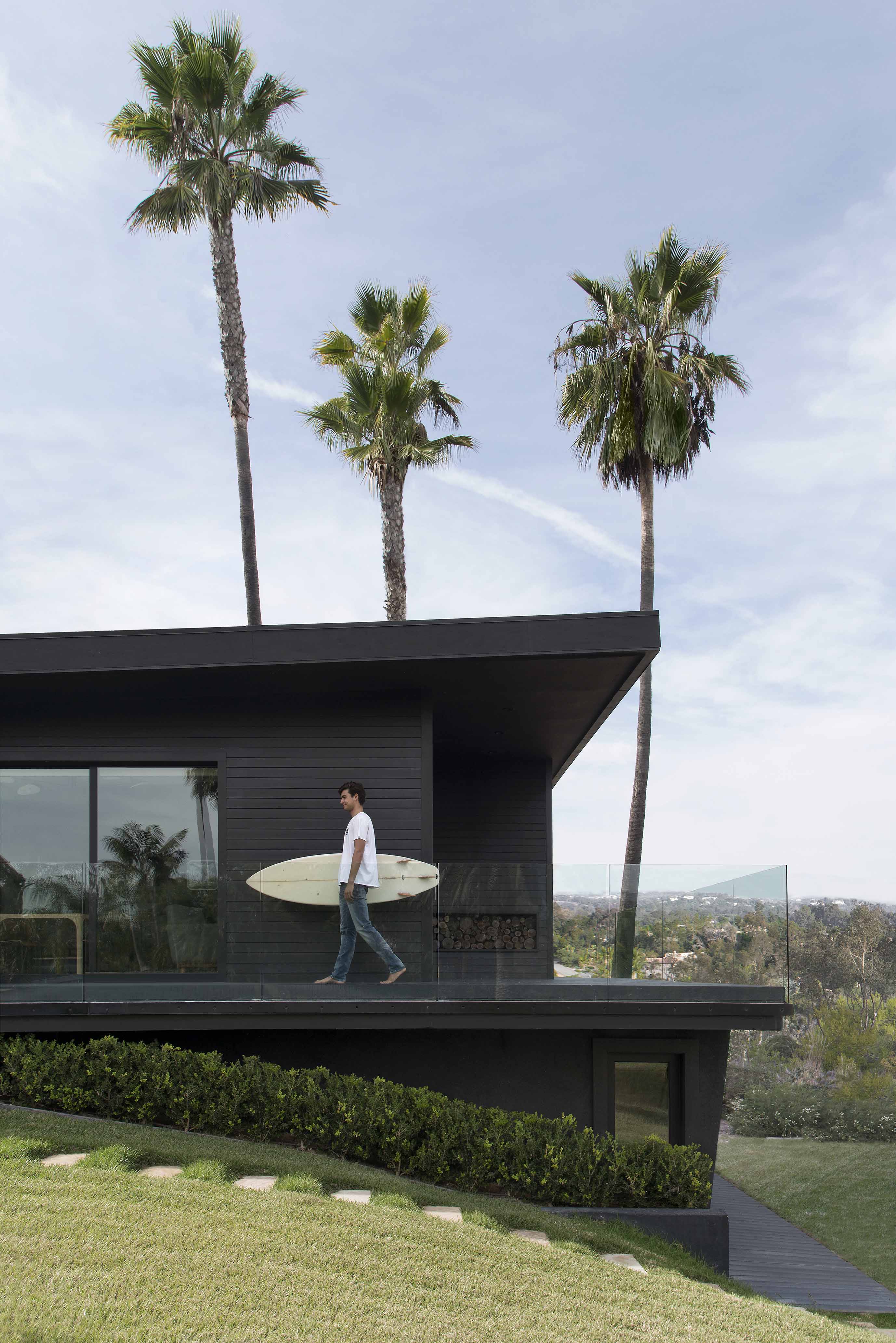 Once the main house in the Rancho Santa Fe area in San Diego was redeveloped [see House in San Diego], the owners commissioned the Studio to design and oversee the construction of an adjoining building that could house family guests. Following the style of Richard Neutra and the architecture prevalent in California in the 50’s with its traditional siding, the aim was to open the construction towards the valley to enhance the views which were already striking. The house is equipped with everything the family and their guests need to ensure a pleasurable stay at the residence, enjoying the proximity between the owners and their guests but with enough independence for everyone as well. As a result, there is a family room with an integrated kitchen, two bedrooms – each with its own bathroom - and an outdoor bathroom which is for ideal use when returning from a surfing expedition or a beach outing. Everything interacts with the galleries, the deck and the swimming pool at the main house. The matte black color on the exterior grants the house its own identity, allowing a full integration into the landscape with absolute ease.
