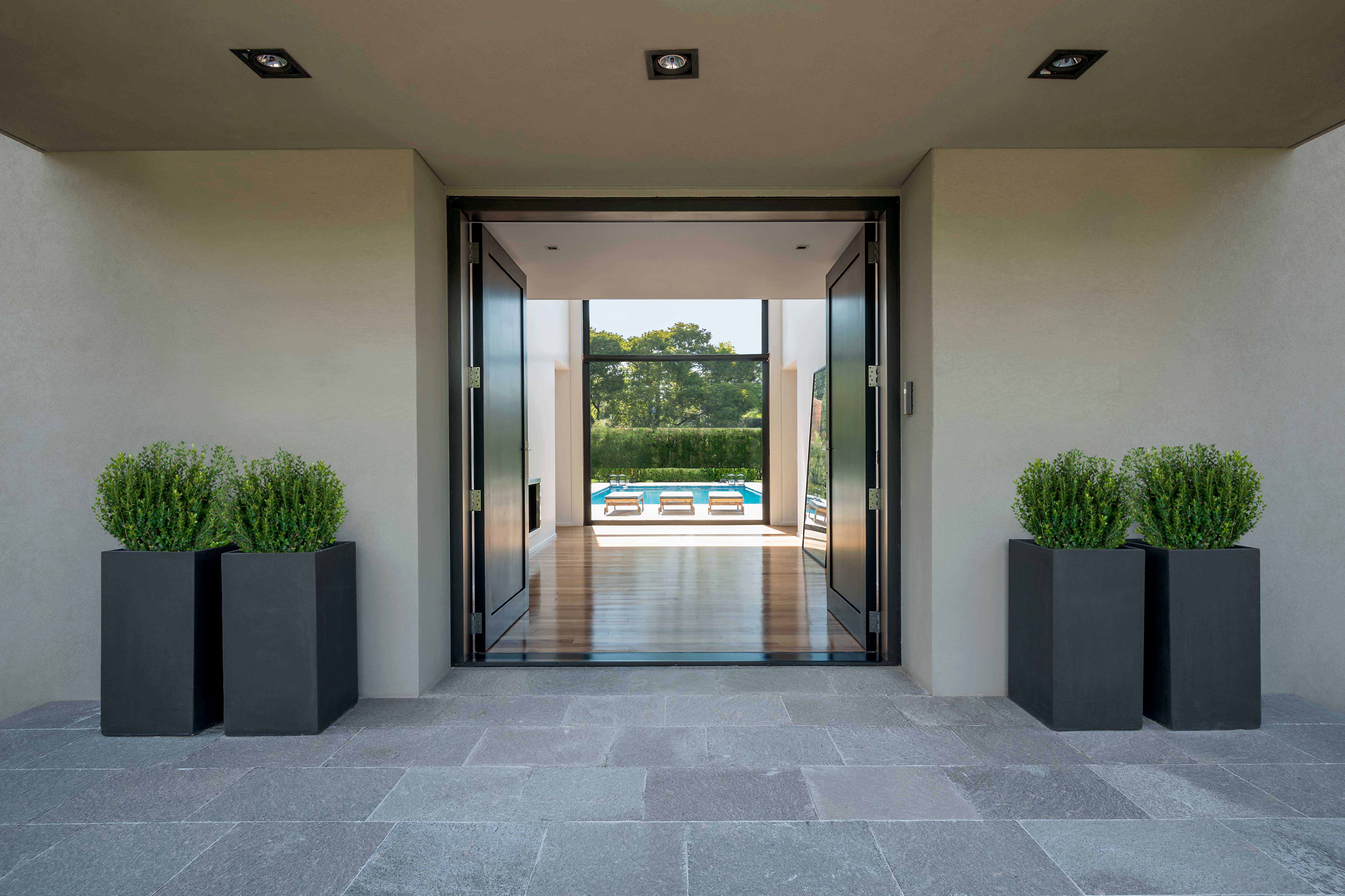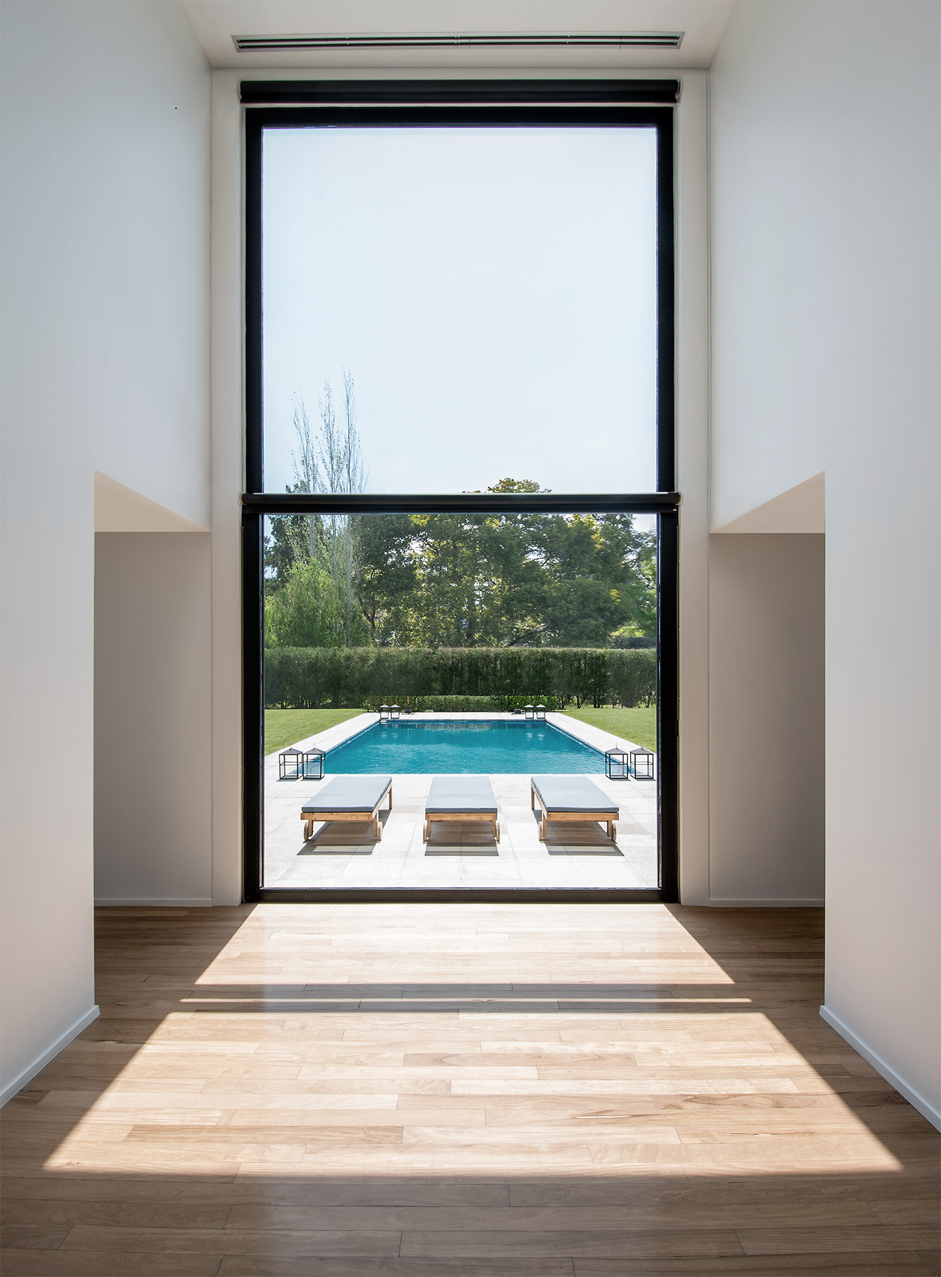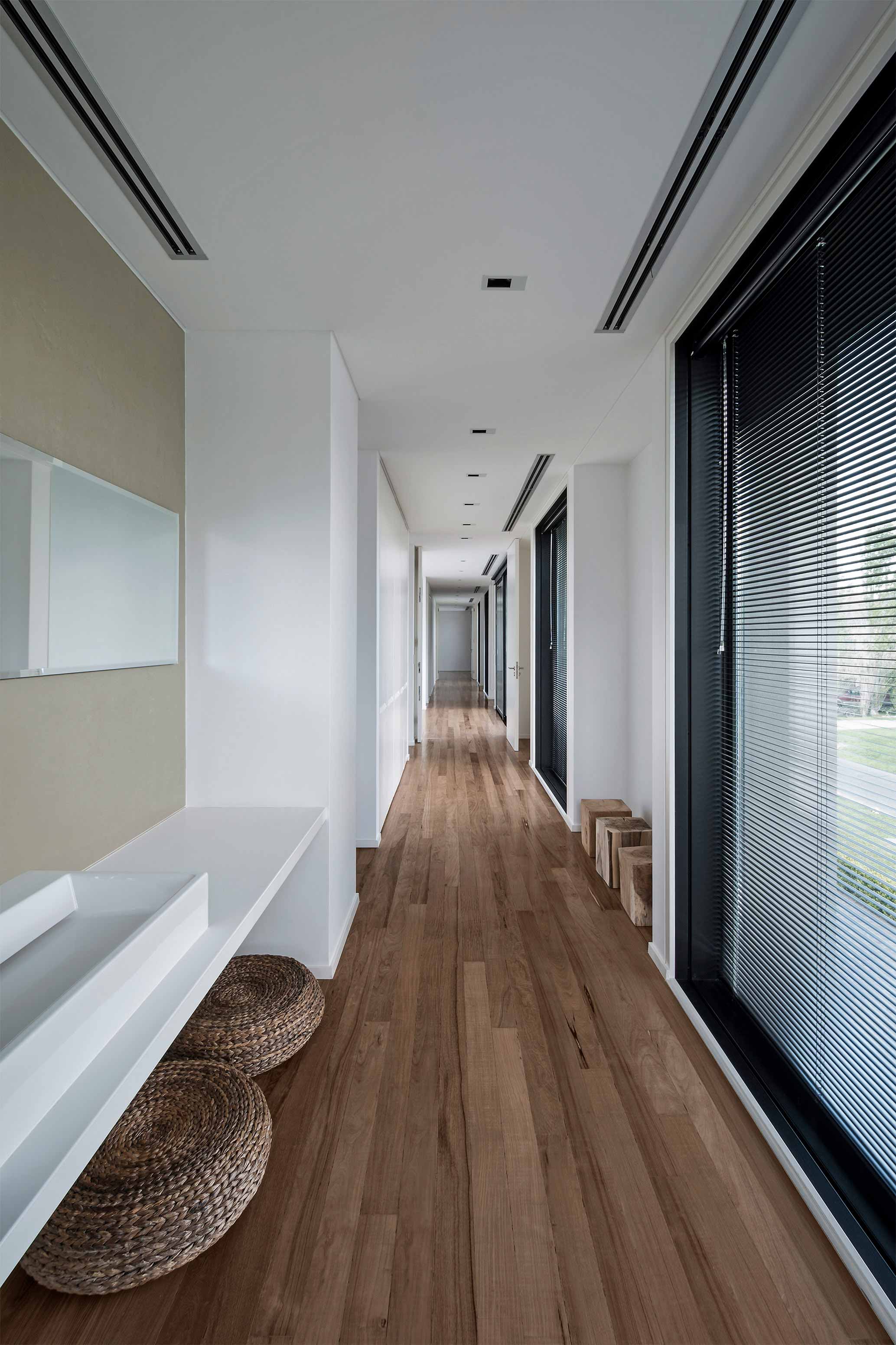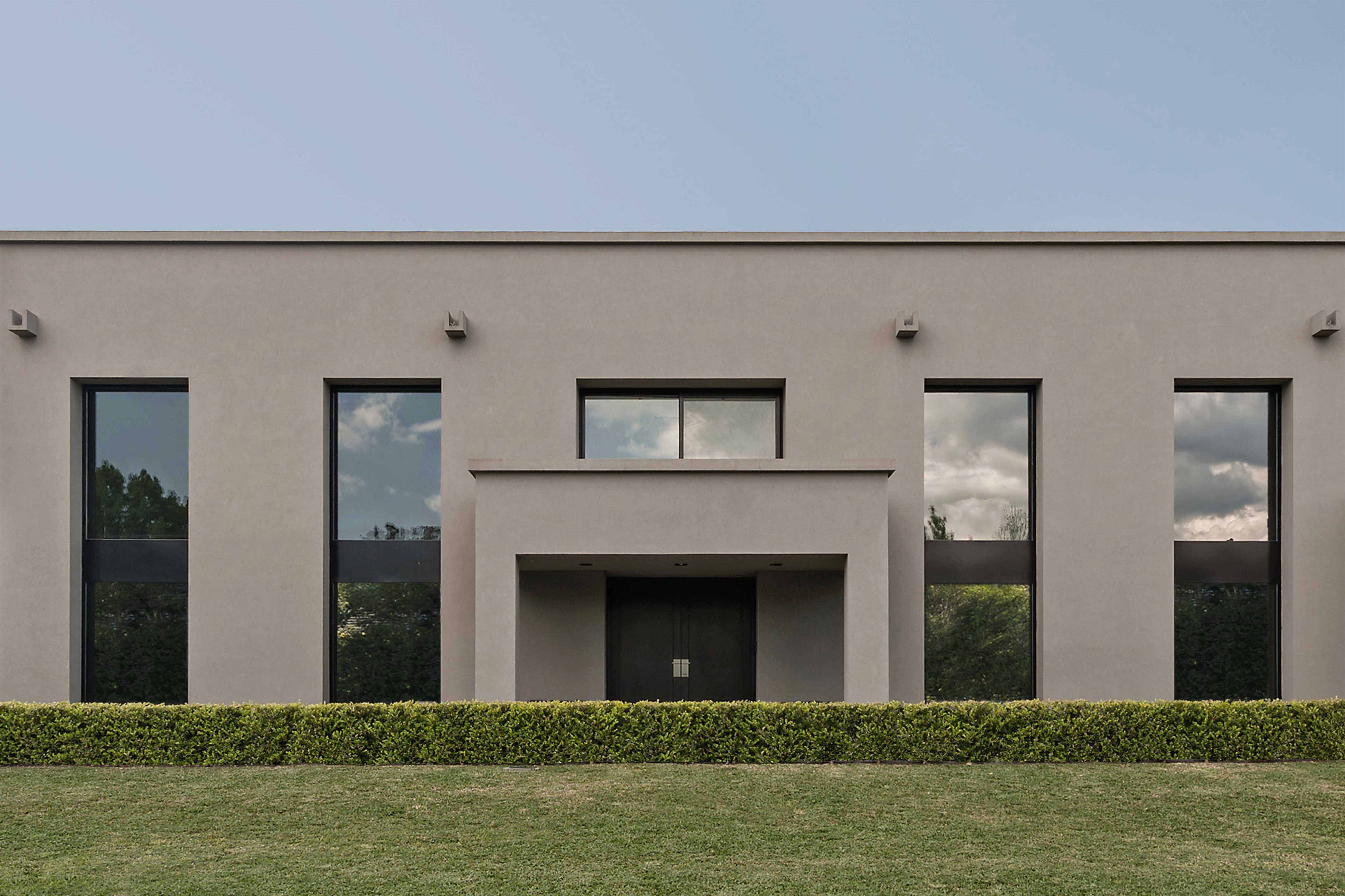 Located on two lots, this house sprawls over the width of the site, making the best of the garden’s ample measurements in the back. The layout is symmetrical, consisting of two galleries between which a double story area offers the benefit of extending out into the outdoors through a prominent opening with a guillotine system, which in turn leads out to the swimming pool, strategically located on the central axis. Designed to fit the needs of a married couple with two daughters, the ground floor is dedicated to leisure and entertainment, though it also includes a more intimate living room. The private spaces are distributed on the first floor; a spacious hallway extends from one extreme to the other, with windows towards the front. Three master suites, followed by the study and a home theater, all have a view to the garden. The interiors are simple, unornamented, and white to amplify the effects of light. The floors are made of incense wood. While the back of the building is extremely open to the outside, the size of the openings in front has been reduced, resorting to black venetian-type blinds which filter viewing and protect privacy. A single color was chosen for exteriors: texturized wall coverings within a gray palette. All of the black carpentry was custom made. As for the flooring inside the galleries and the swimming pool area, large thermally insulated ceramic tiles were utilized, also within a gray scale. For the front, the chosen type of flooring was Pórfido Patagónico stone.