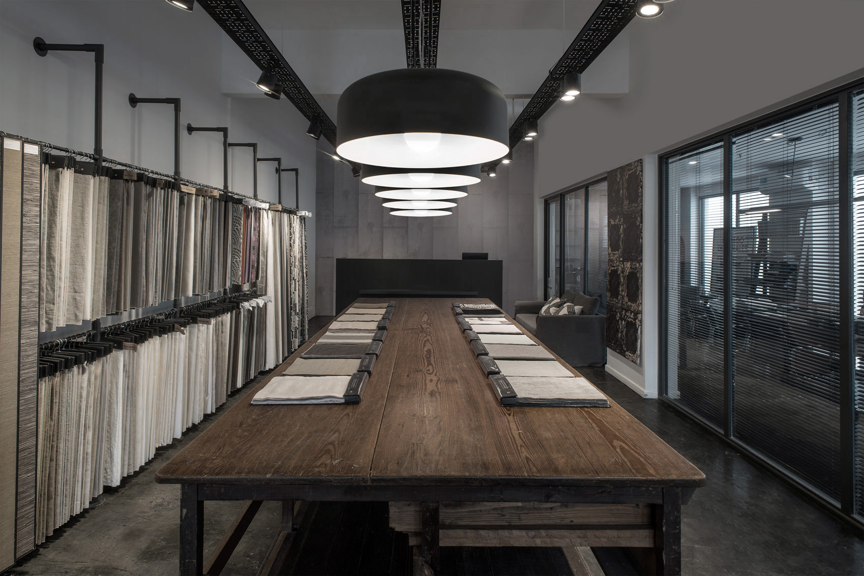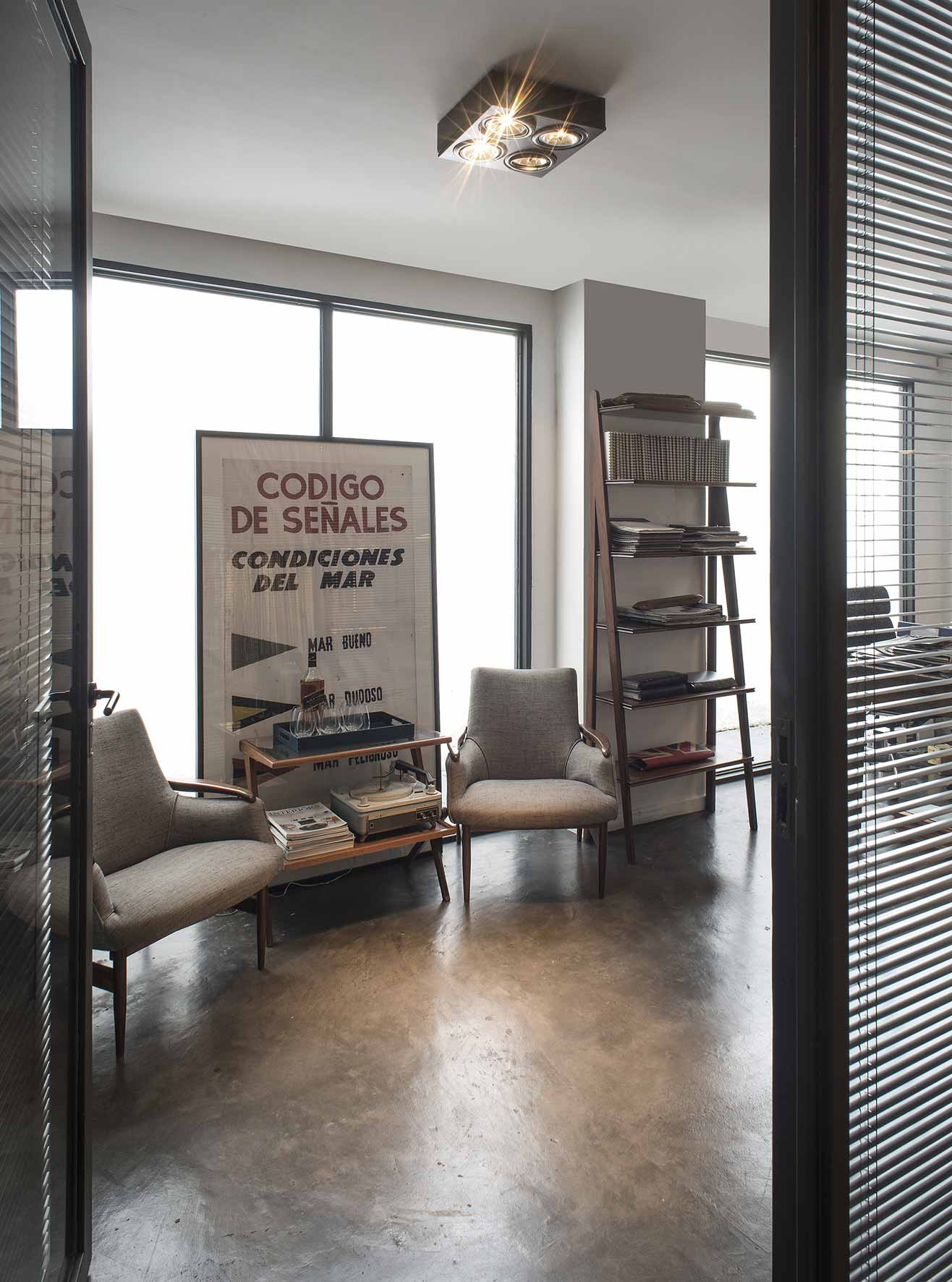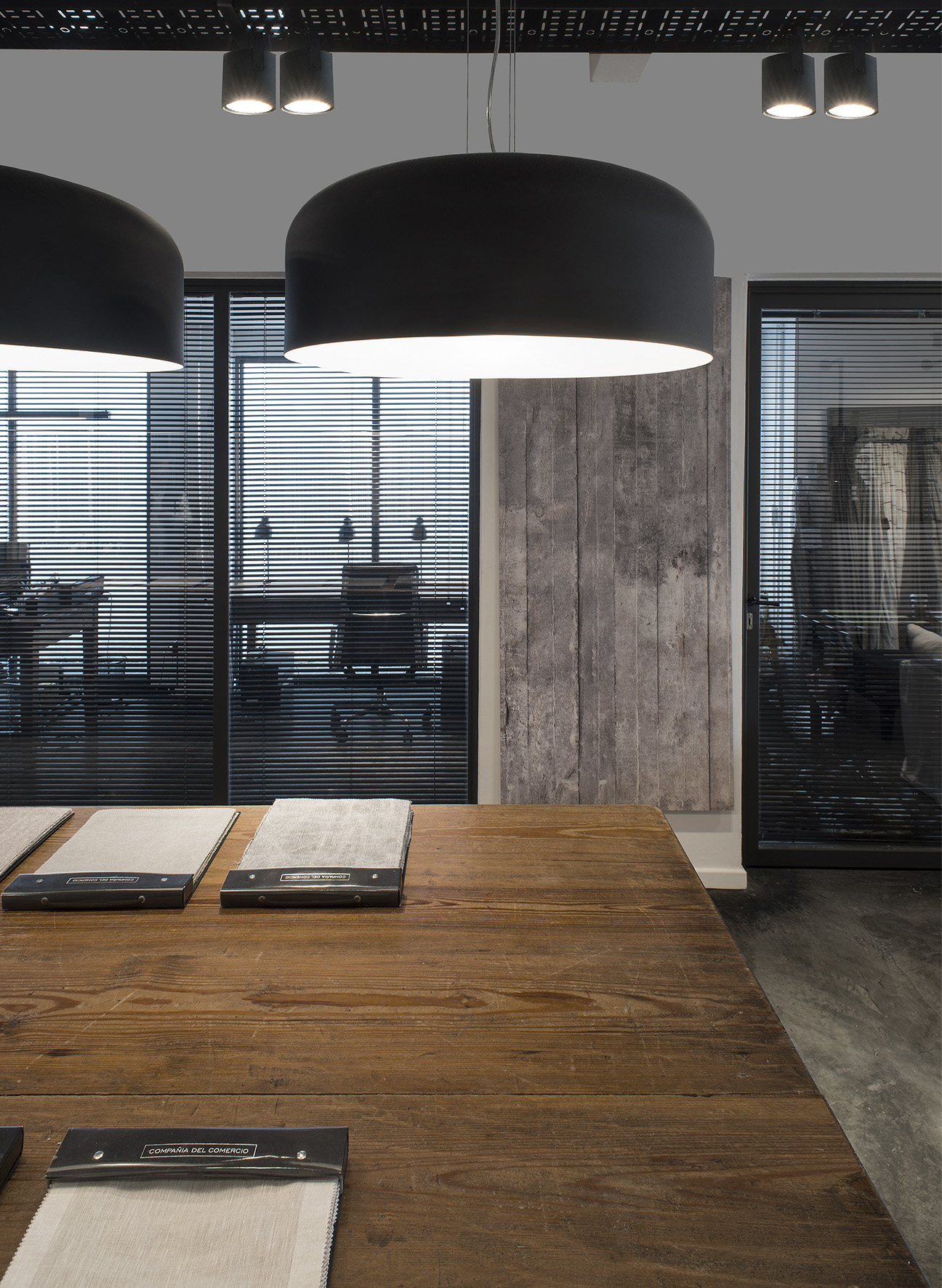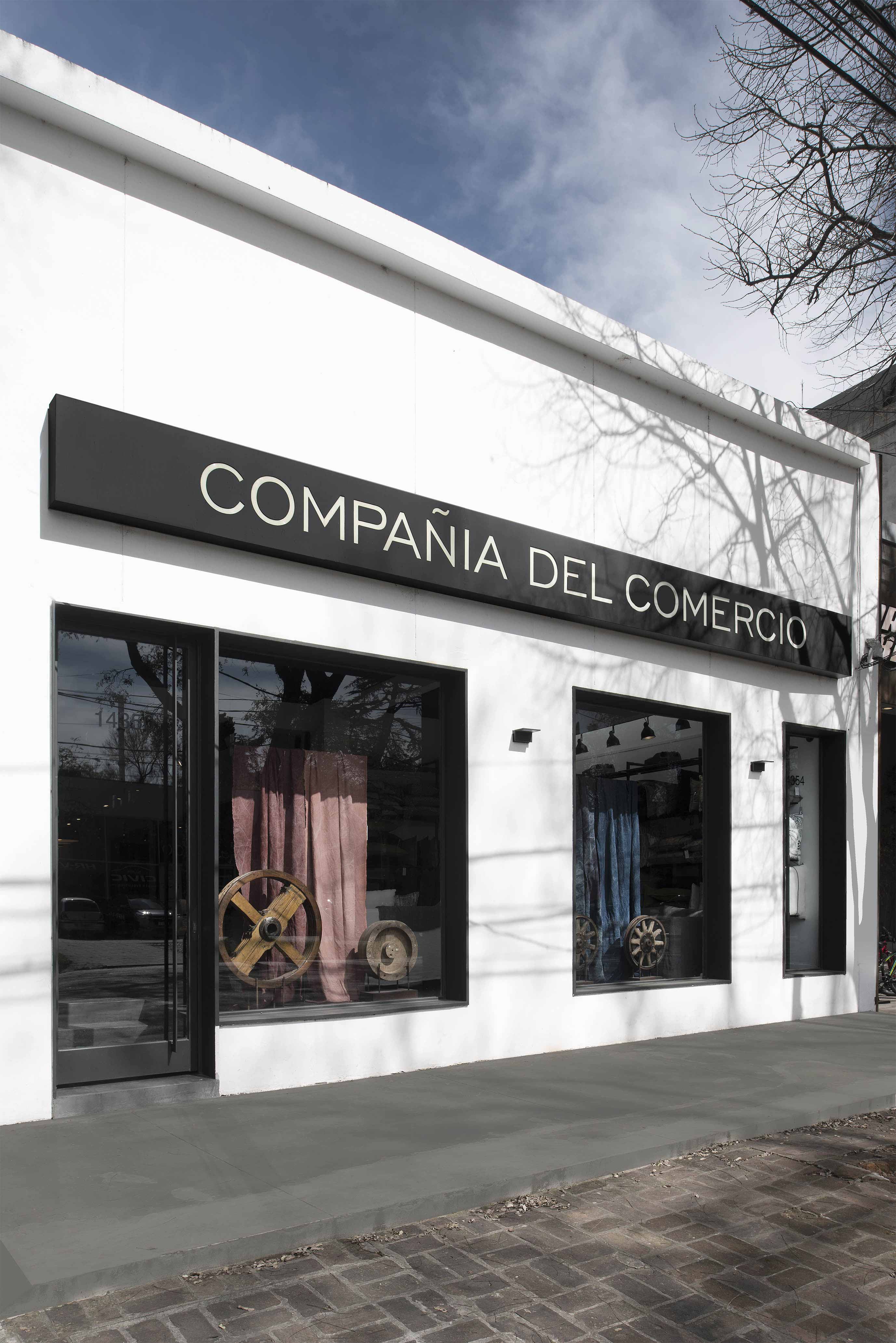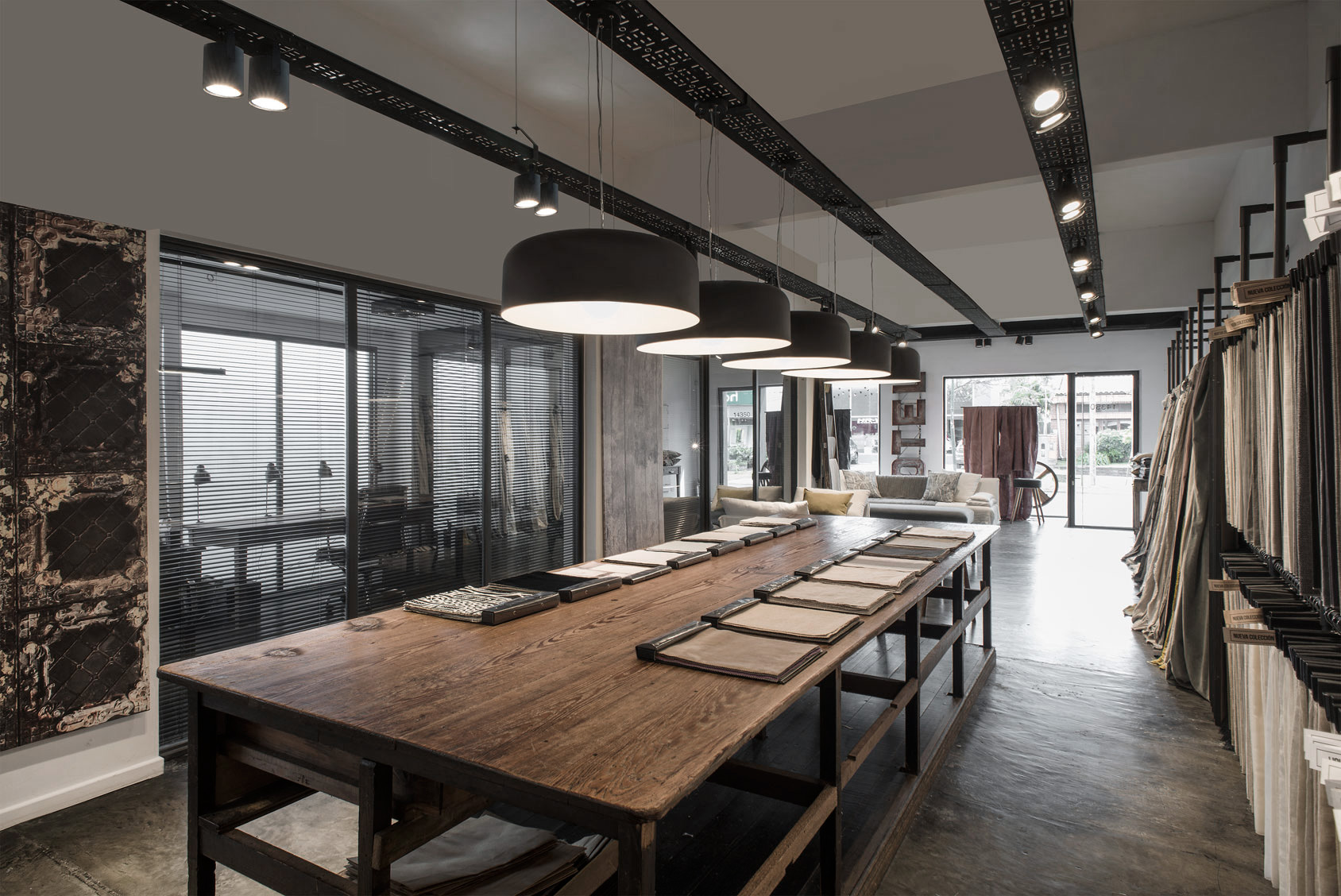 The firm also has a store in Martínez, a pleasant corner in Zona Norte, situated in a typically elongated, early XXth century house which had already been reconditioned to be apt for its previous role: an art gallery. The Studio eliminated ceilings to get to the original roof which is supported by a wooden beam structure. Considering large windows were needed for the storefront display, all carpentry was custom made and painted black in contrast with the immaculate white box. The existing smooth cement floors were restored. Products are displayed through a system generated for all the company stores: modules that can be configured as racks, panels or shelves, comprising a very flexible and innovative way to showcase fabrics and paper. A huge, antique table – which originally belonged to the historical company office – was brought in to supply the testimonial vintage touch.