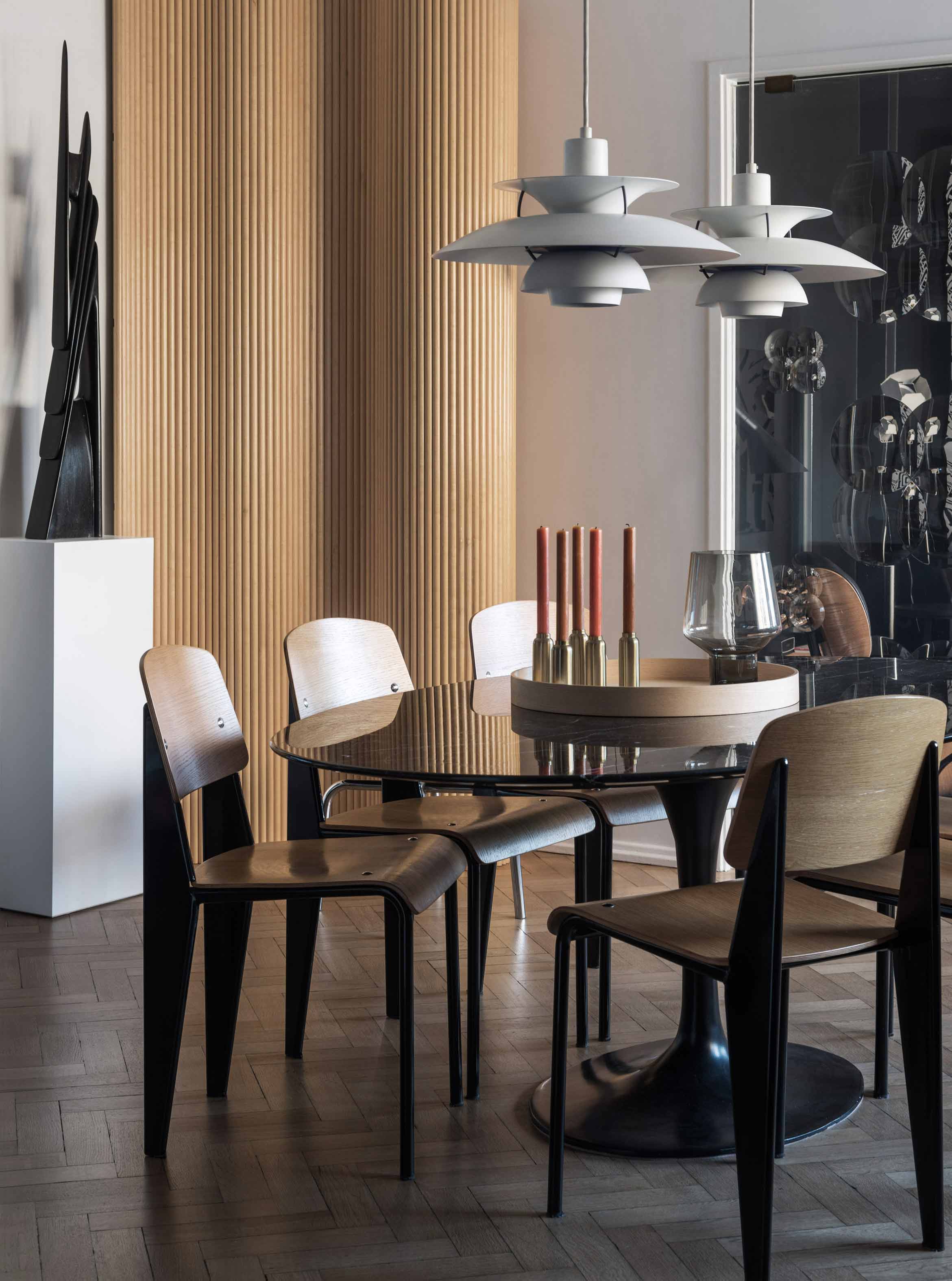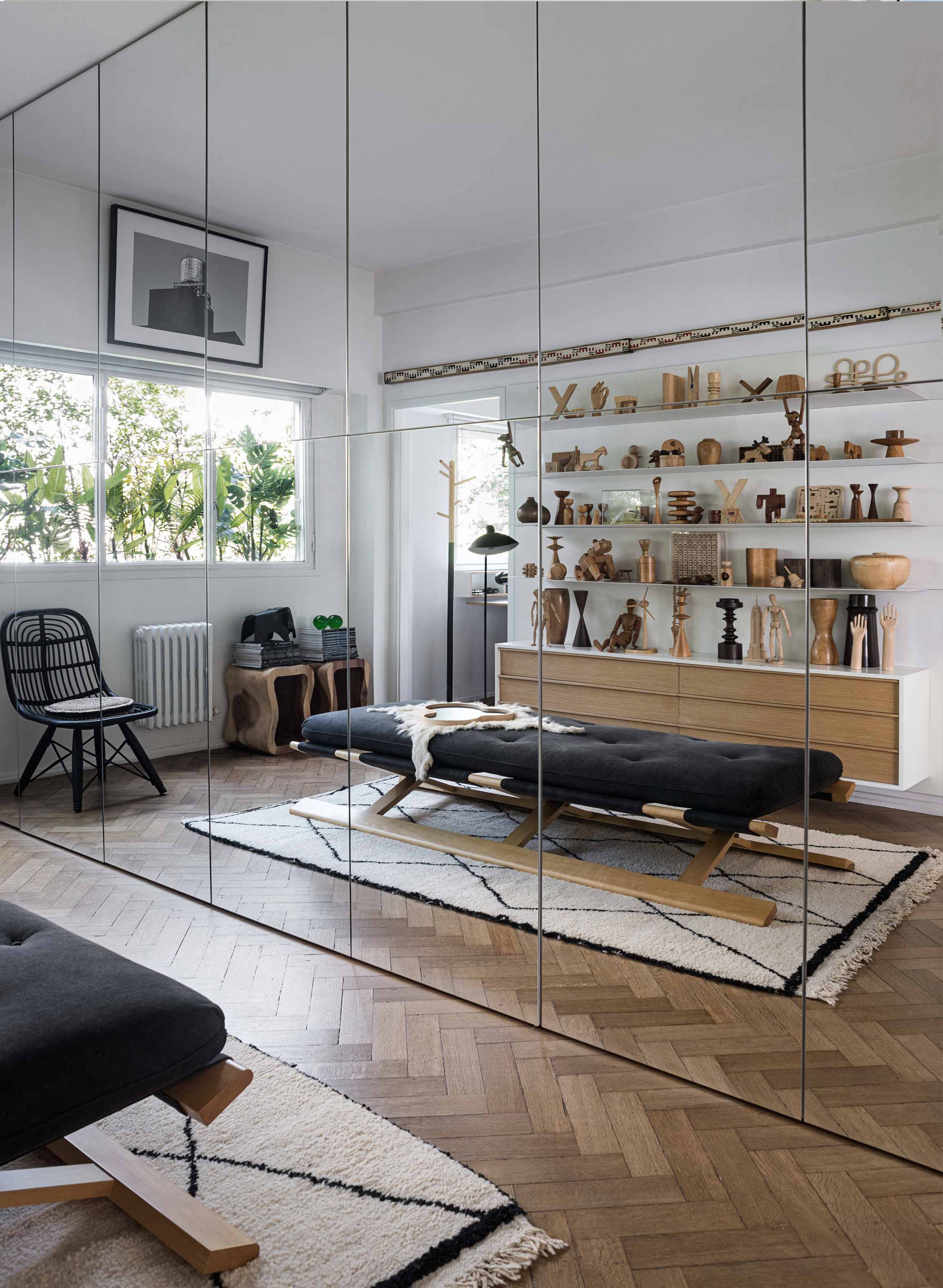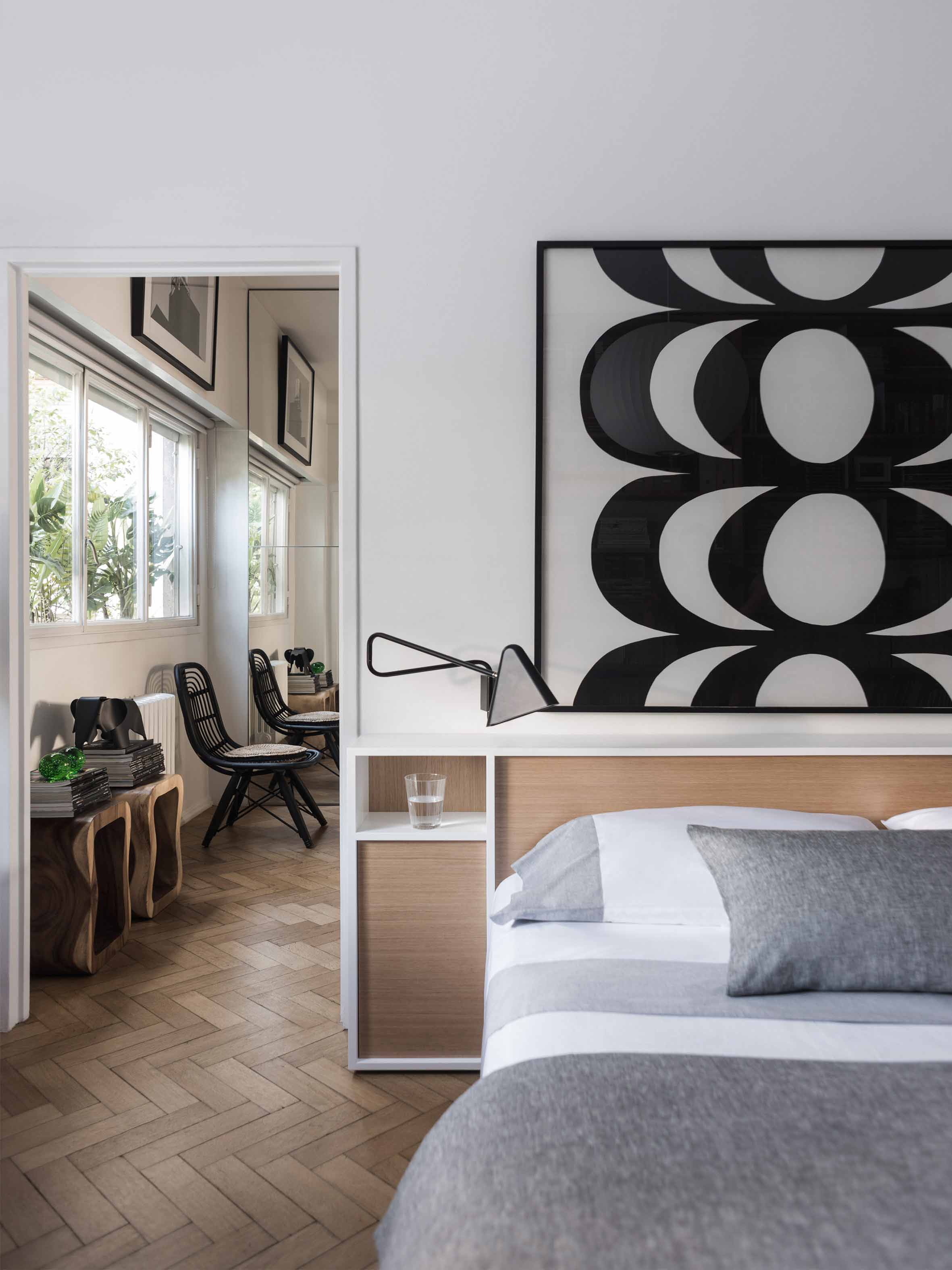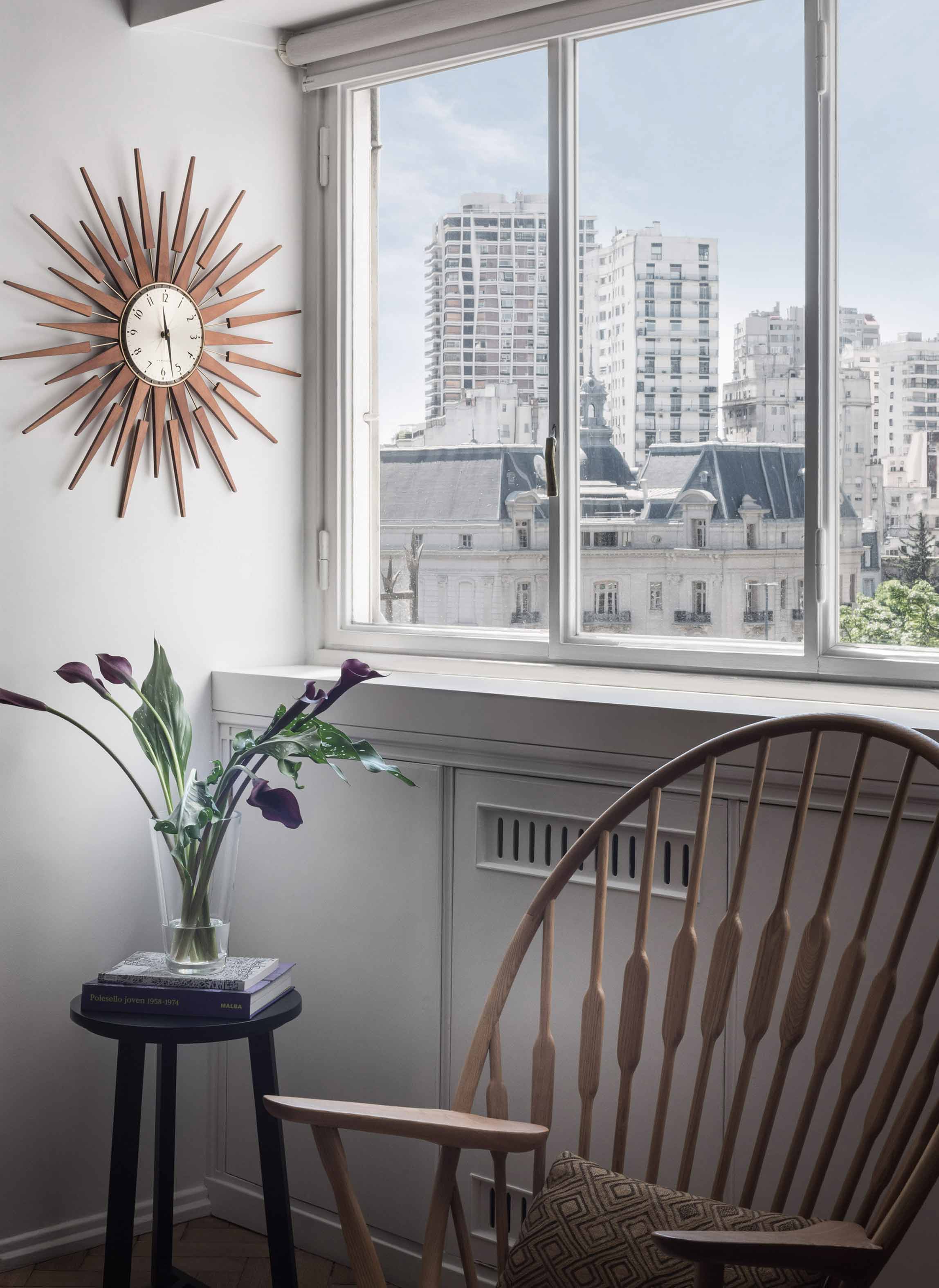 The apartment is located in a building with a twin construction: they both share the same façade and are a clear exponent of the rationalist architecture that was prevalent in Buenos Aires in the 50’s and which is quite typical of the Retiro neighborhood in particular. These origins were taken into account for the renewal of the apartment. The owner was particularly drawn to the layout of this apartment since it offered an unusual, free-flowing visual continuity. Indeed, this unit is part of an open layout with few obstructions and offers attractive views both at the front and in the back. This sense of continuity, enhanced by the uniformity of the Slavonian oak floors, was absolutely respected and actually reinforced. The original openings were restored for conservation. A careful interior design plan was carried out with custom equipment for each room that would also hold the owner’s object and art collections. Furniture, lamps and different components from prestigious houses such as Louis Poulsen, Jean Prouvé, Arne Jacobsen, Serge Mouille, Eero Saarinen, Charles Eames, Achille Castiglioni, Vico Magistretti and Hans Wegner took their places in the home. As well as the works of Pablo Siquier, photography by Claude Azoulay and two spectacular acrylic pieces by Rogelio Polesello: one placed in a strategic spot to provide a virtual separation between the living room and the dining room, whereas the other piece welcomes guests arriving at the reception hall. To honor certain parts of a specific piece of art, some walls were painted black. Striving to enhance the free flow between all spaces was key when choosing furniture which had to guarantee that moving around them would be a breeze. Two openings connect the master suite to another space which combines both a dressing room -with mirrored doors- with a reading and relaxation spot. All bathrooms were integrally redone with materials and accessories that flow with the style of the original construction. The kitchen was made newly functional by keeping the original furniture while adapting everything to new uses, white coverings were added to the walls made of vertical wood panels. Brand new flooring, faucets and kitchen counter were installed. In spite of these innovations and the tidy look they provide, there is a predominantly traditional feeling in the kitchen thanks to the old fashioned furniture which leave plates, glasses, and a series of elements in full view. Just like in all rooms in this apartment, good design is ever present.