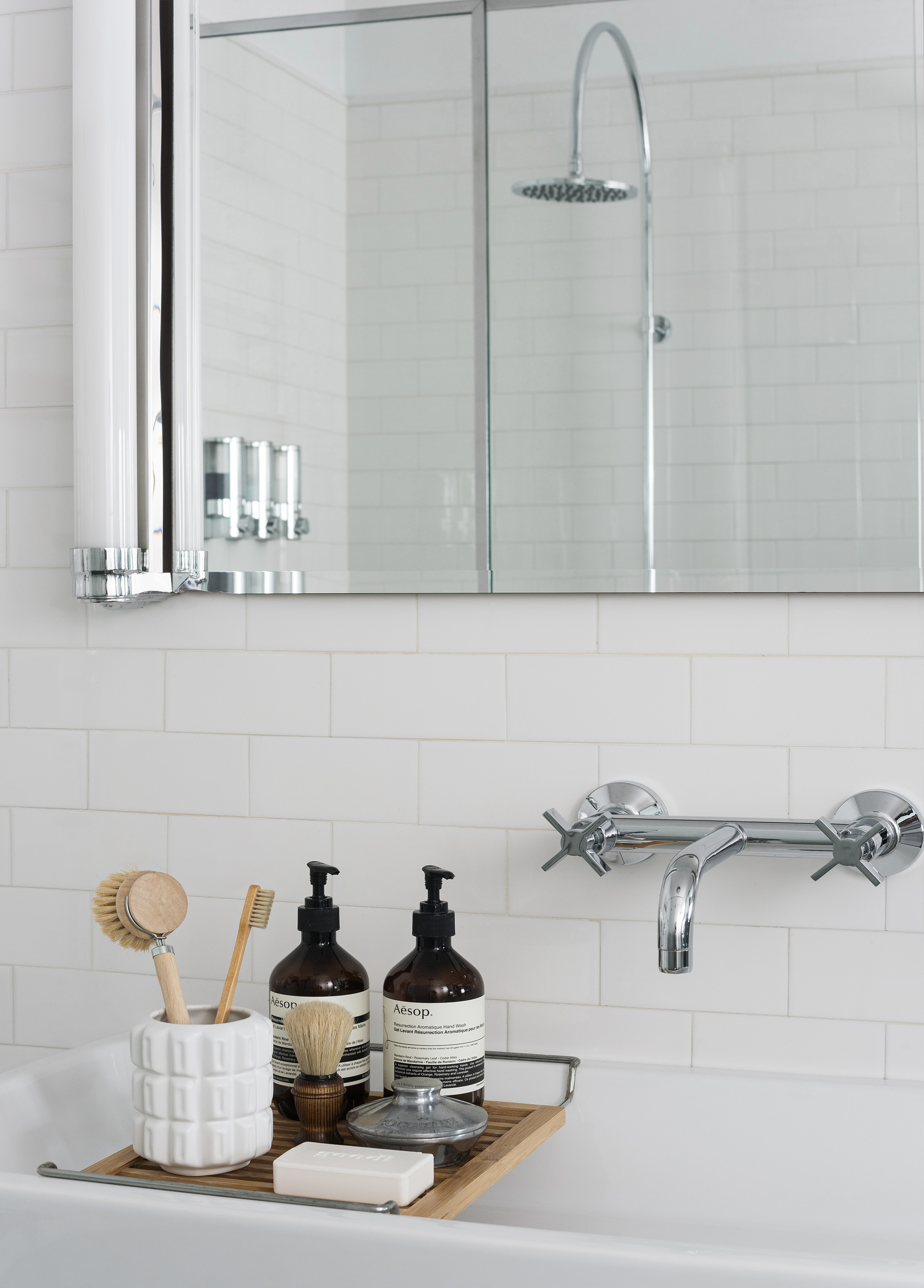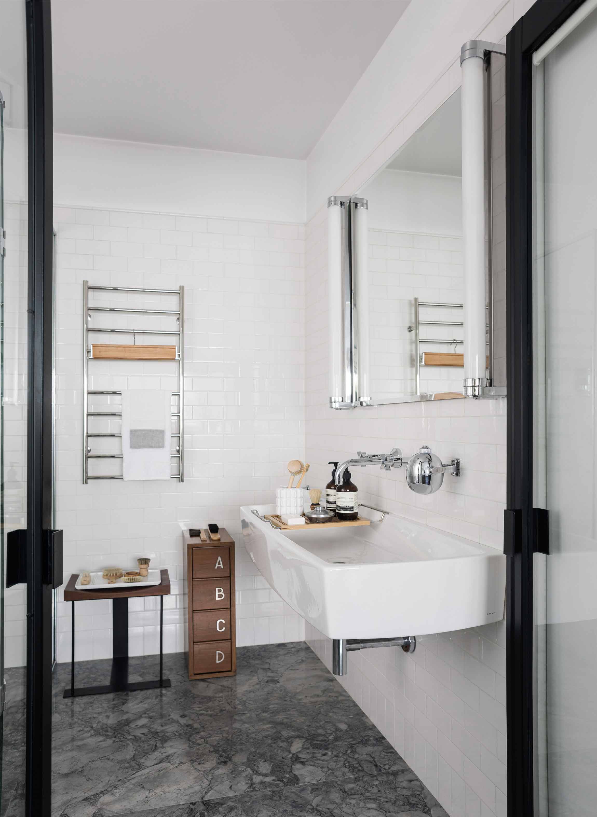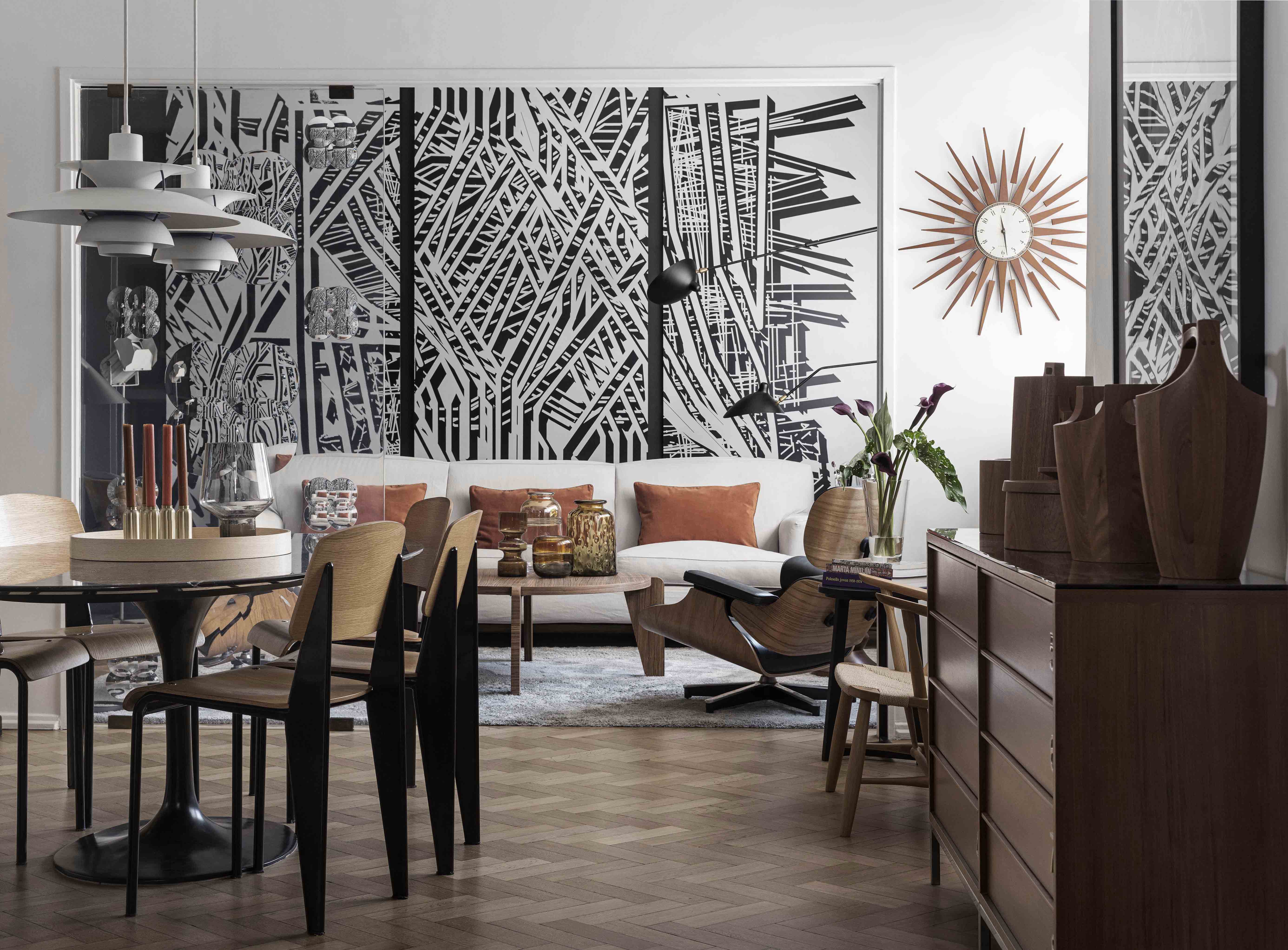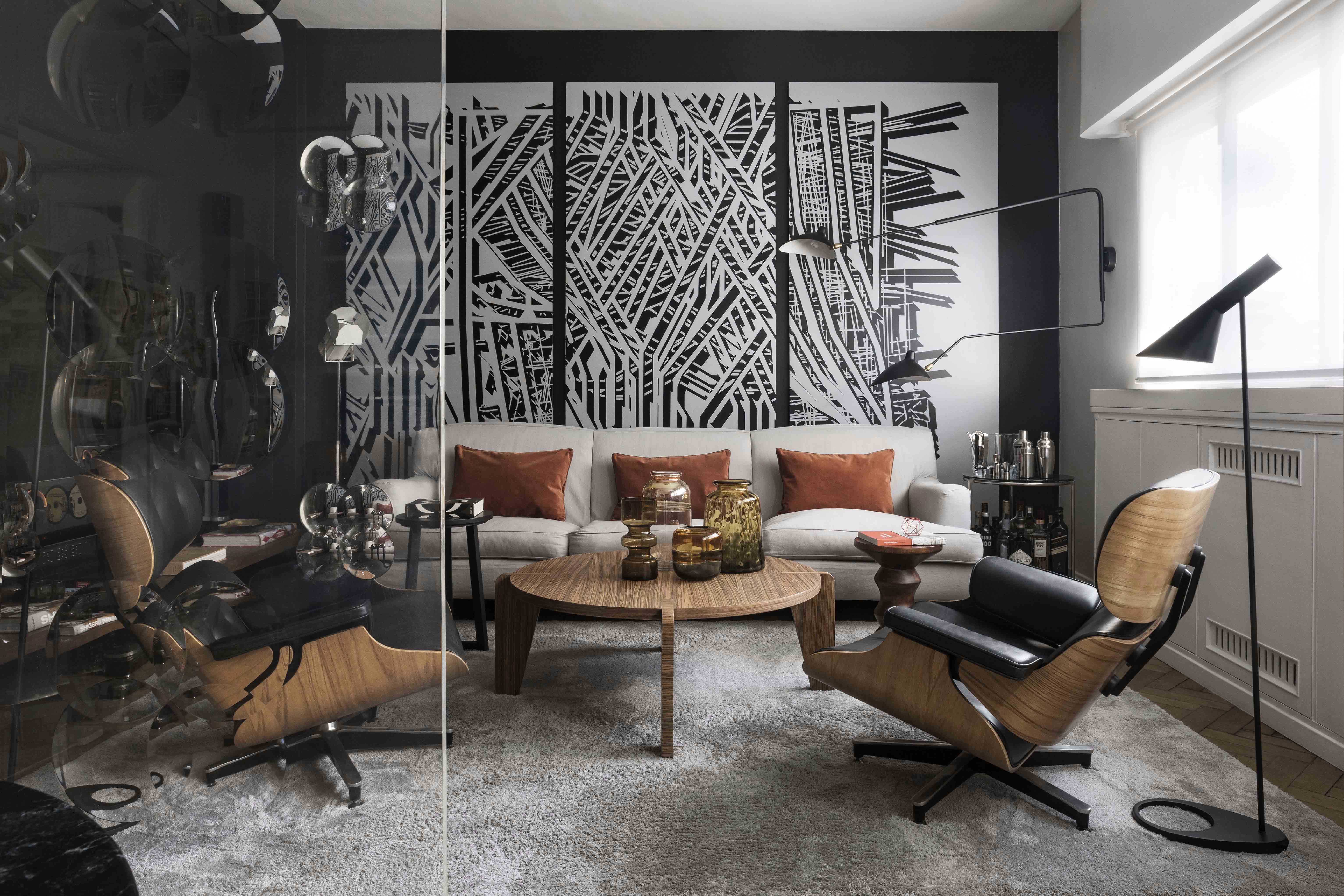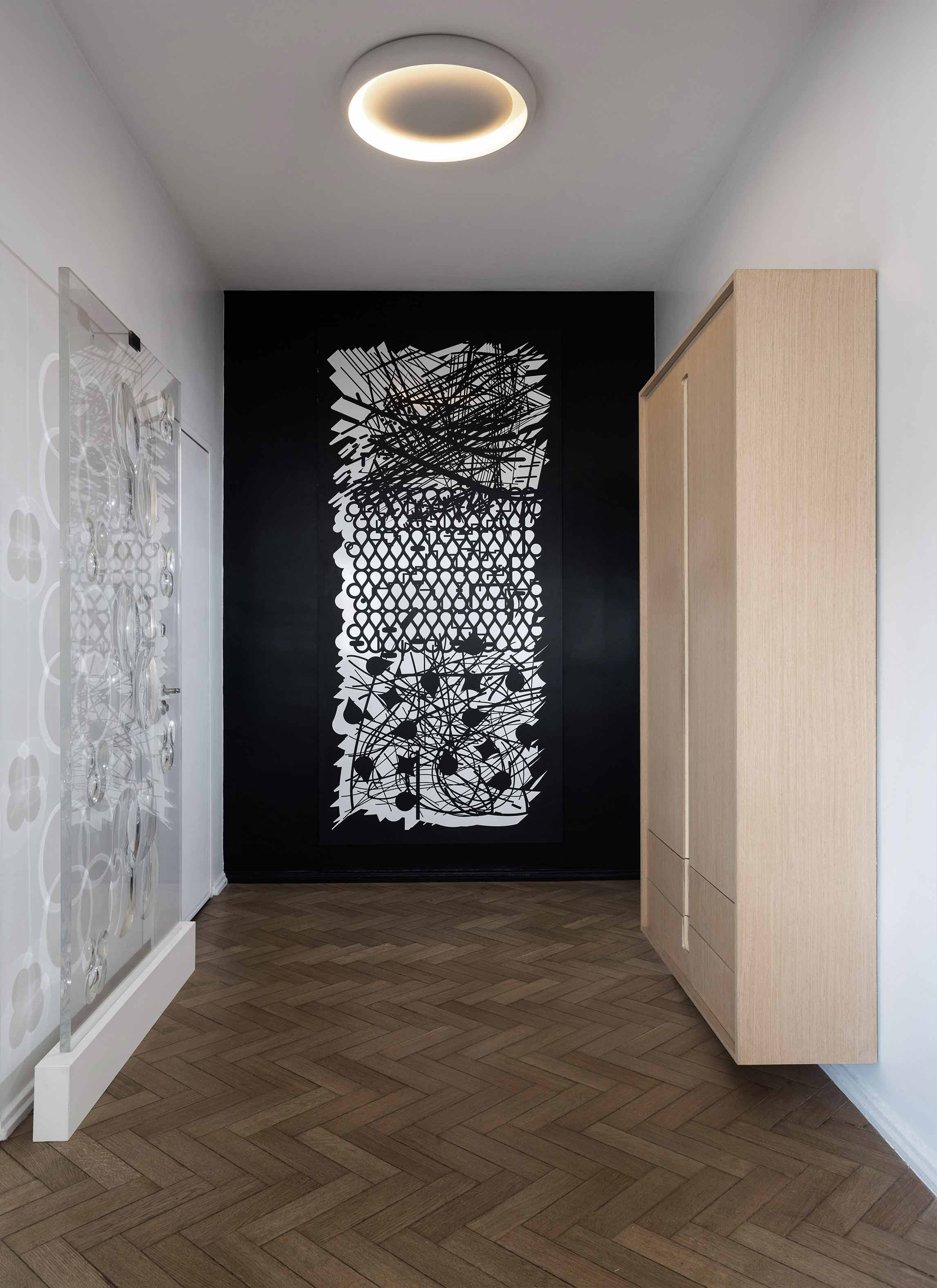 The apartment is located in a building with a twin construction: they both share the same façade and are a clear exponent of the rationalist architecture that was prevalent in Buenos Aires in the 50’s and which is quite typical of the Retiro neighborhood in particular. These origins were taken into account for the renewal of the apartment. The owner was particularly drawn to the layout of this apartment since it offered an unusual, free-flowing visual continuity. Indeed, this unit is part of an open layout with few obstructions and offers attractive views both at the front and in the back. This sense of continuity, enhanced by the uniformity of the Slavonian oak floors, was absolutely respected and actually reinforced. The original openings were restored for conservation. A careful interior design plan was carried out with custom equipment for each room that would also hold the owner’s object and art collections. Furniture, lamps and different components from prestigious houses such as Louis Poulsen, Jean Prouvé, Arne Jacobsen, Serge Mouille, Eero Saarinen, Charles Eames, Achille Castiglioni, Vico Magistretti and Hans Wegner took their places in the home. As well as the works of Pablo Siquier, photography by Claude Azoulay and two spectacular acrylic pieces by Rogelio Polesello: one placed in a strategic spot to provide a virtual separation between the living room and the dining room, whereas the other piece welcomes guests arriving at the reception hall. To honor certain parts of a specific piece of art, some walls were painted black. Striving to enhance the free flow between all spaces was key when choosing furniture which had to guarantee that moving around them would be a breeze. Two openings connect the master suite to another space which combines both a dressing room -with mirrored doors- with a reading and relaxation spot. All bathrooms were integrally redone with materials and accessories that flow with the style of the original construction. The kitchen was made newly functional by keeping the original furniture while adapting everything to new uses, white coverings were added to the walls made of vertical wood panels. Brand new flooring, faucets and kitchen counter were installed. In spite of these innovations and the tidy look they provide, there is a predominantly traditional feeling in the kitchen thanks to the old fashioned furniture which leave plates, glasses, and a series of elements in full view. Just like in all rooms in this apartment, good design is ever present.