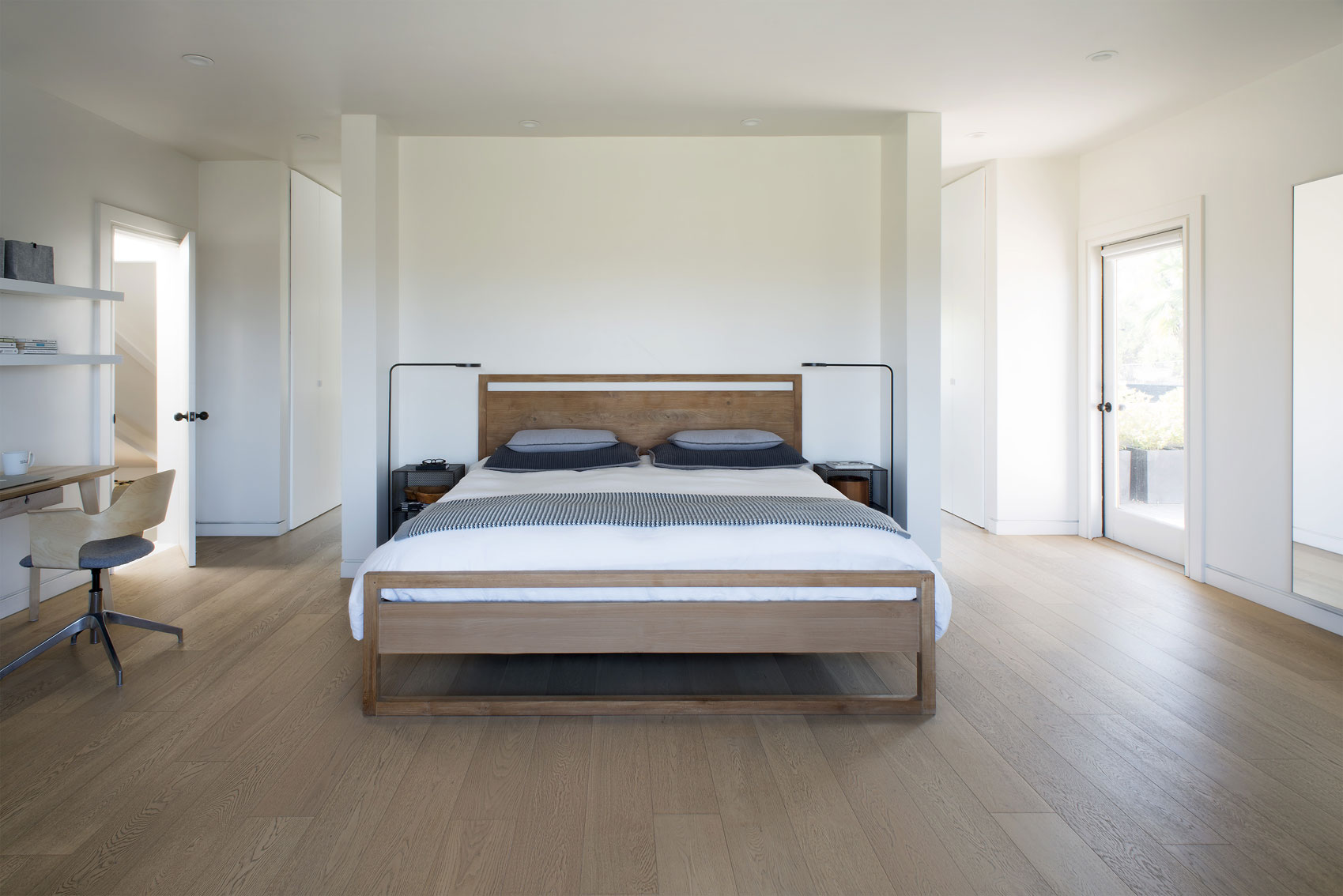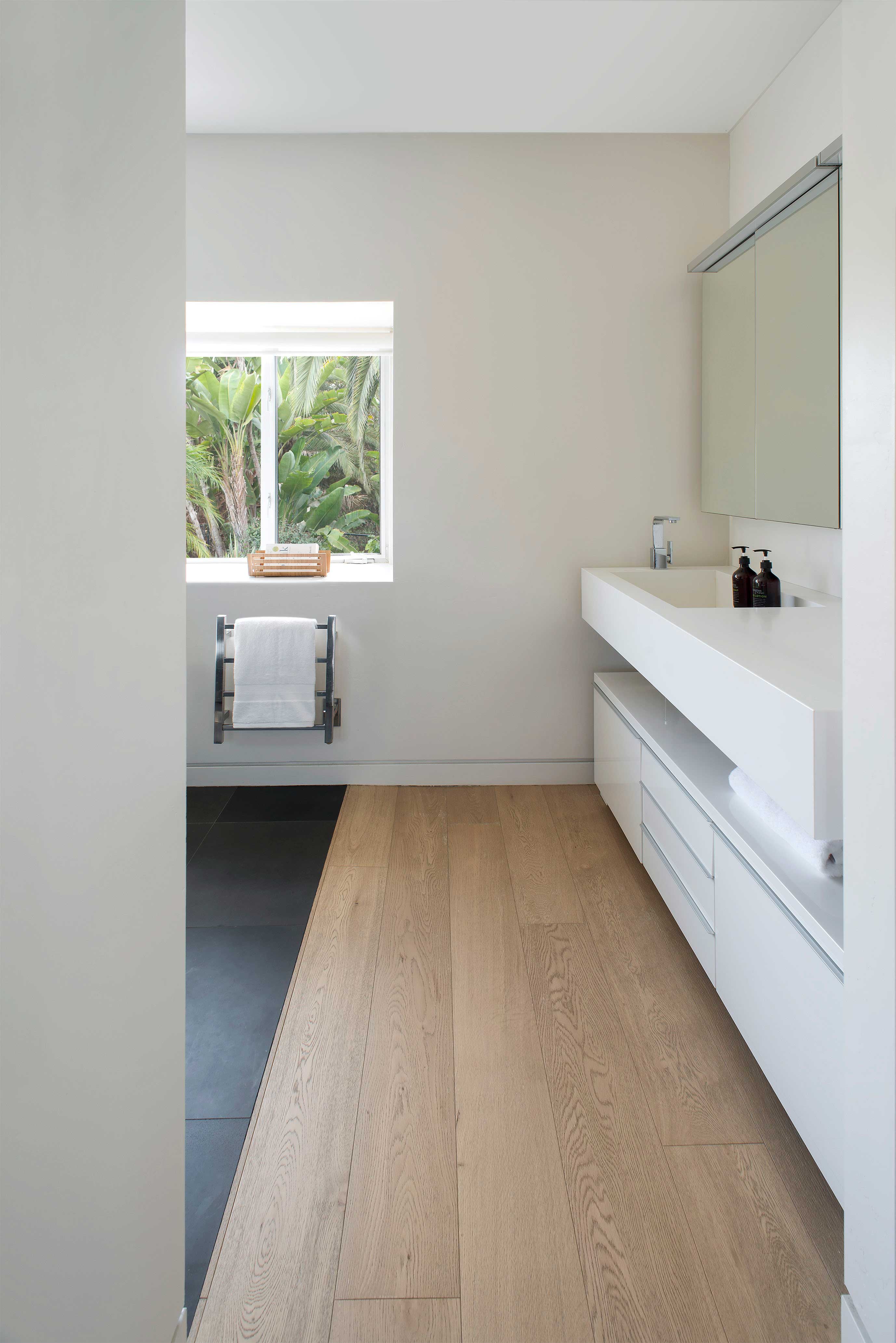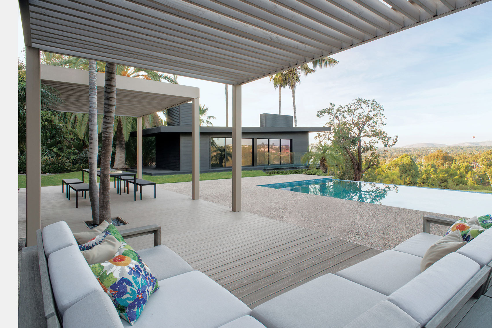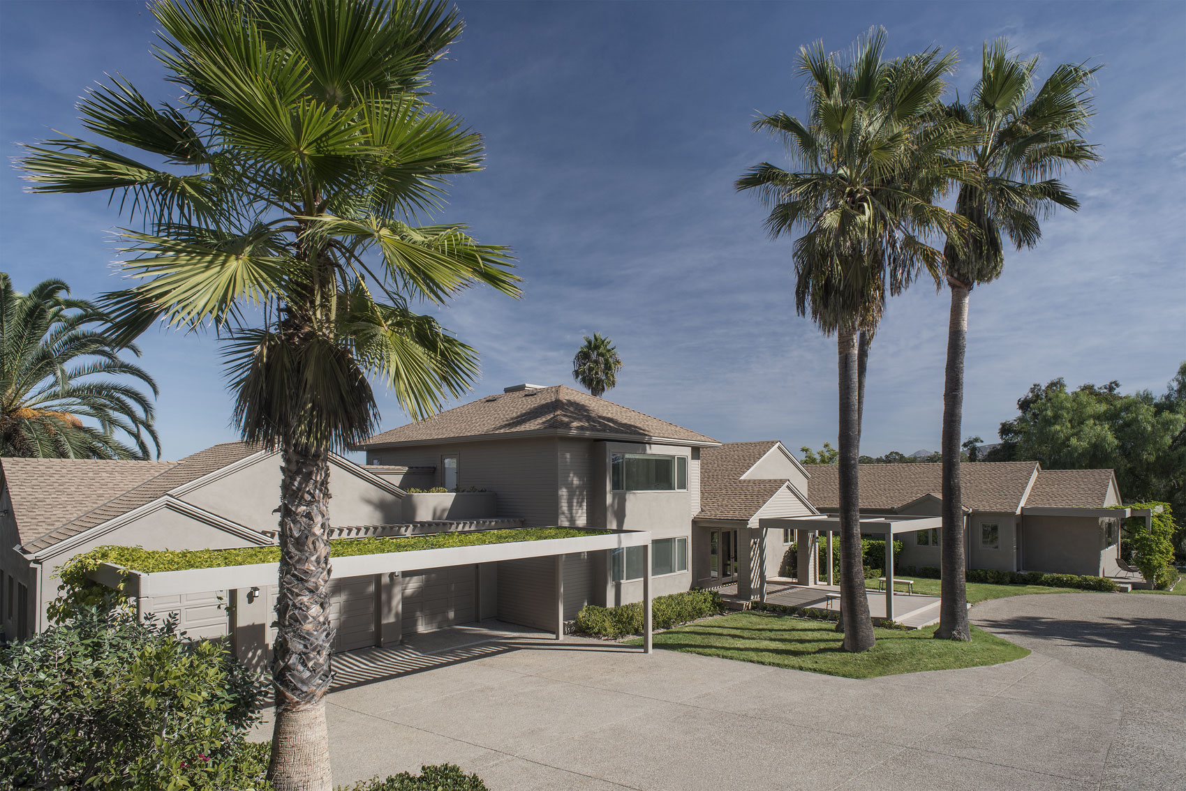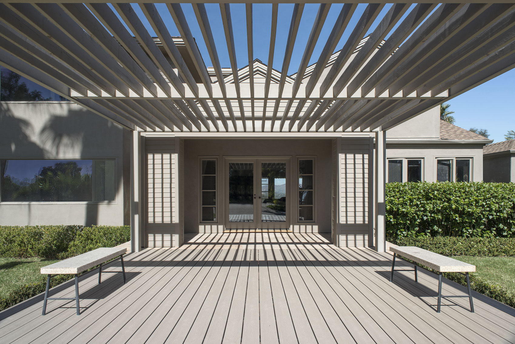 Whenever clients decide to work with the same architect on a new project, it’s always a wonderful satisfaction. This was the case with a couple living on one extreme of the continent who entrusted the creator of their previous home in Buenos Aires [see House in La Avenida - link] with the task of integrally refurbishing their new home on the West coast of the United States, doubling the delight of the architect, of course. The house is located on the outskirts of San Diego, California. Built on the typical US steel framing system, it consisted of one story that had undergone several changes and was showing signs - both in functionality and in appearance- that this home needed a drastic renovation in order to adapt it to its new owners. One of the crucial decisions was to build a top story to include both the master suite and a dressing room. Another option was to add a series of galleries that would ensure shaded areas, providing, as a consequence, a more dynamic façade. Besides the new roof with large eaves, the new design contemplated the creation of five wooden pergolas: at the garage entrance, at the main entrance, in the children’s bedroom area and the other two on the façade facing the valley. In this climate where it hardly ever rains, with ideal temperatures in every season, the result was the creation of numerous spaces for enjoying life outdoors, all year around. As an additional touch to the radical renovation of this home, instead of the once white exterior with light blue windows, the new external color of the house took on the hue of the pebbles found naturally in the local surroundings. Everything – walls, openings and pergolas – were painted in a sandy shade to harmonize with the landscape. Once the main house was restored, a second phase began: the guest house [see Guest House in San Diego].