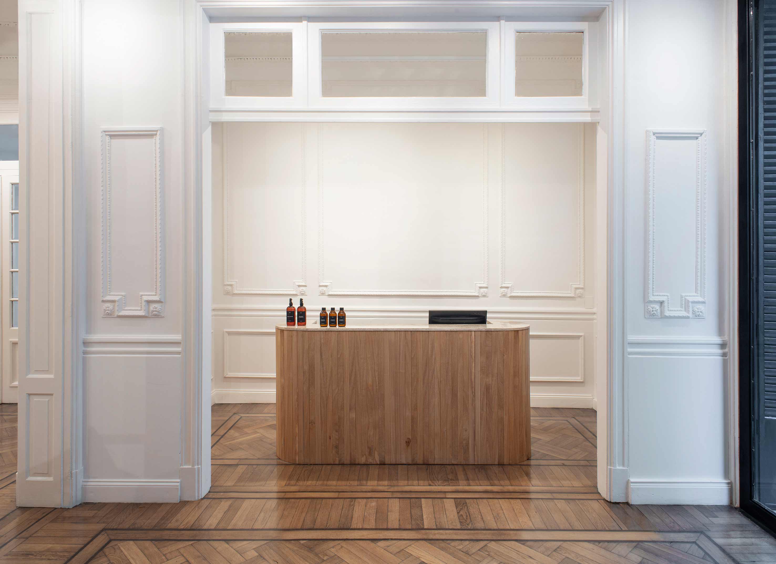 A rectangular module - with small wooden boards on the front- was designed for the customer area, with a marble countertop and rounded-off, circular corners. A table with the same marble top can be found at the center of one of the spaces. A couch with a retro design, coupled with a pair of Acento seagrass sofas, placed underneath a series of suspended lights, complete the feel of the general environment. Overall, the result is a very refined context which serves the purpose of highlighting the store’s unique brand.