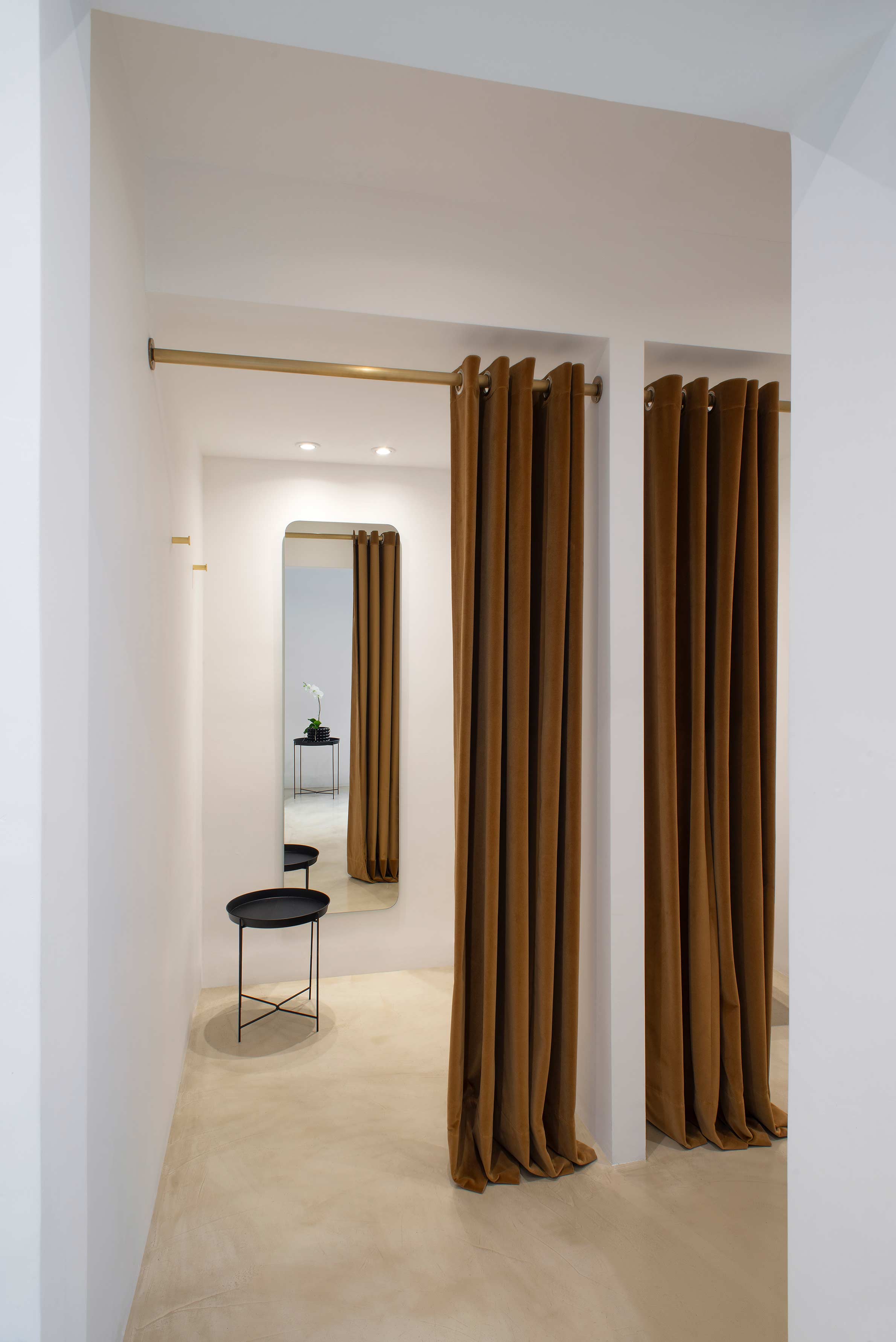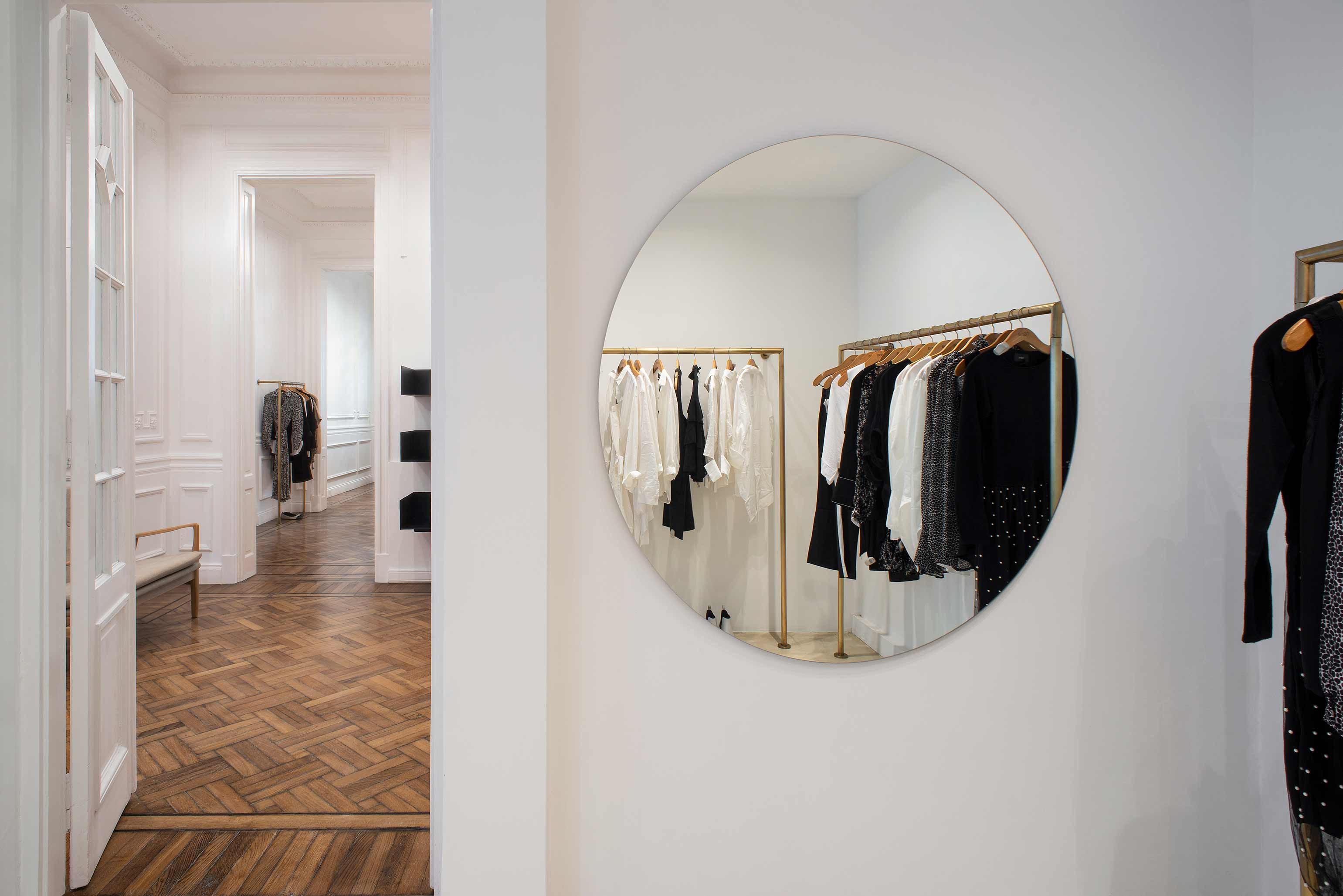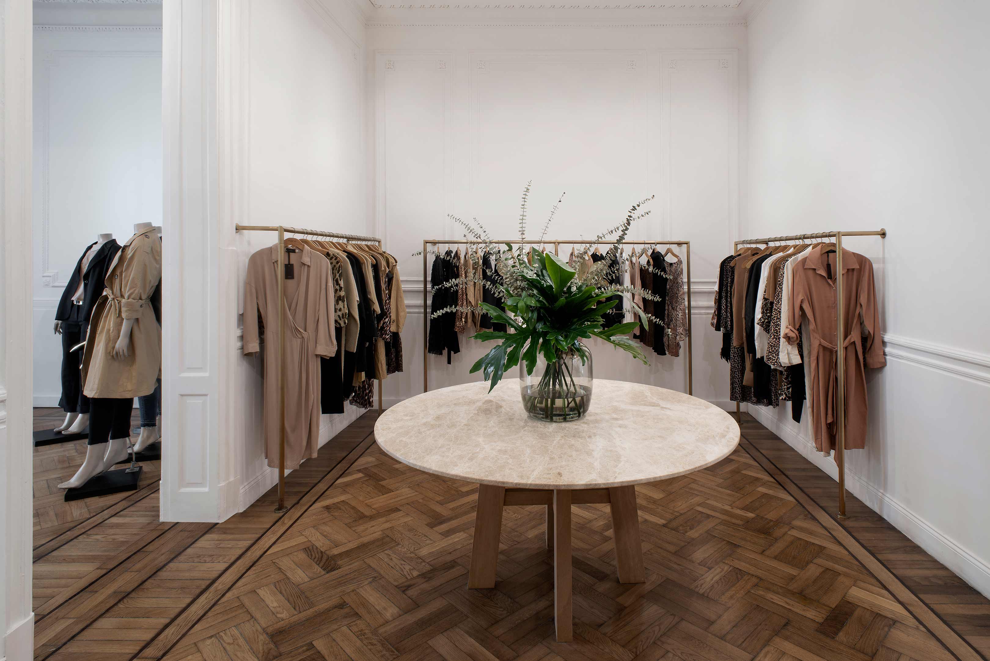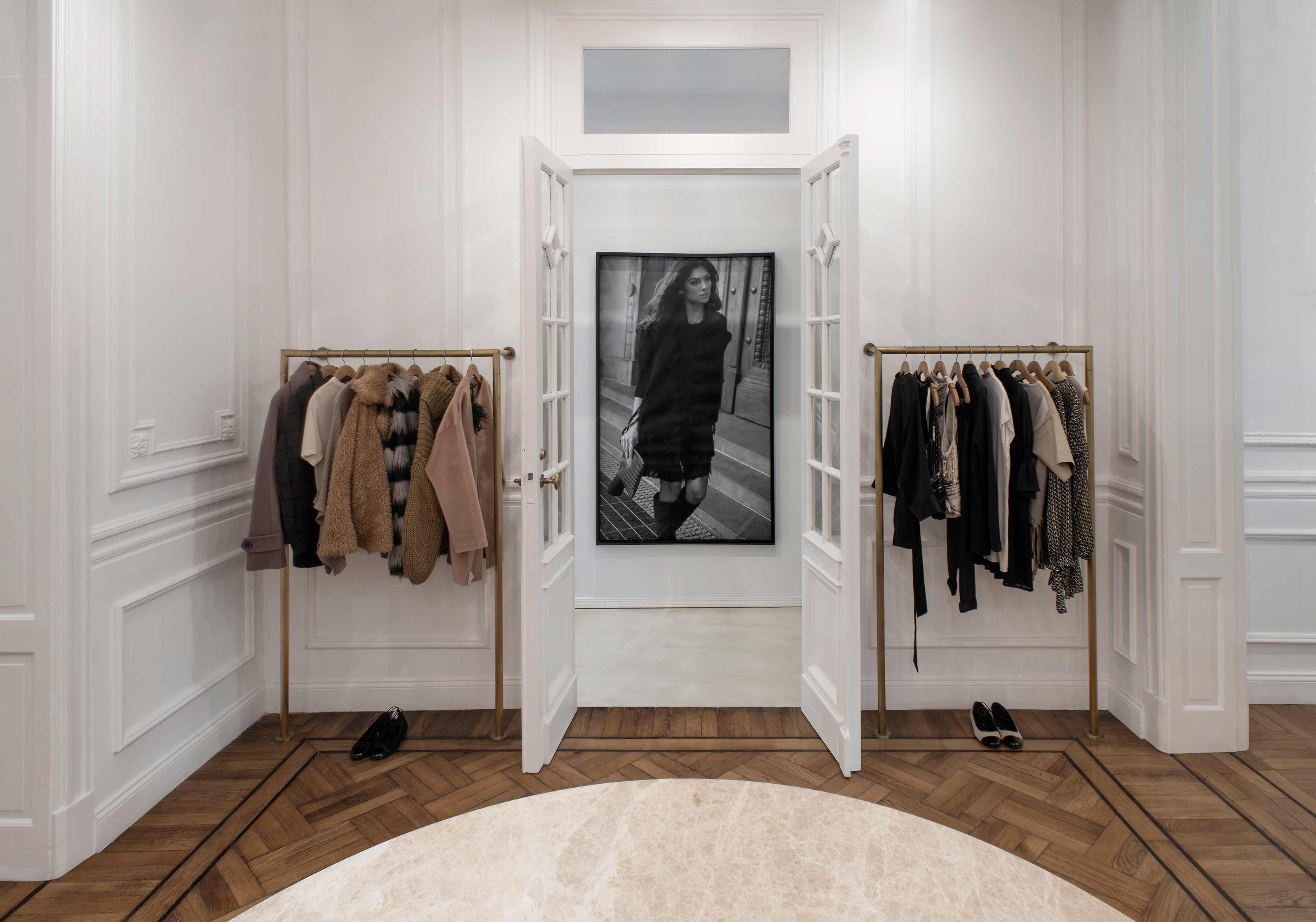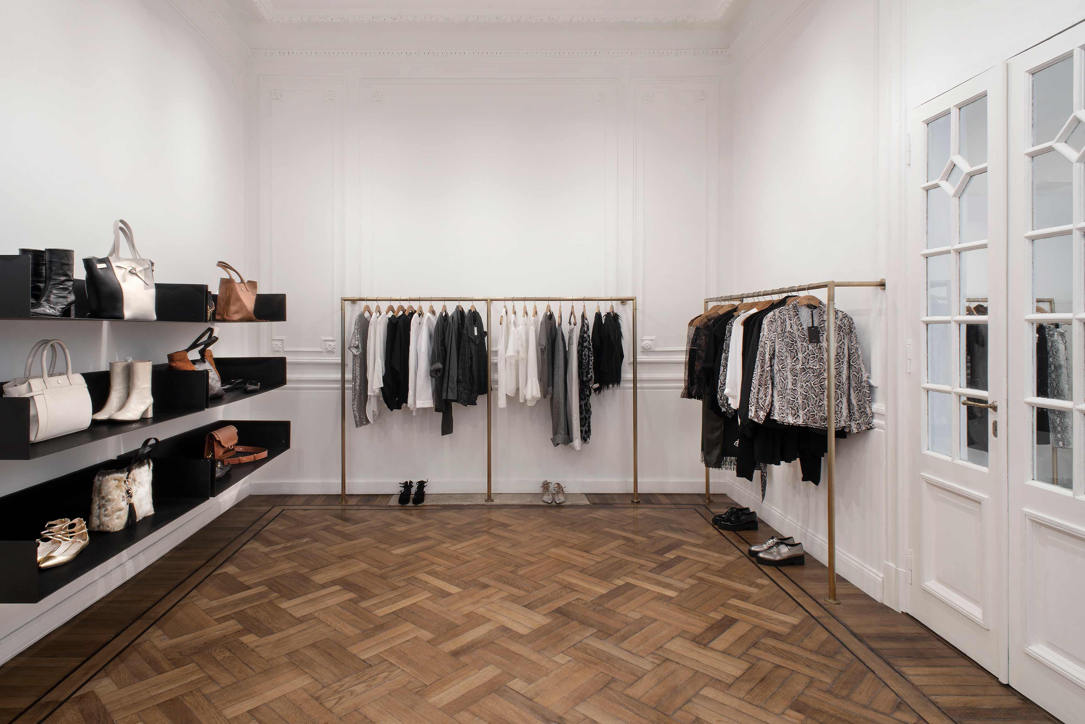 At the forefront, the sole window was converted into a shop display as well as becoming a front access door. The Slavonian oak floors were restored. An overall white paint treatment helped to unify the main space, including the molding and all wood carpentry. The monochrome setting is barely interrupted by several touches of black on the shelves ? located on chosen focal points ? and on the metallic carpentry. Also departing from white is the color of oak, which matches the bronze found in clothing racks and same-colored curtains used in the dressing rooms. White, black and subtle differences in bronze tones are in perfect harmony with the color scheme of the brand.