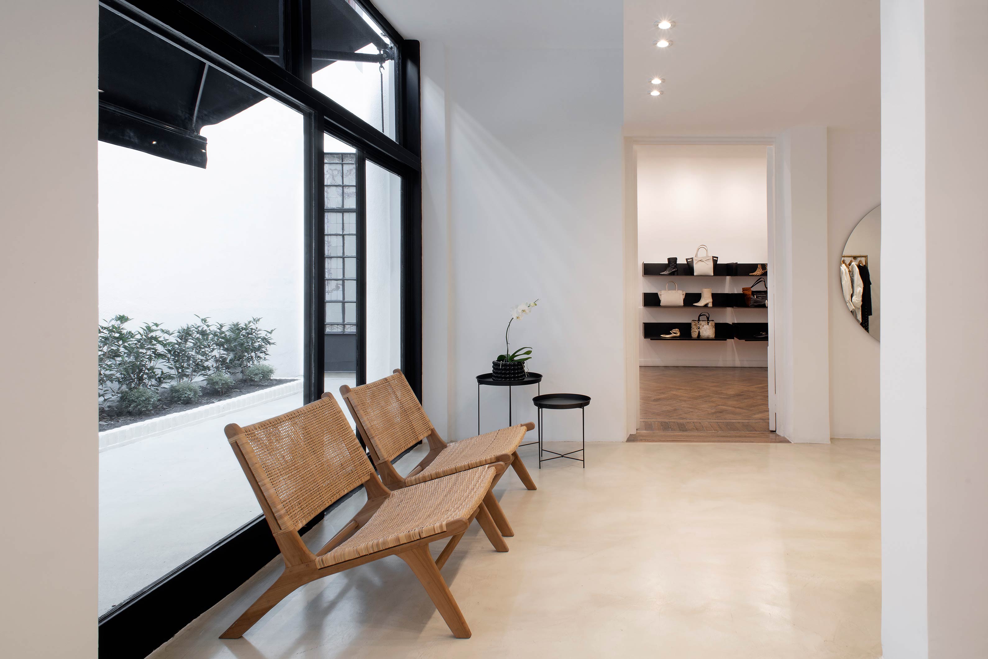 Located in the middle of the block, the store leads into a courtyard that was also given a minimalist treatment: a micro-cement floor in a neutral sand tone, contrasting with carpentry and an awning in black. The courtyard includes plants and is a wonderful asset, serving as a source of natural night for the whole store.
