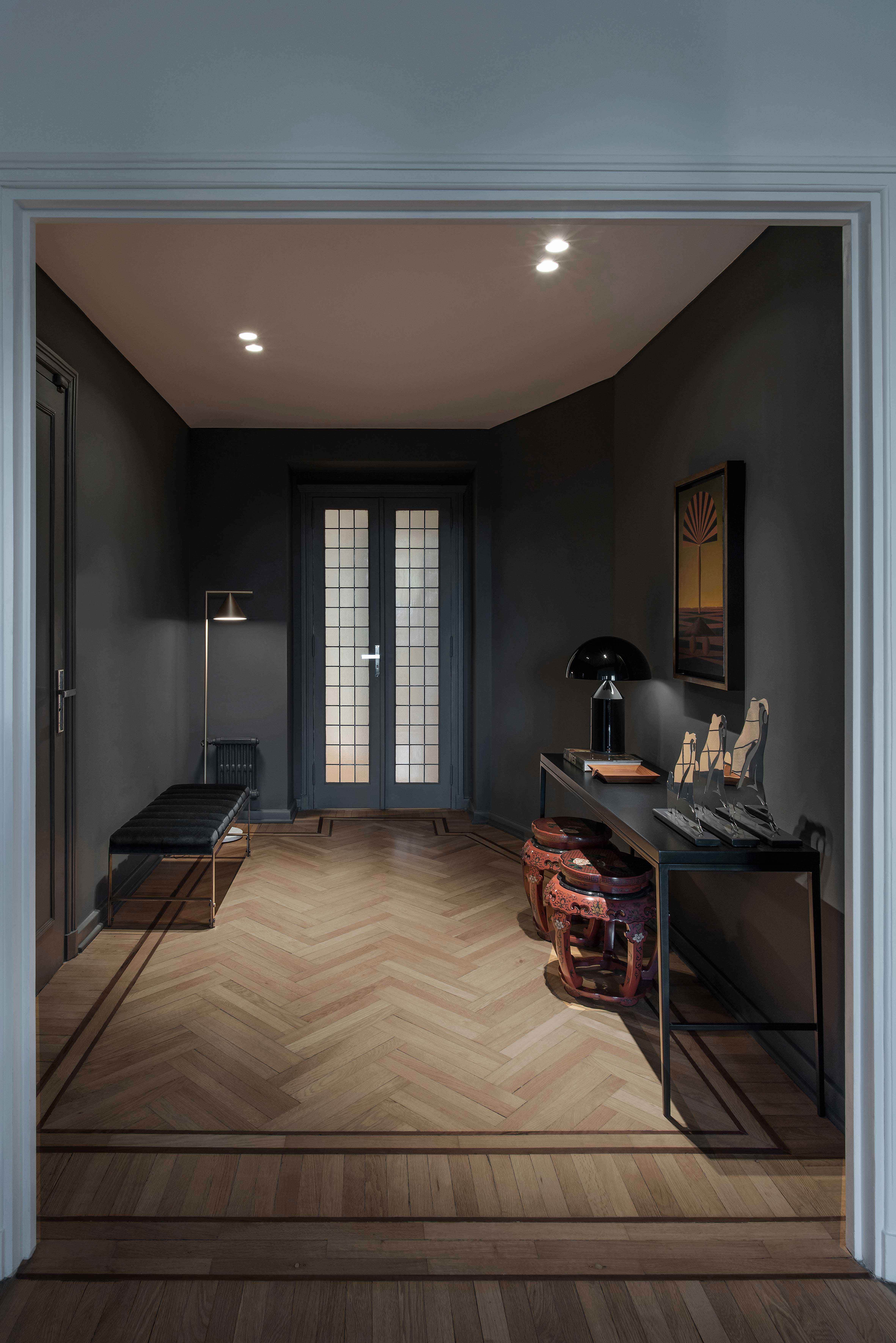 The reform focused on highlighting the materials and terminations, the staple of character in an apartment with these specific traits. The oak wood floors in the reception area were recovered and, an inside the apartment, the same kind of floors were replaced with wooden planks obtained at local demolitions. As for fittings, identical substitutes for the originals were found. All openings were taken out, restored, and supplied with double glass for optimal isolation. As proof of its original configuration, the apartment presented small windows and had no balcony space so special attention was given to lighting in general. For an indirect illumination effect, a throat was generated in the perimeter to reach the whole space. As for technological improvements, a centralized air conditioning system was installed. Even though most of these details are not directly noticeable, they were carefully included with a great eye for detail.