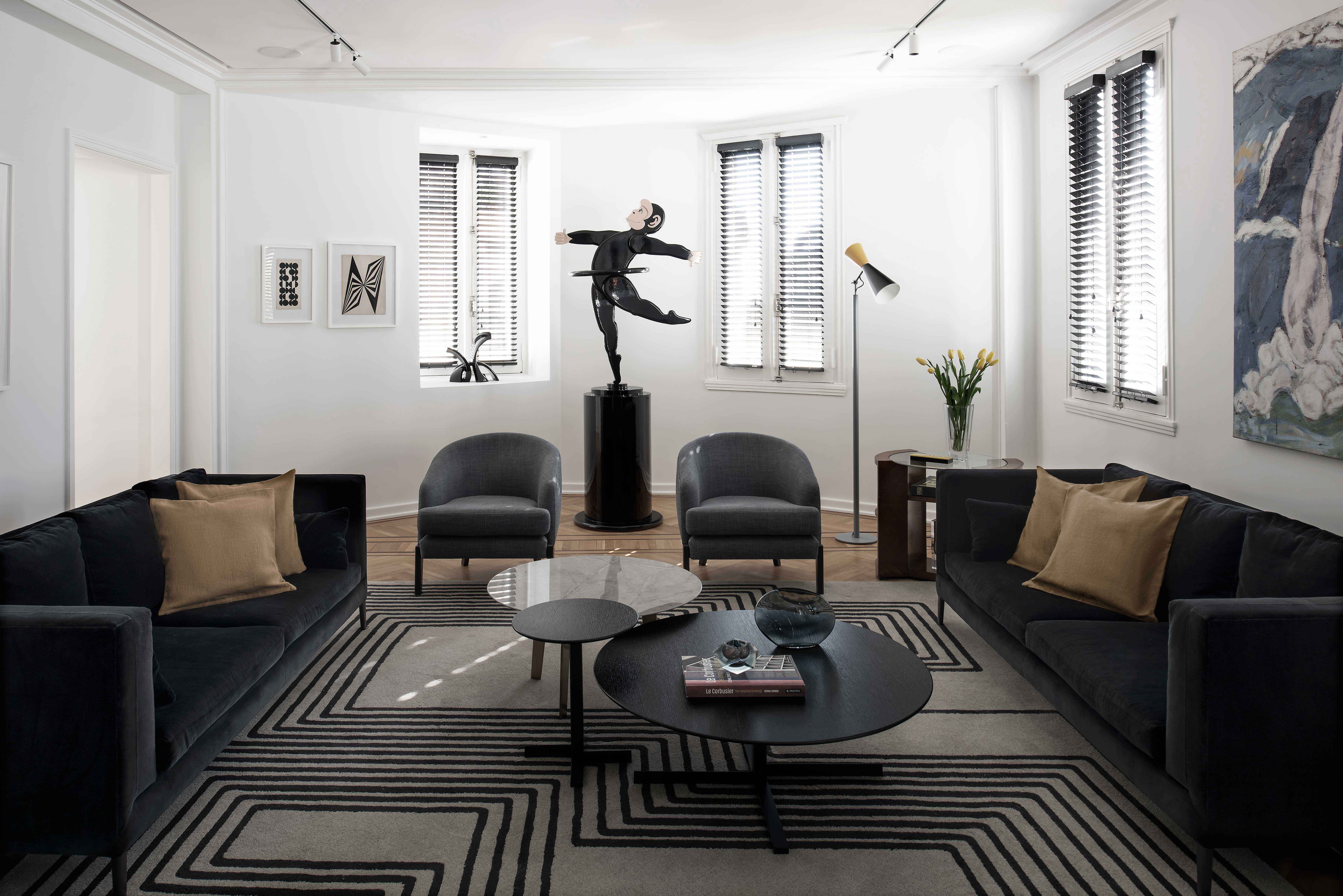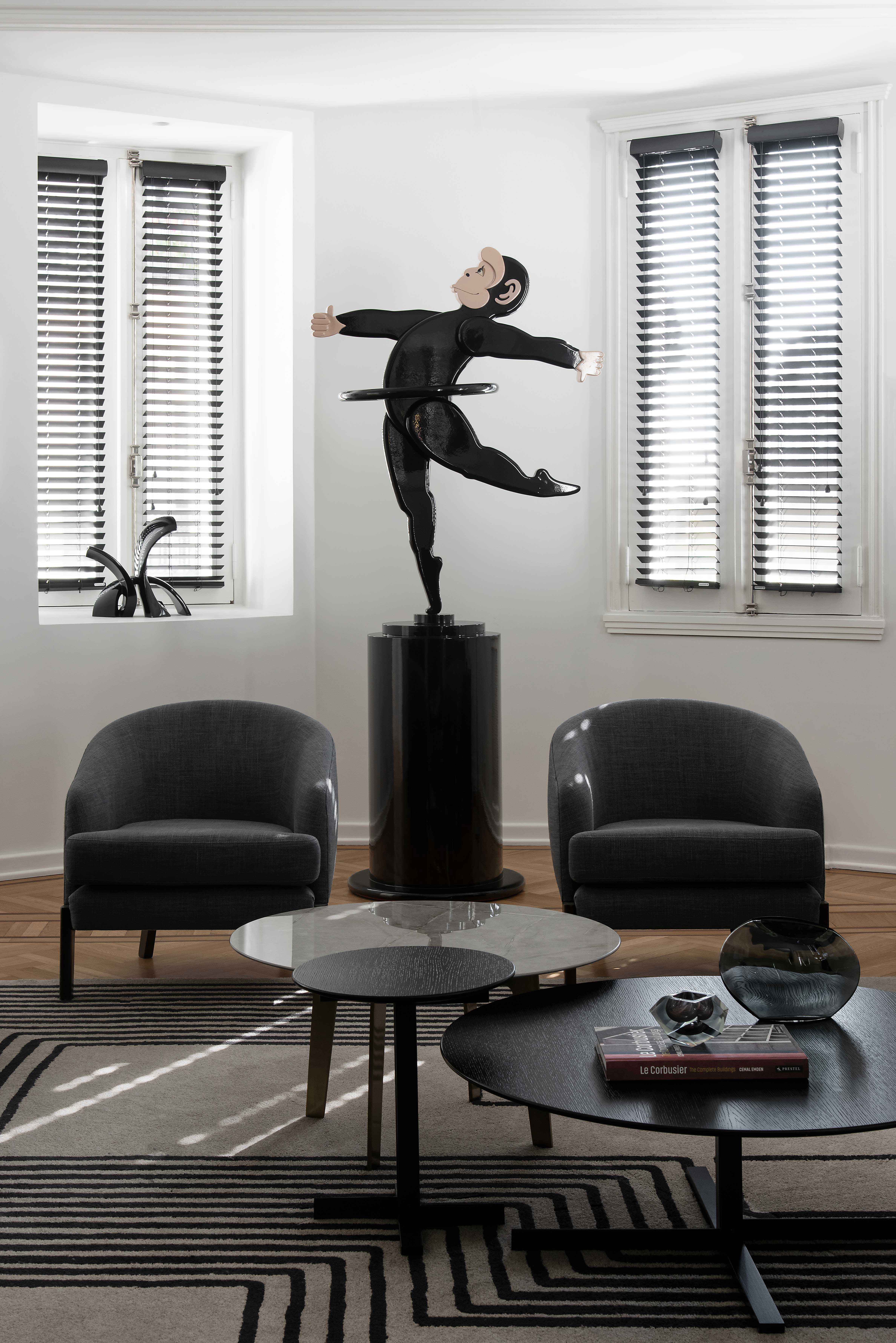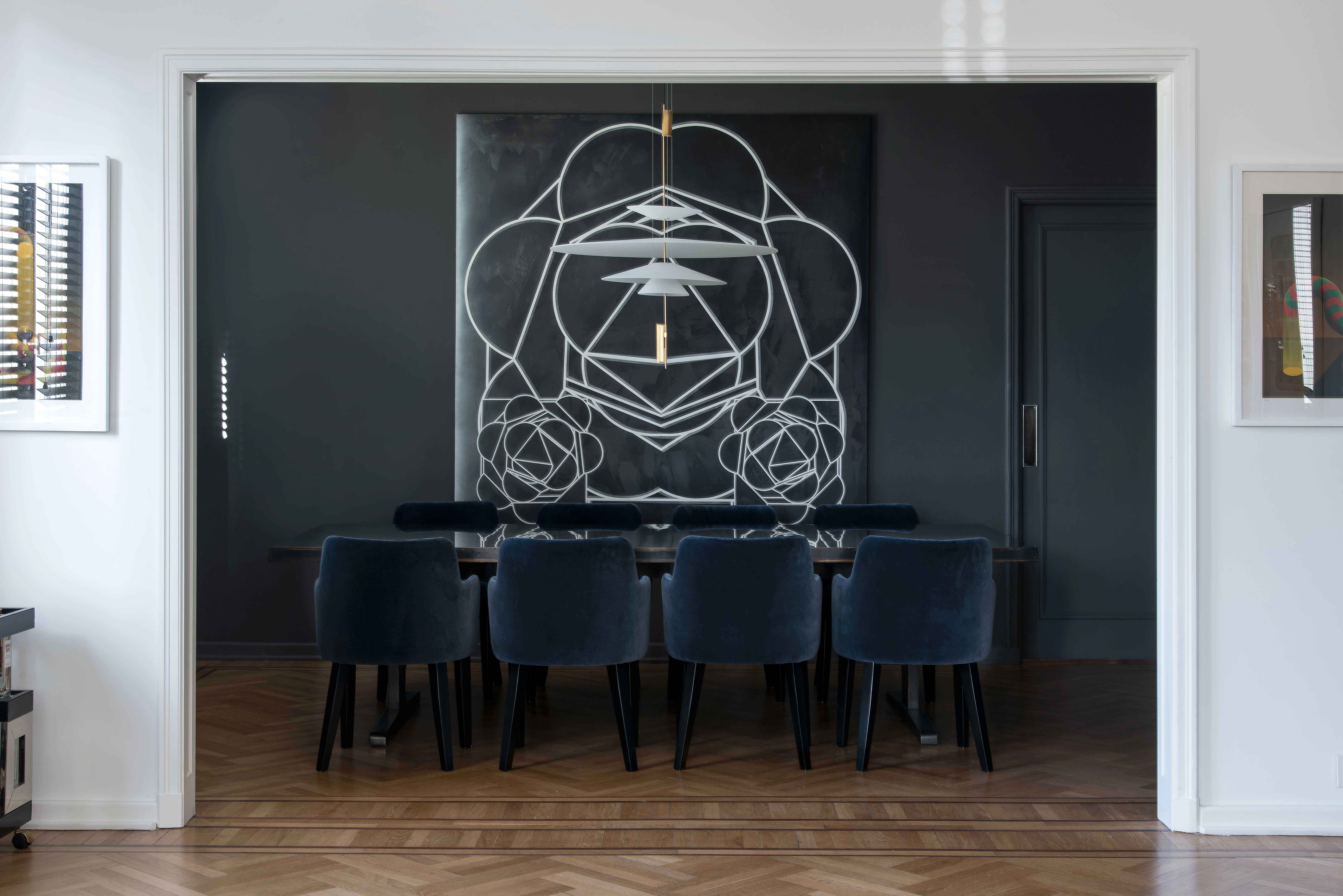 As for the interior design, there is an undeniable masculine mark. The entry hall and dining room were painted in slate gray, along the lines portrayed in the impressive Rogelio Polesello painting which presides over the space. Other noteworthy works of art include the female monkey by Edgardo Giménez in the living room and a painting by Roberto Aizenberg in the foyer.