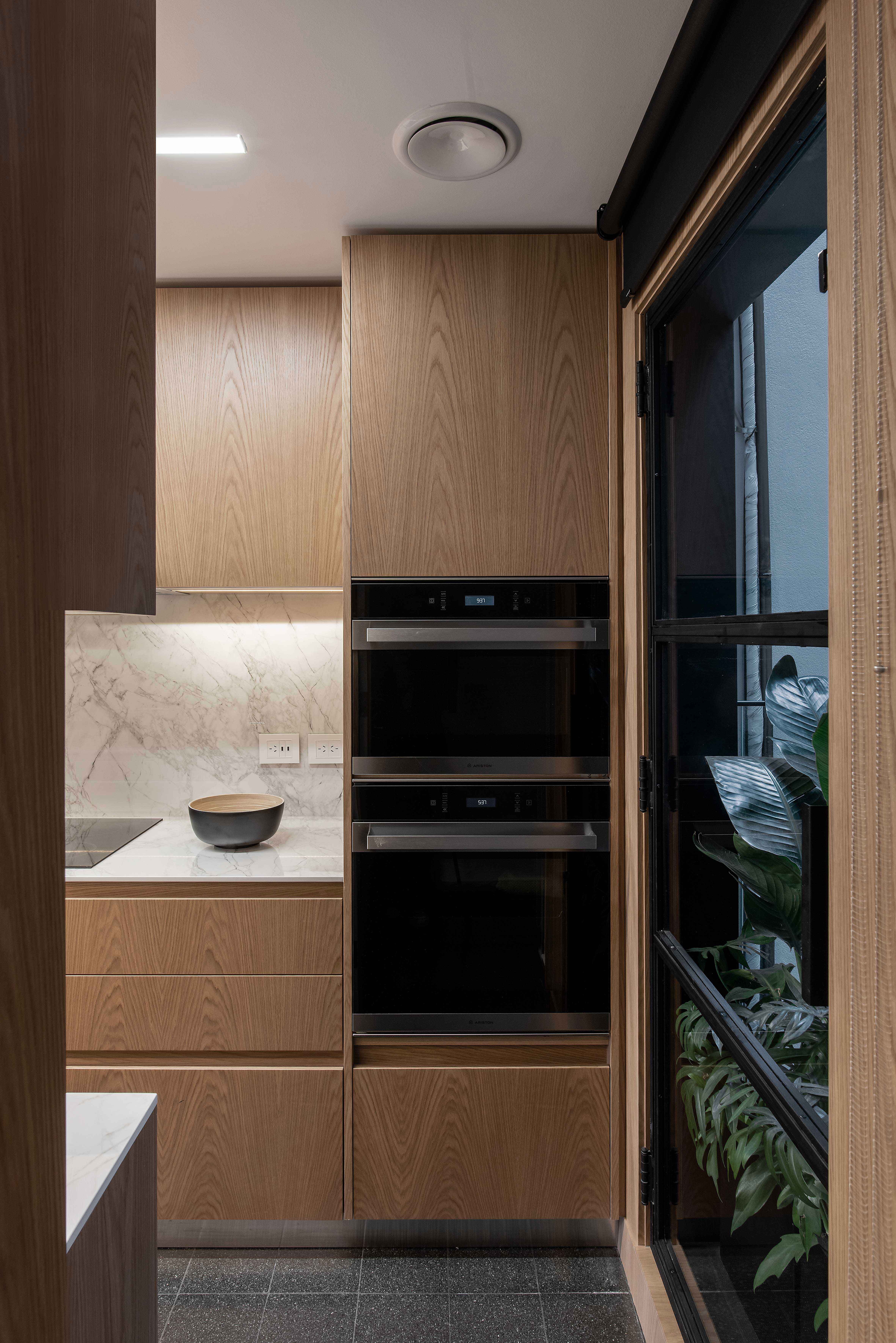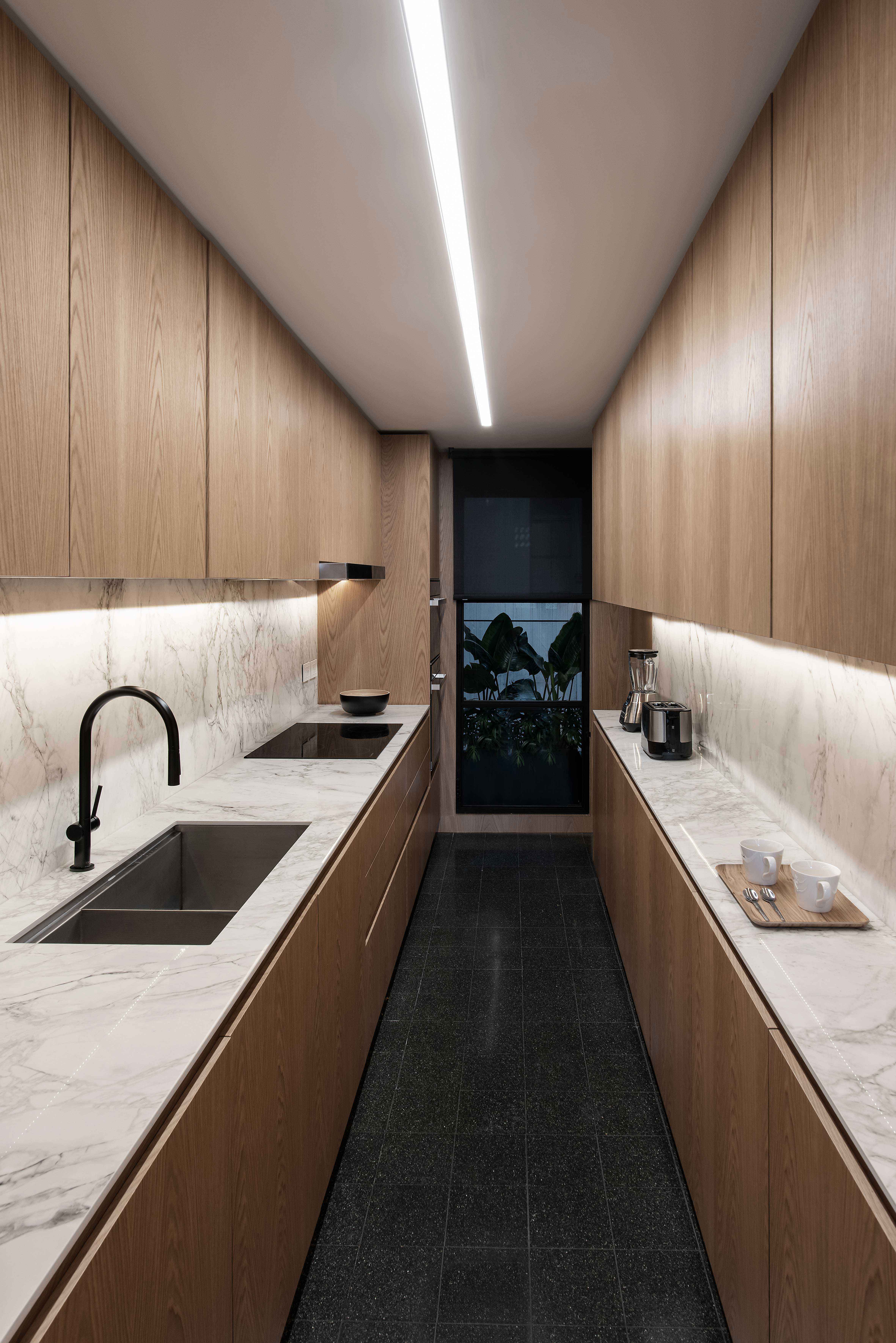 The kitchen was completely refurbished except for the floor in which case the original granite tiles were recovered. Dekton kitchen countertops were selected, and the furniture, as well as the pieces in the adjacent den, are designs in American oak.