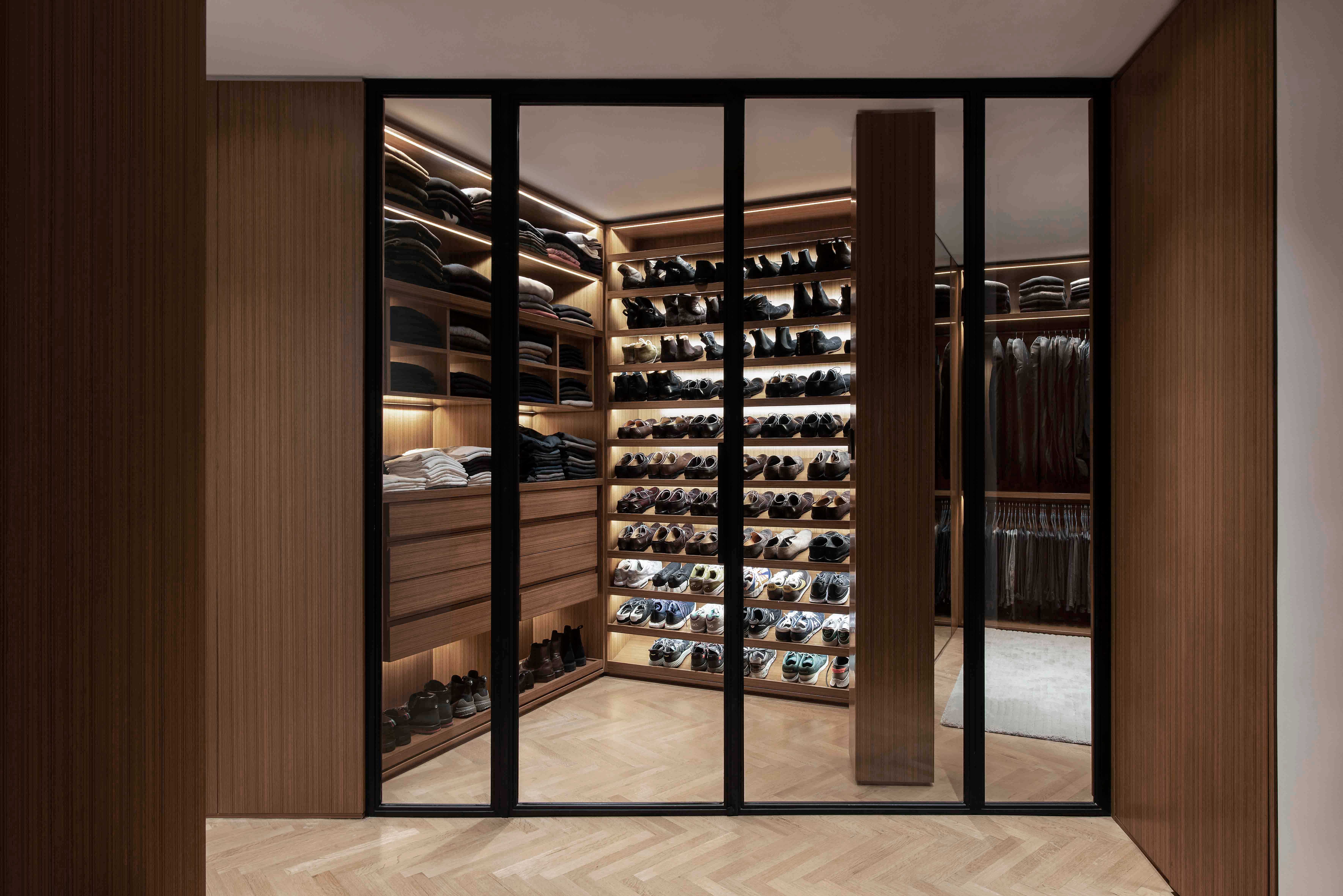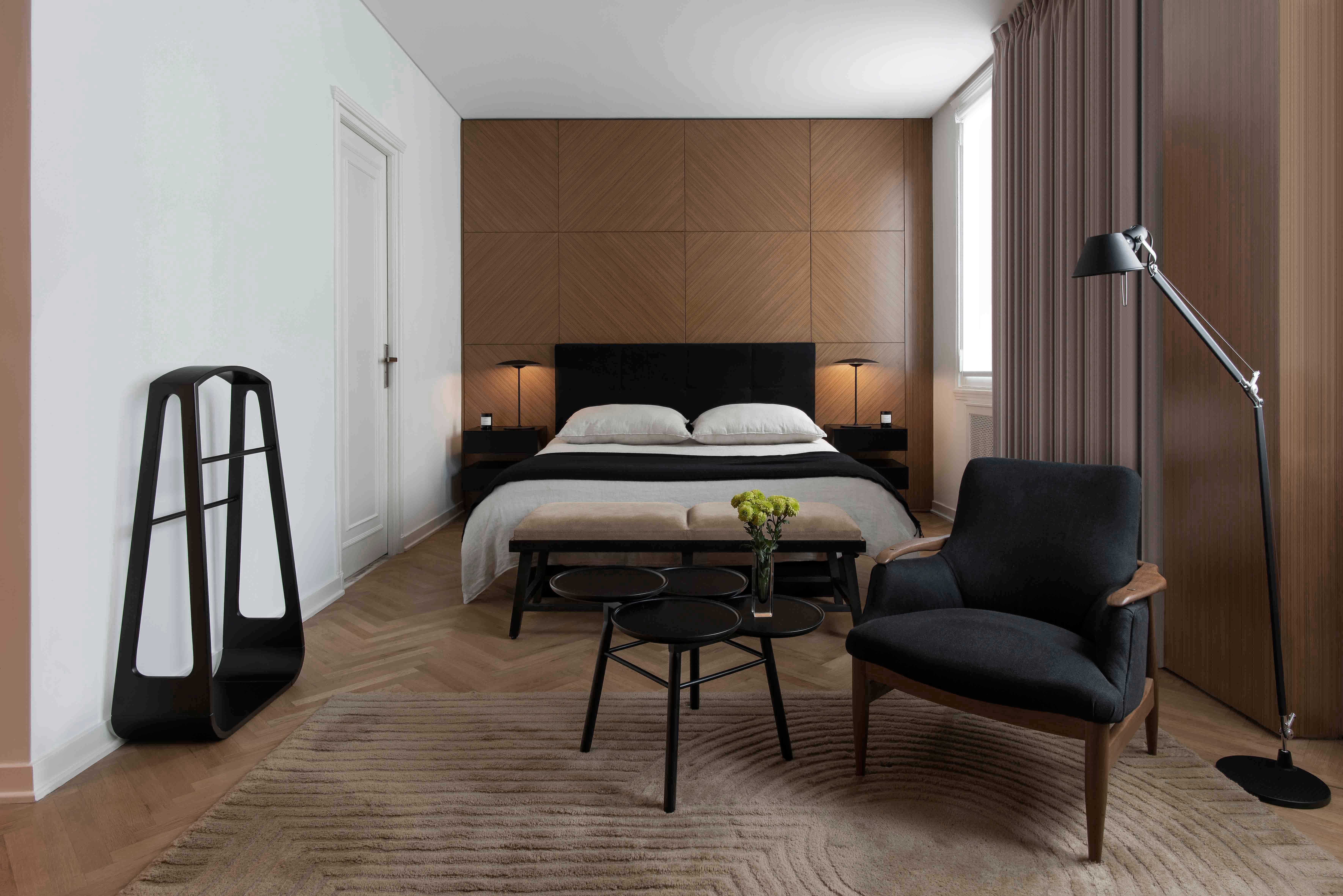 The grand touch in the master bedroom is a wall cladded with teakwood which provides a type of panel frequently found in Art Deco. The same treatment is repeated on other bedroom walls and in the dressing room, built in the antique service area which was part of the original layout. The dressing room was integrated with the bedroom through the use of glass doors and iron carpentry. The Studio was in charge of providing all furnishings.