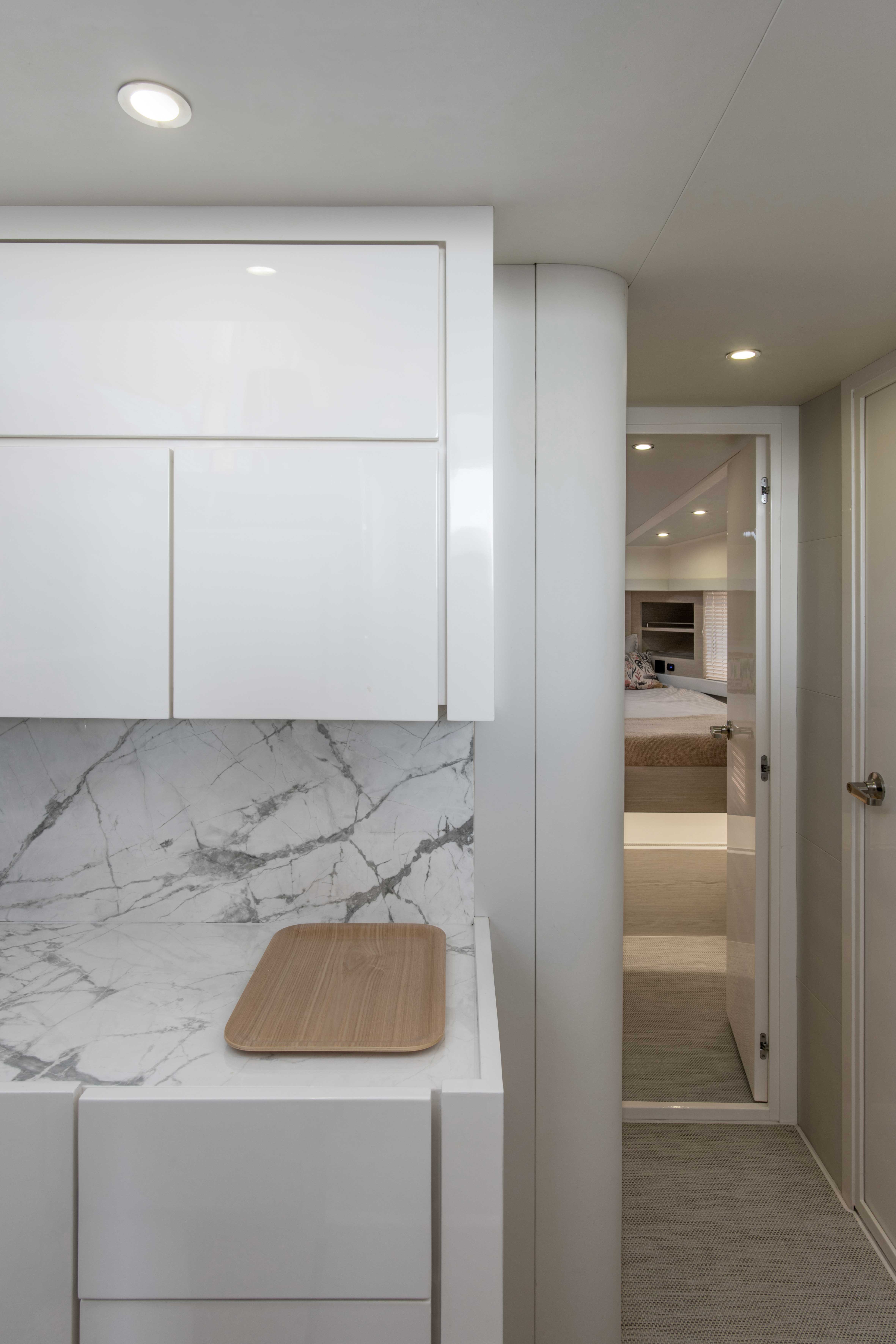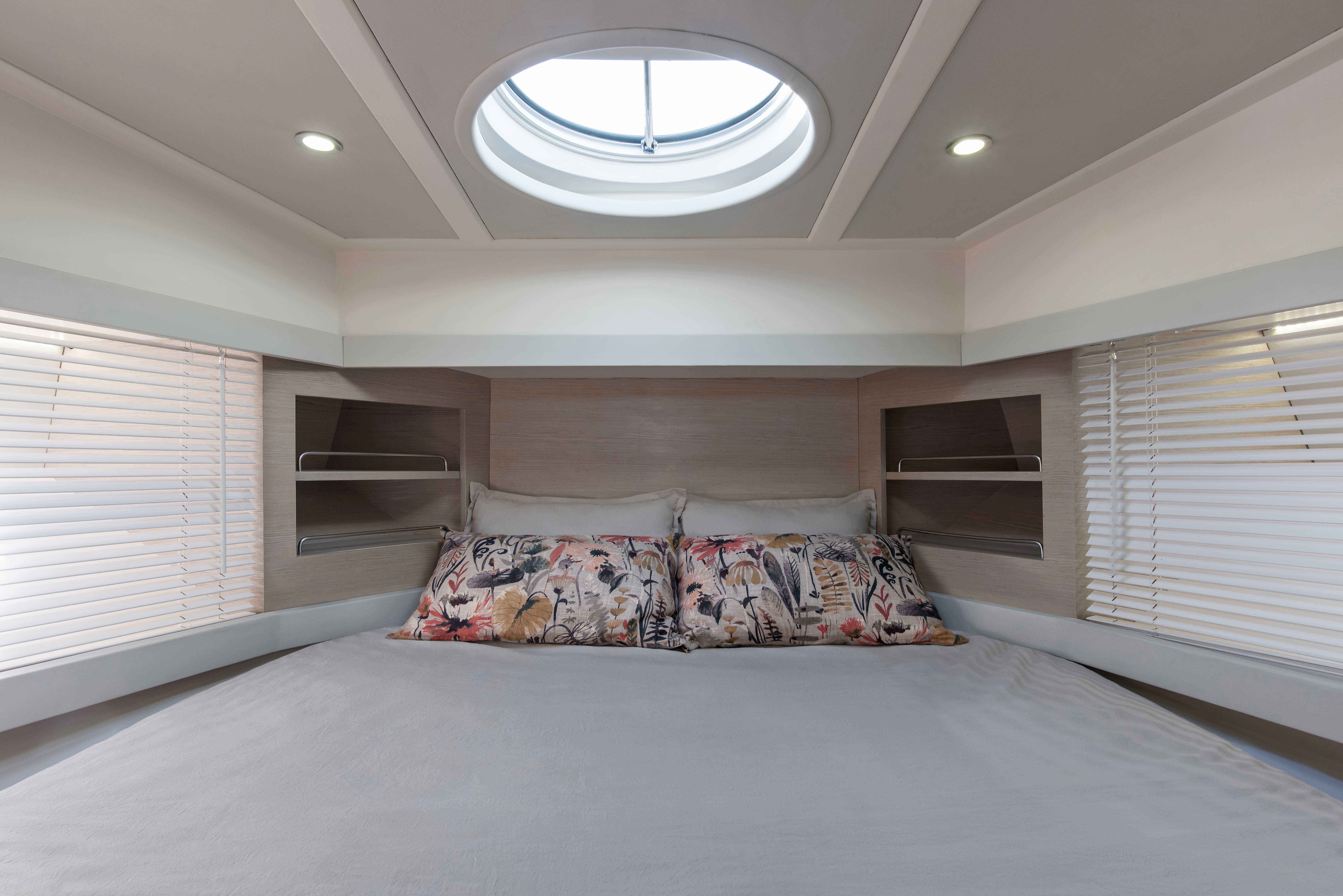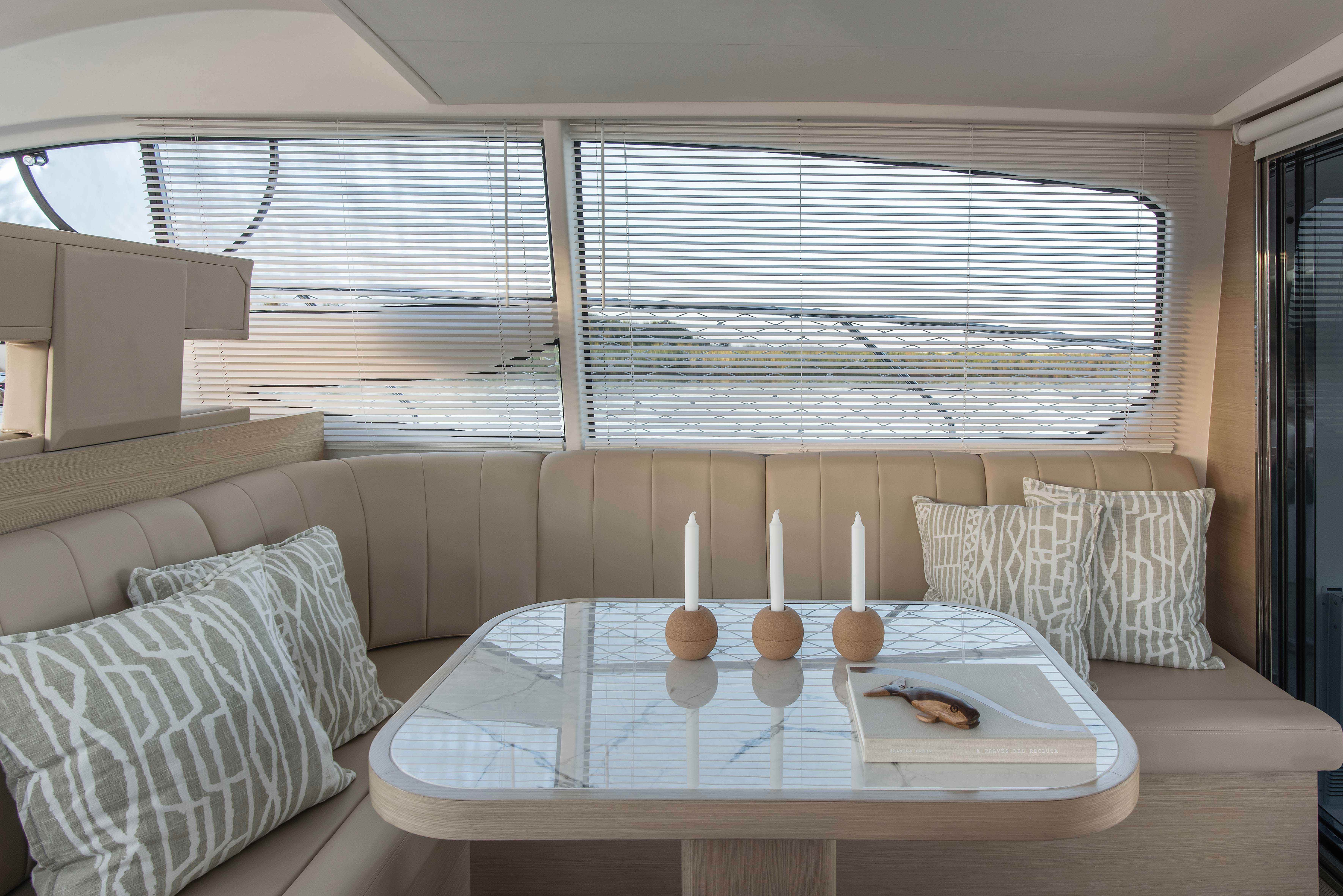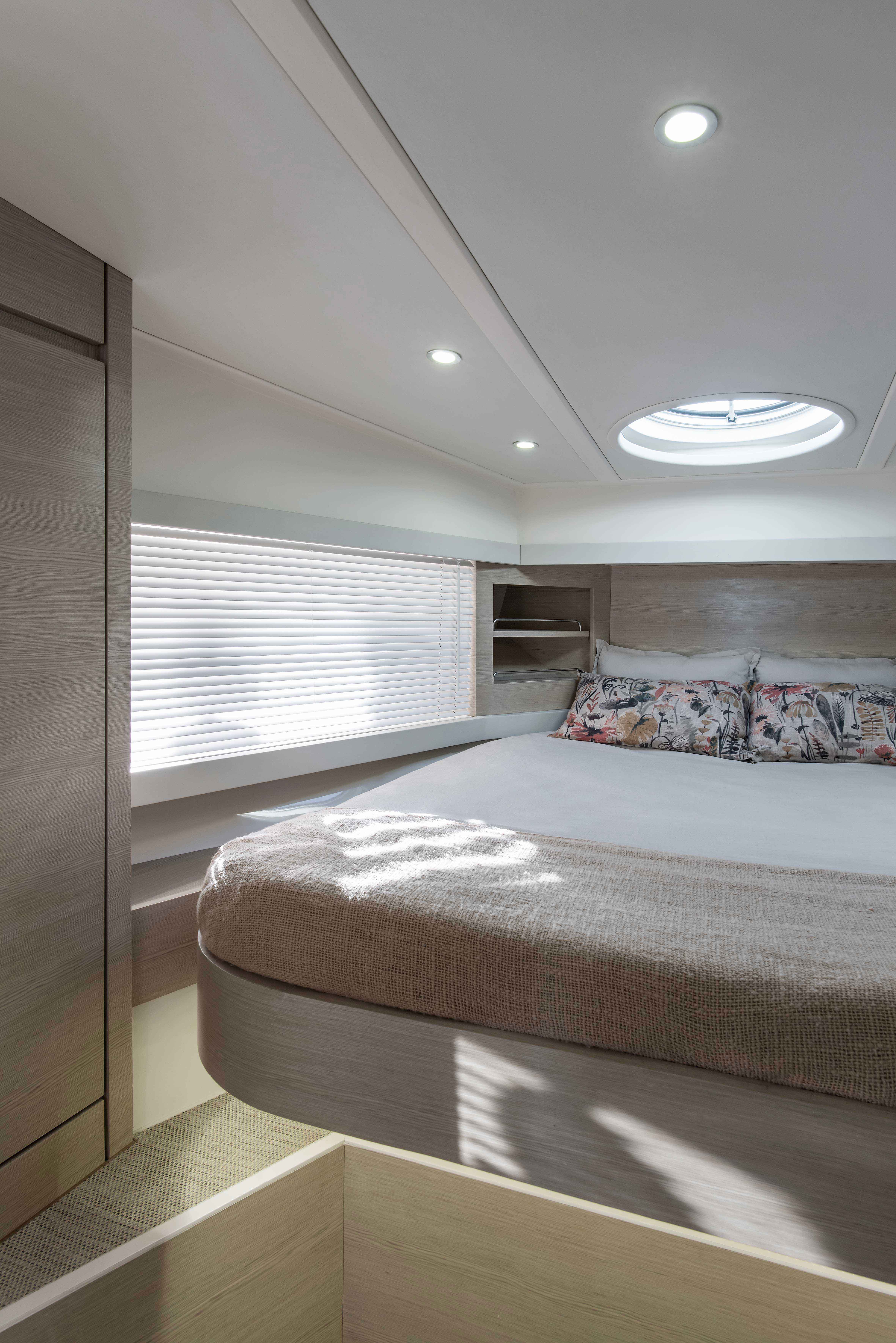 As a signature trademark of the Studio, the same materials were carefully selected to integrate all the spaces and create visual purity. All coverings, wood, lighting and other details were chosen based on beauty and specific color palettes. Water-resistant carpeting was placed both externally as well as inside the boat, matching the tone of wall linings and leather upholstery in every spot, in their respective opaque versions and natural colors. Oak polished in a light tone was the choice for all inner furnishing within the lounge area, dining room and main cabin. Chalk-colored, laminated finishes were used for bathrooms and the kitchen. Hunter Douglas metallic blinds, or roller blinds, depending on the case, were installed. Even though most of the furniture is fixed, several special mobile pieces were utilized, such as the table and cockpit chairs and a stool by designer Serge Rodrigues, all from Acento Muradas. Bed and bath linen are from Ramos Generales.
