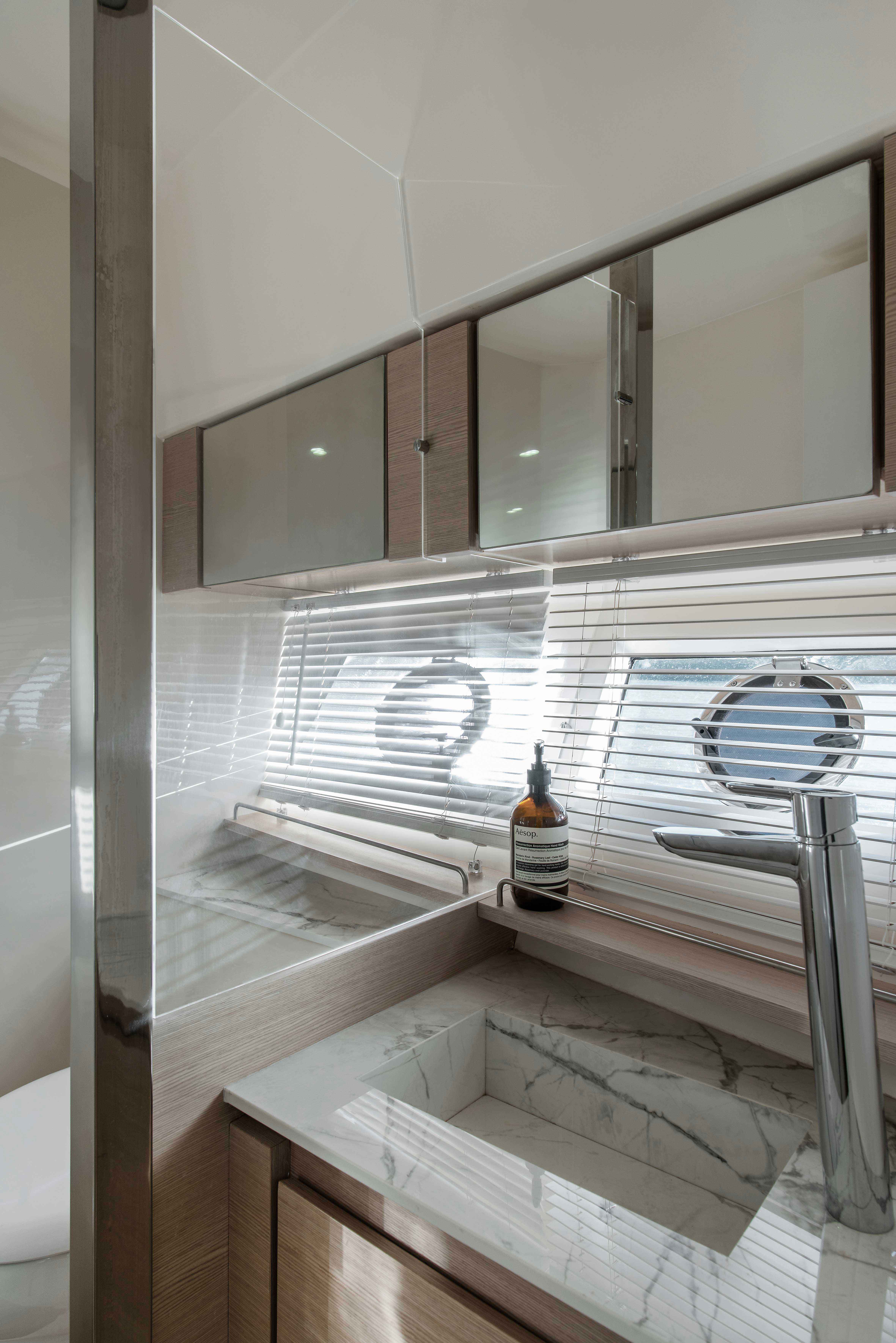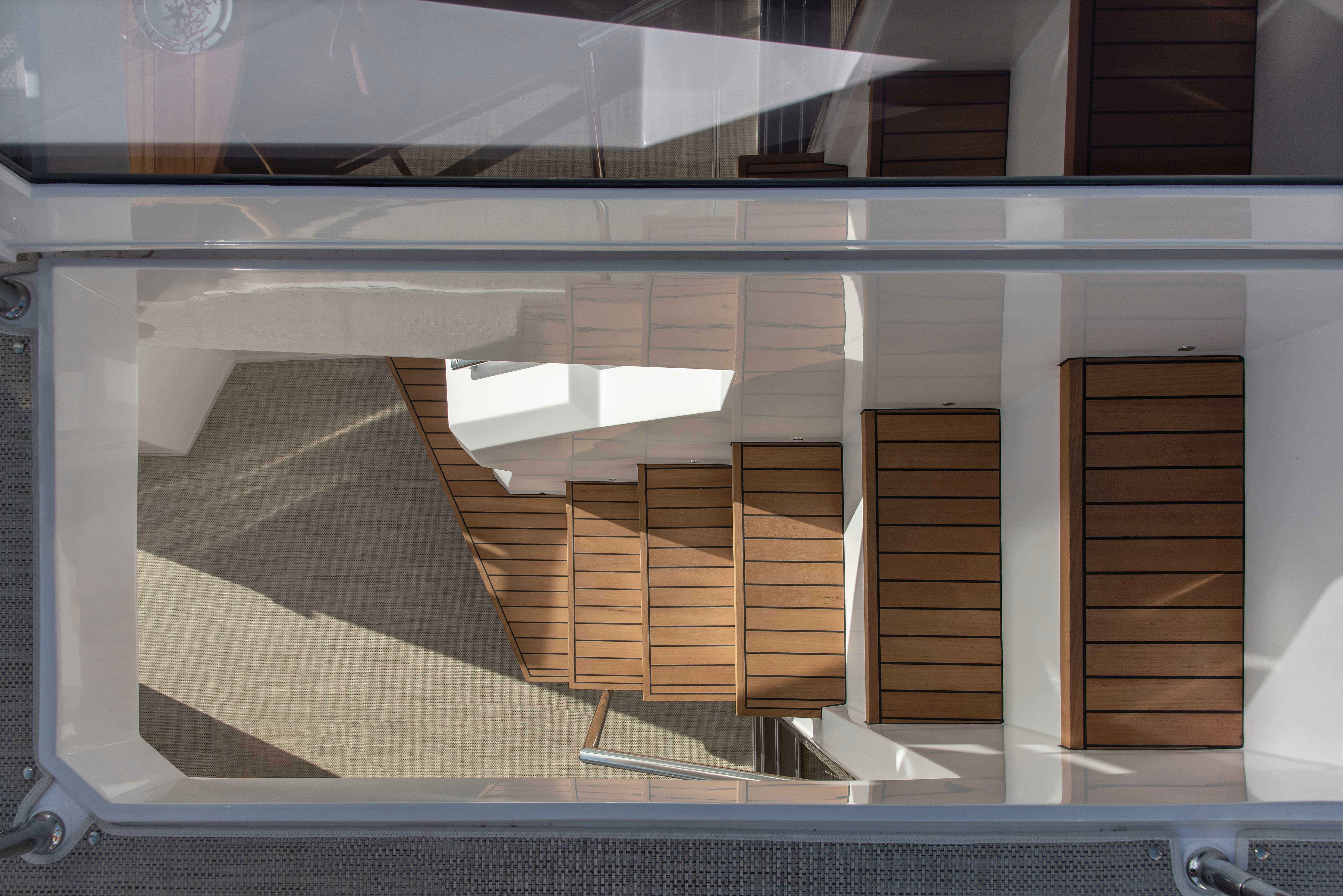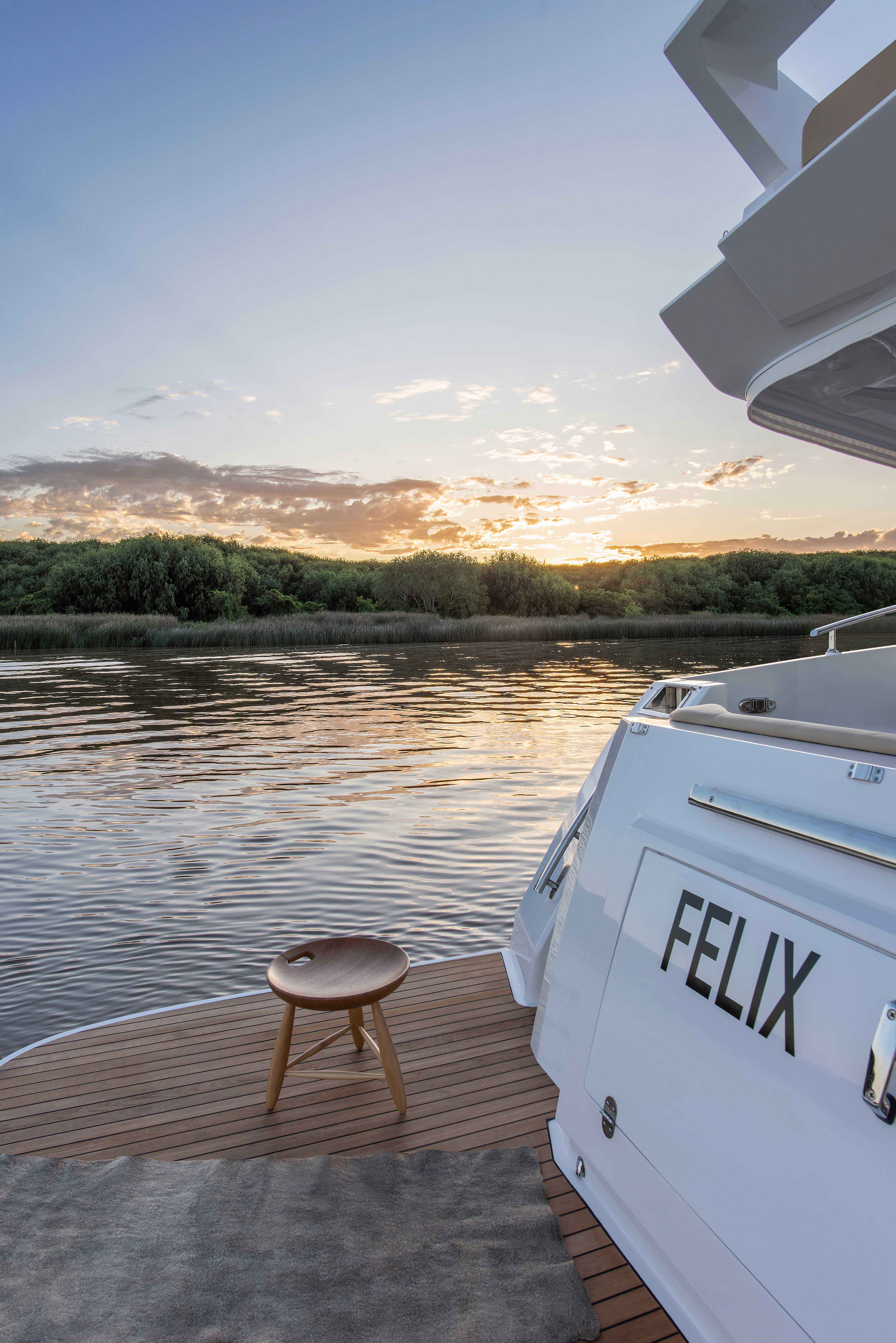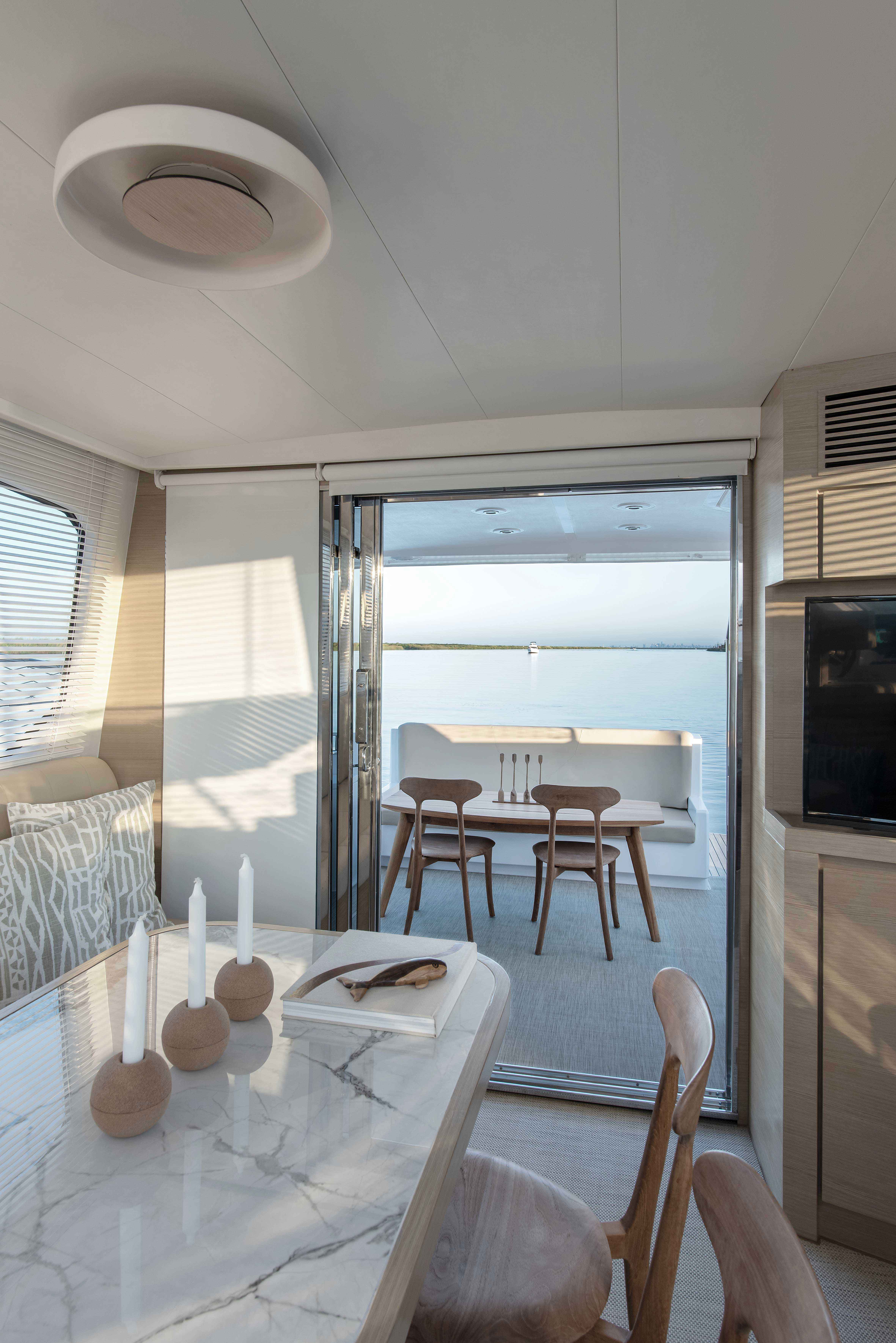 As a signature trademark of the Studio, the same materials were carefully selected to integrate all the spaces and create visual purity. All coverings, wood, lighting and other details were chosen based on beauty and specific color palettes. Water-resistant carpeting was placed both externally as well as inside the boat, matching the tone of wall linings and leather upholstery in every spot, in their respective opaque versions and natural colors. Oak polished in a light tone was the choice for all inner furnishing within the lounge area, dining room and main cabin. Chalk-colored, laminated finishes were used for bathrooms and the kitchen. Hunter Douglas metallic blinds, or roller blinds, depending on the case, were installed. Even though most of the furniture is fixed, several special mobile pieces were utilized, such as the table and cockpit chairs and a stool by designer Serge Rodrigues, all from Acento Muradas. Bed and bath linen are from Ramos Generales.