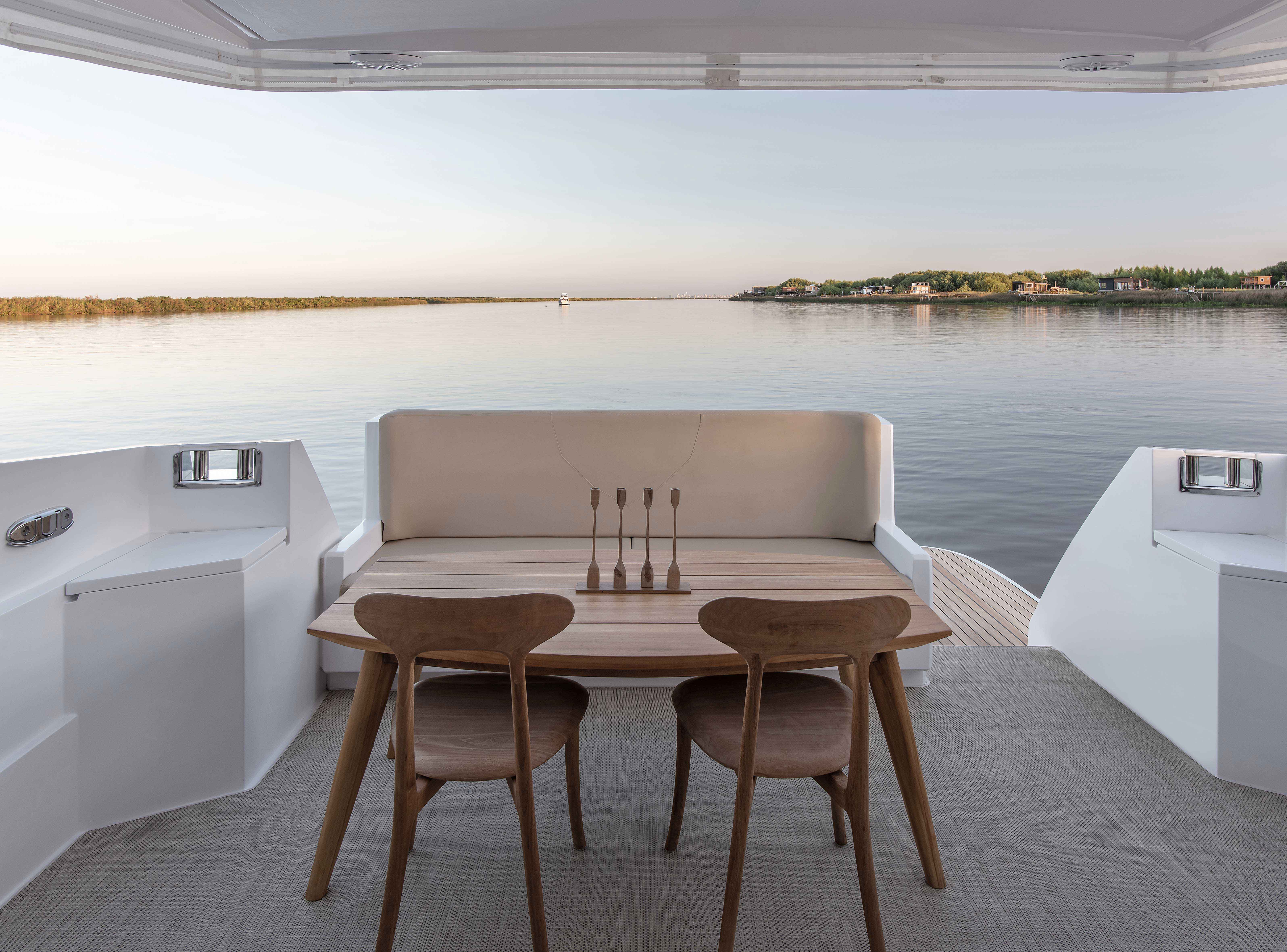 Decks and landing docks were made out of teak wood, the same wood found in all exterior furniture, purchased in Coin Vert, Punta del Este. Recurring material in both open spaces and interiors, soft lines and a general chromatic match, exude a sense of calm which replicates the serenity of water.