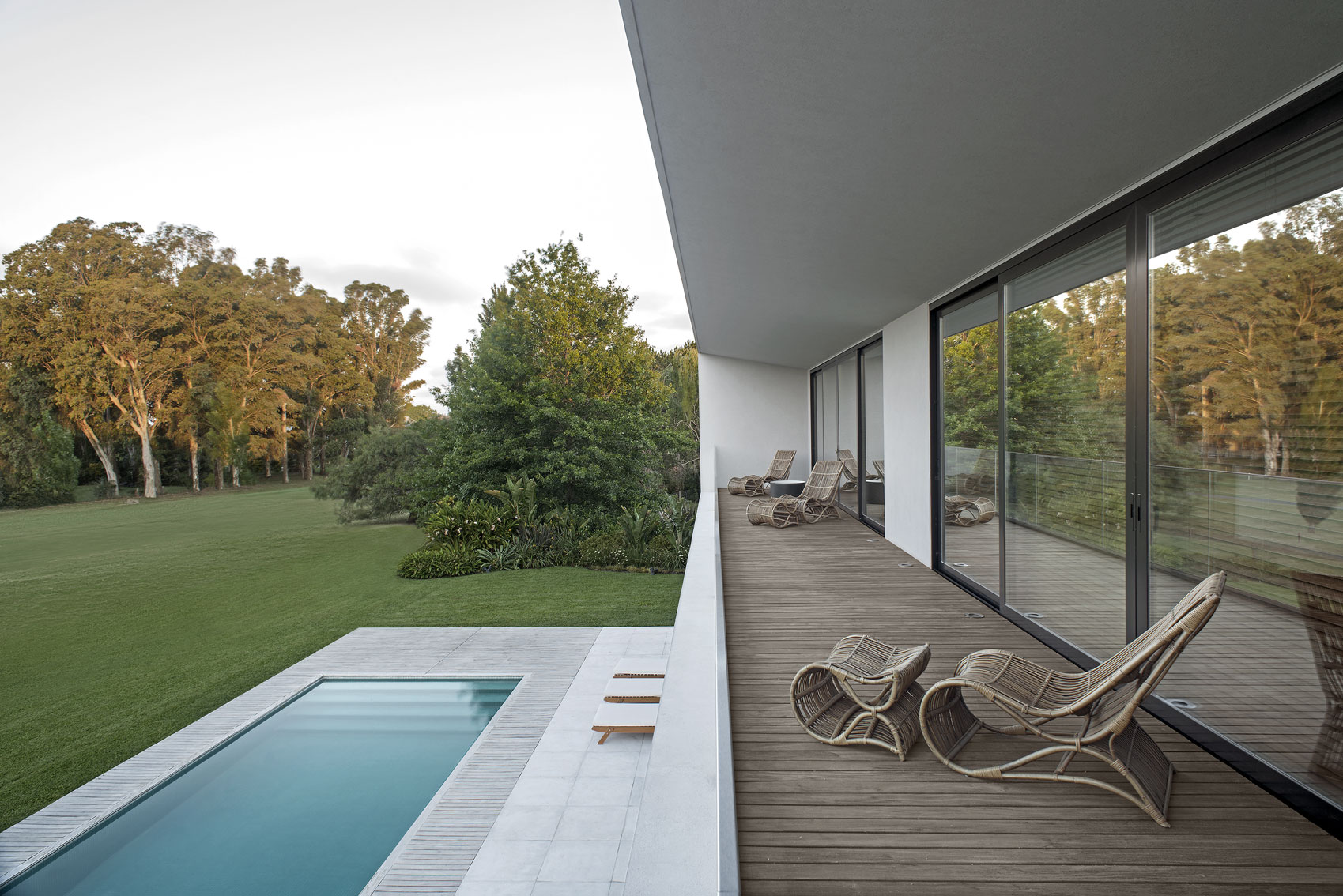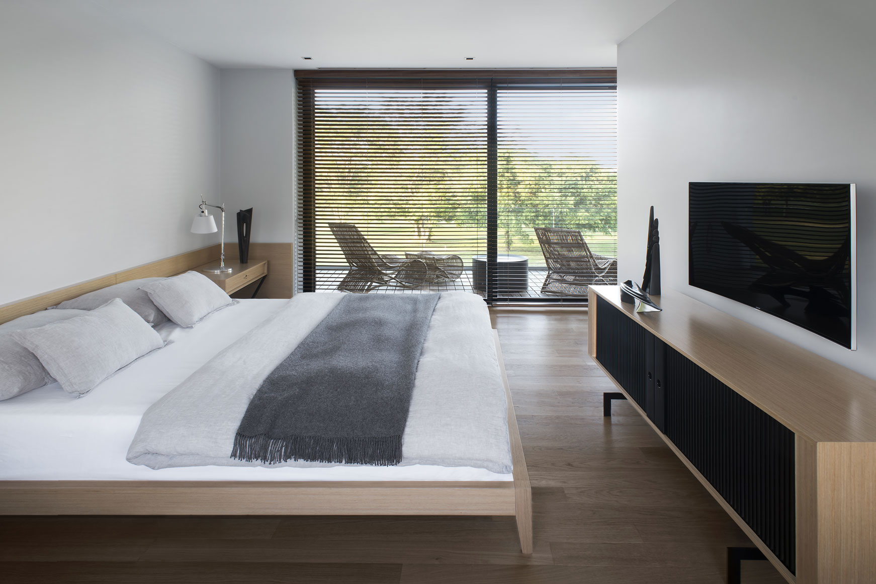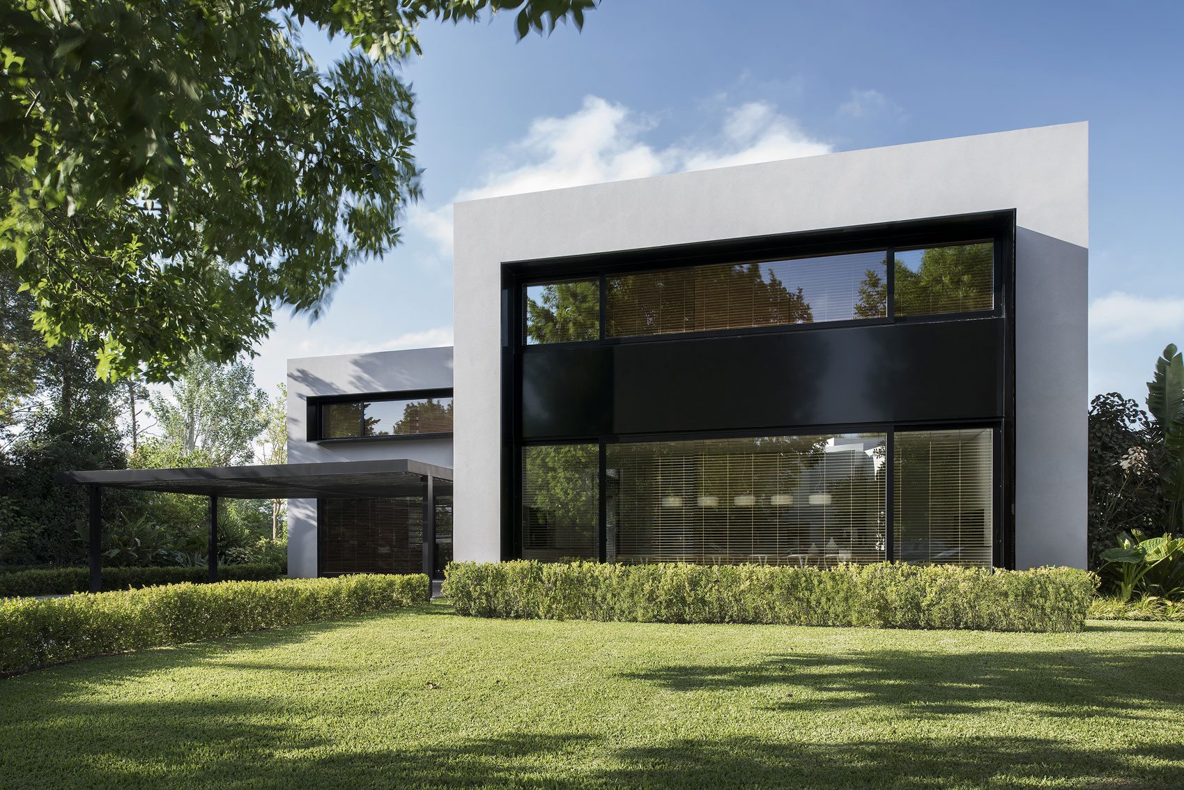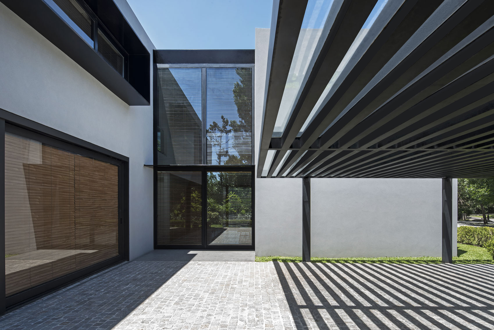 The Studio created this house inspired by two main challenges: the irregular lot with a view to a spectacular golf course, and the will to create the perfect stage for day to day family life. So the project contemplated the existence of two blocks, which included a basement and two stories, connected by a central hallway that allowed for vertical circulation. Between the two blocks, as a sort of breathing transition, this area was conceived as a metallic and glass structure, which creates a sense of lightness and transparency. In sync with the lot’s trapezoidal layout, the back module duplicates the front one in size. Grand windows blend the construction into the greenery that surrounds it. Gray reigns within the color scheme on exterior wall coverings, with openings in black aluminum. Oak wood was used for all house flooring. The Studio was also in charge of interior equipment, which consisted of custom furniture, modules and built-in shelves with a lacquer finish and exquisitely detailed workmanship. Modern 1950’s inspired furniture combined with other pieces with a touch of Scandinavian flair complete the interior decoration.