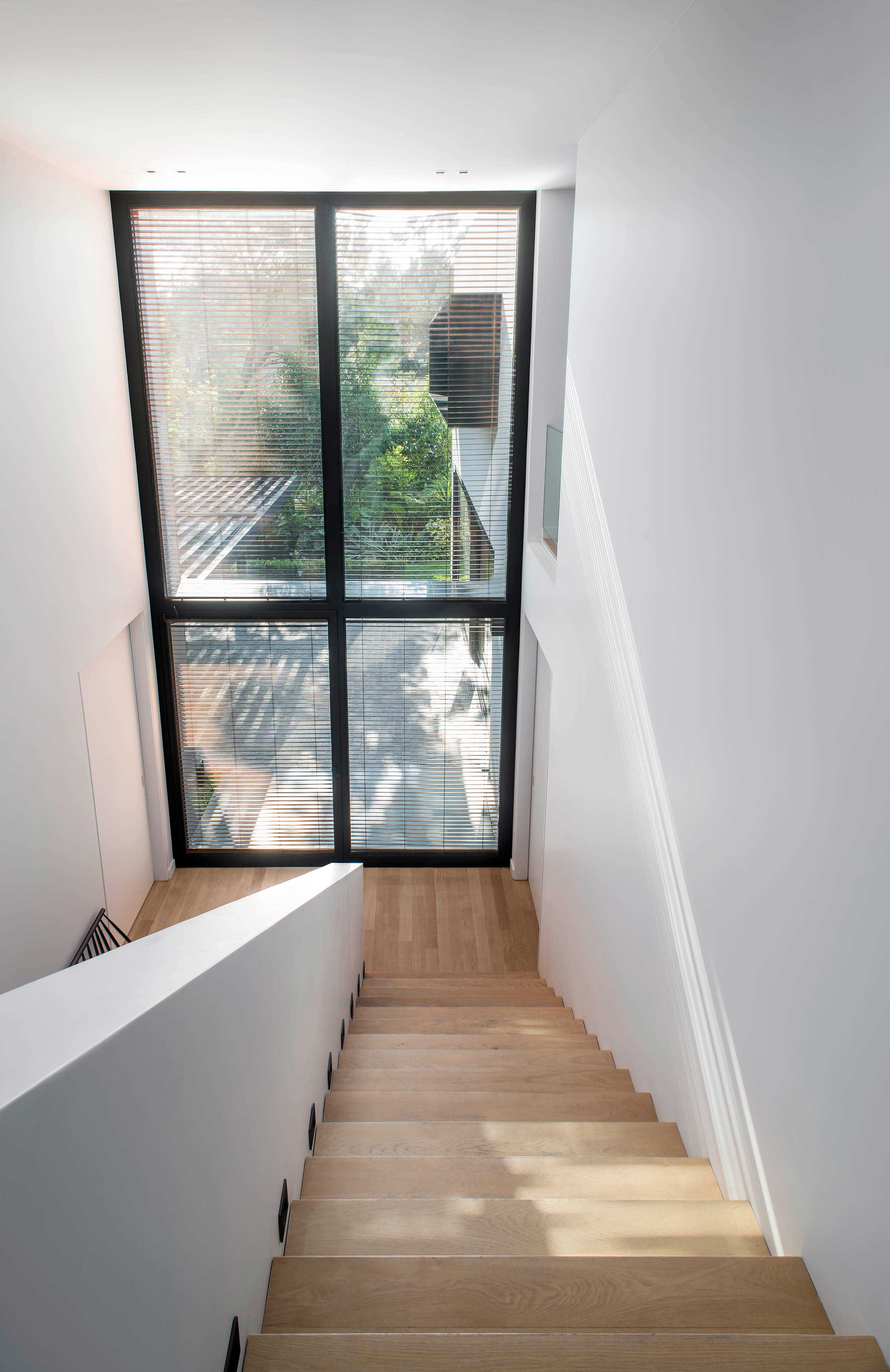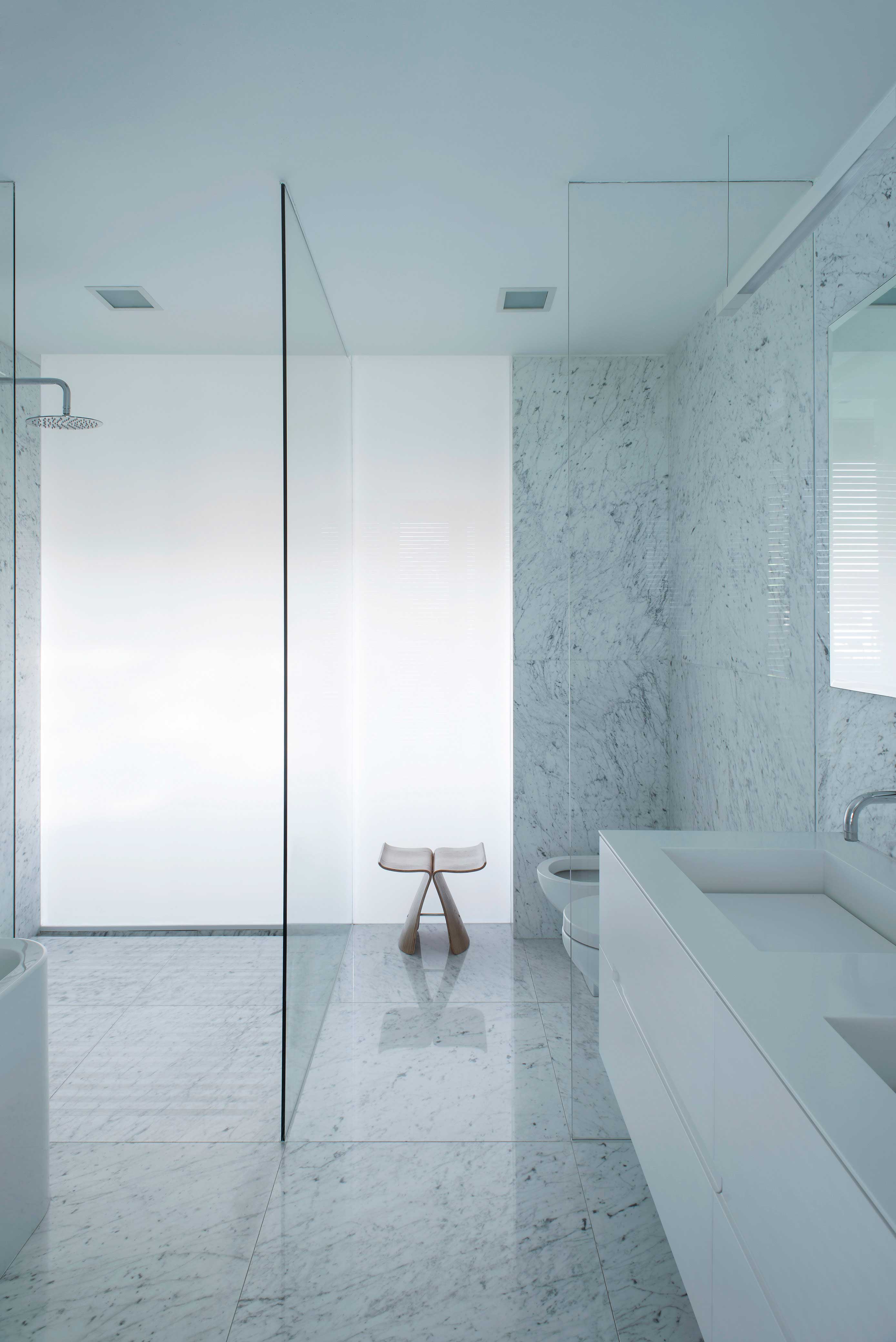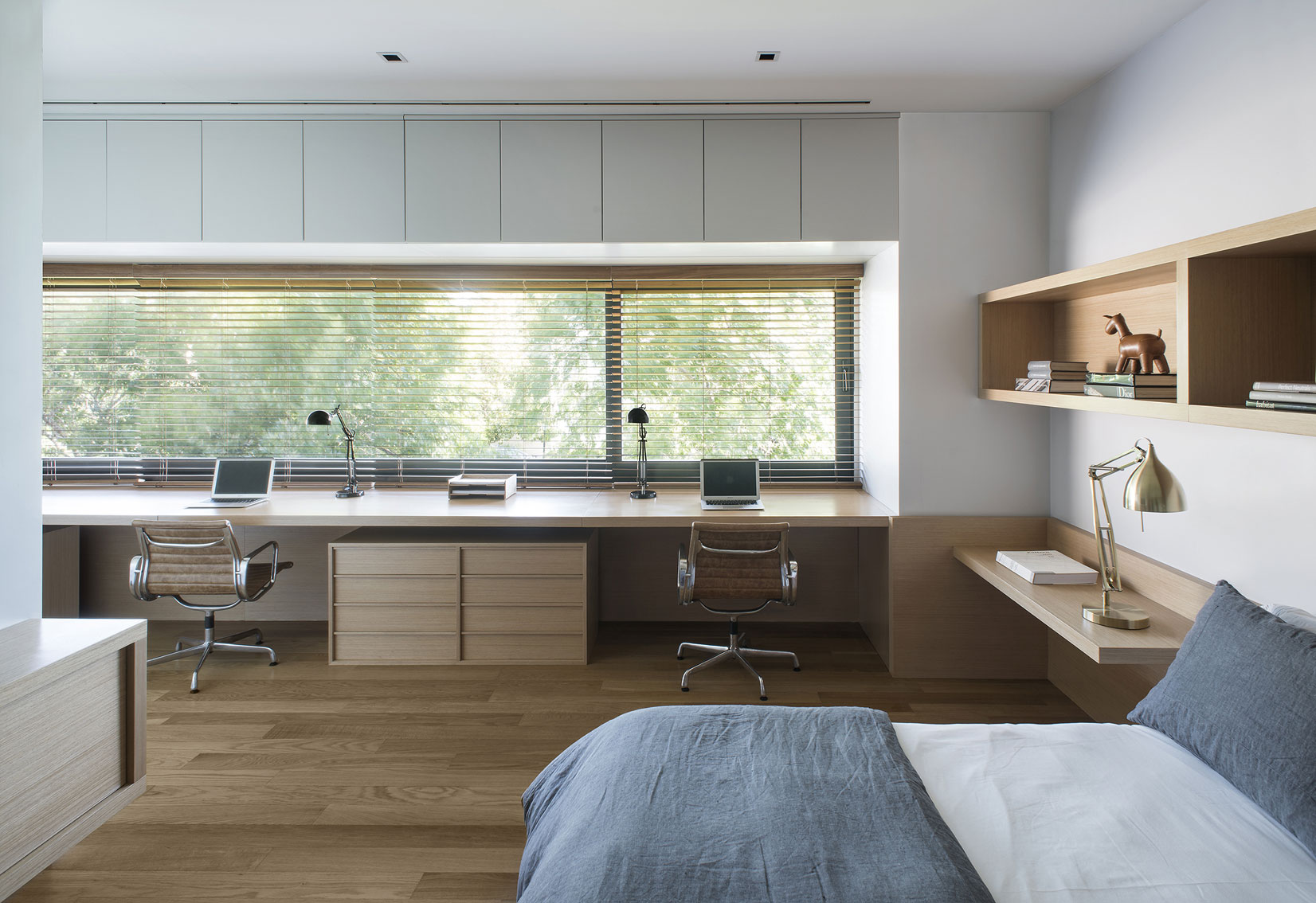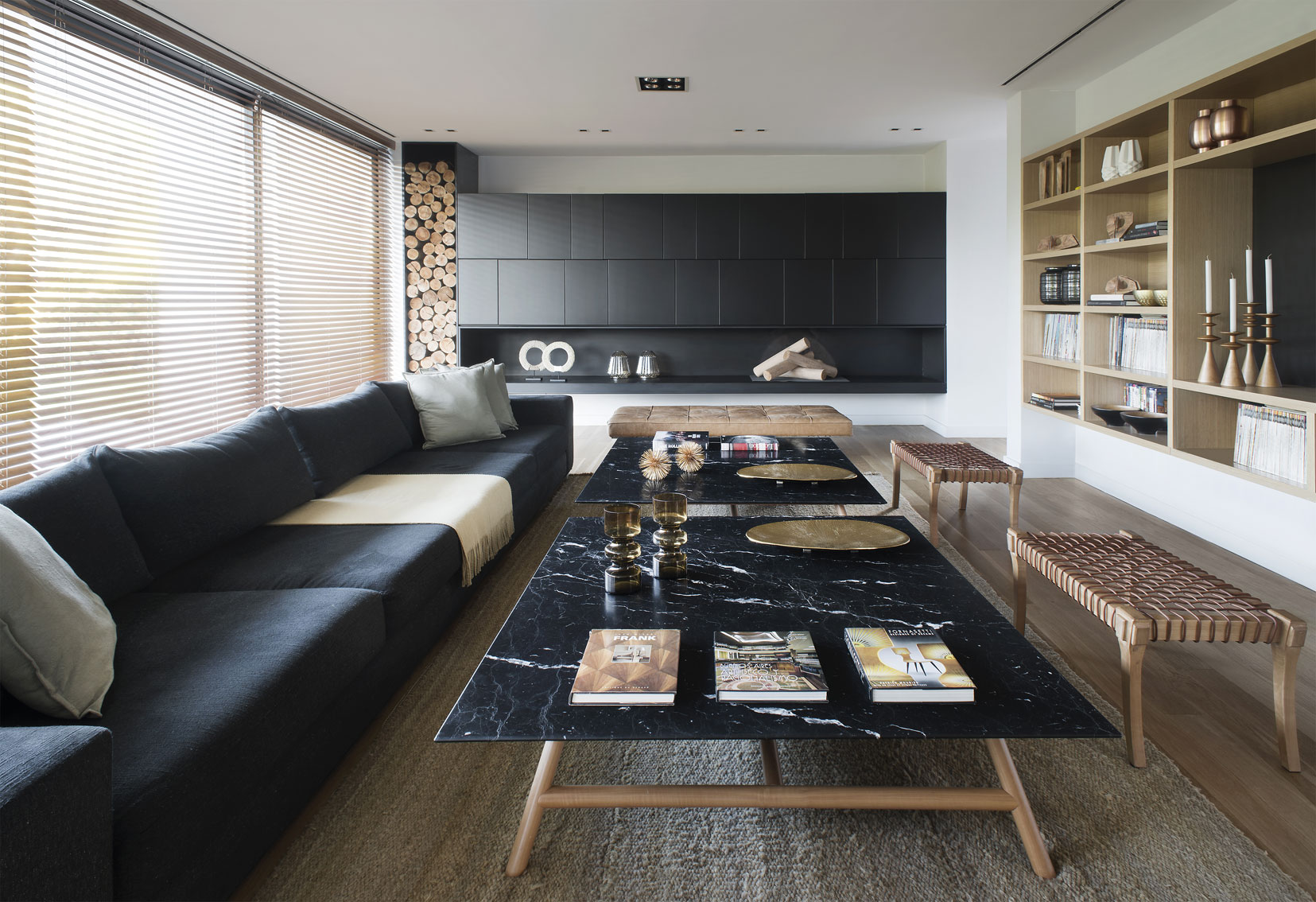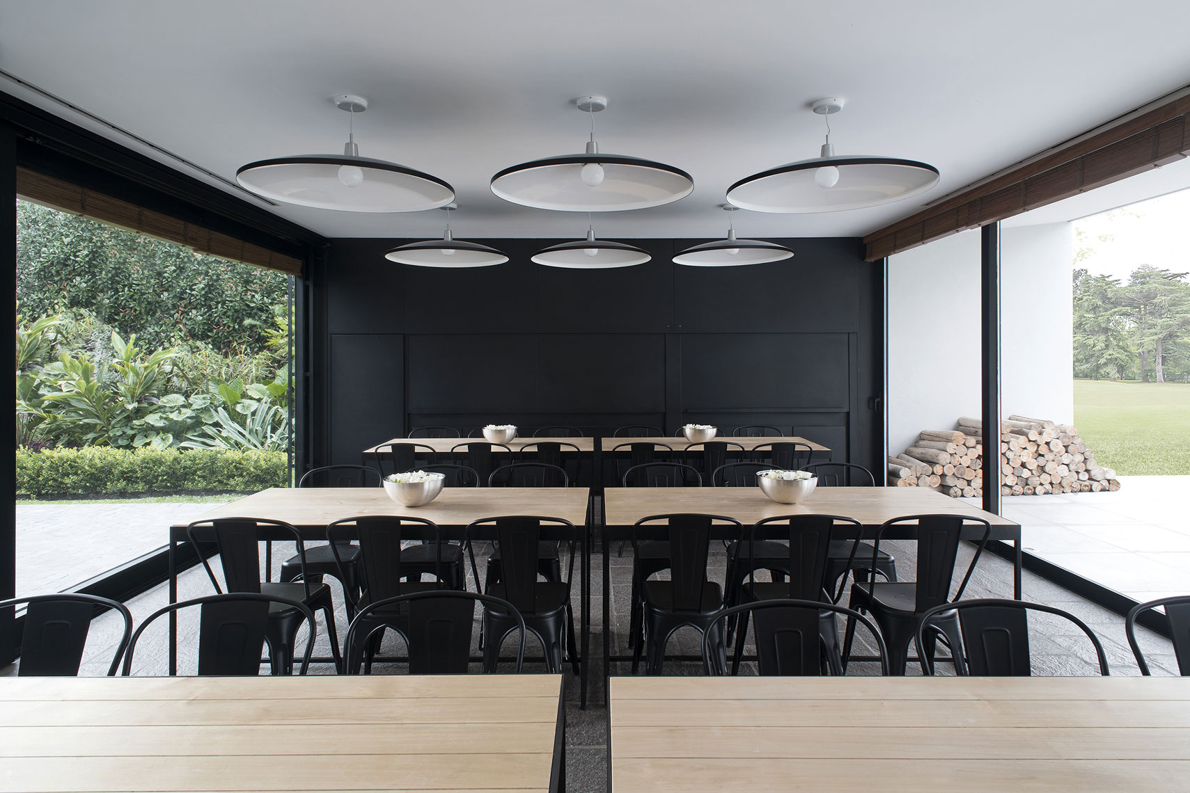 The Studio created this house inspired by two main challenges: the irregular lot with a view to a spectacular golf course, and the will to create the perfect stage for day to day family life. So the project contemplated the existence of two blocks, which included a basement and two stories, connected by a central hallway that allowed for vertical circulation. Between the two blocks, as a sort of breathing transition, this area was conceived as a metallic and glass structure, which creates a sense of lightness and transparency. In sync with the lot’s trapezoidal layout, the back module duplicates the front one in size. Grand windows blend the construction into the greenery that surrounds it. Gray reigns within the color scheme on exterior wall coverings, with openings in black aluminum. Oak wood was used for all house flooring. The Studio was also in charge of interior equipment, which consisted of custom furniture, modules and built-in shelves with a lacquer finish and exquisitely detailed workmanship. Modern 1950’s inspired furniture combined with other pieces with a touch of Scandinavian flair complete the interior decoration.