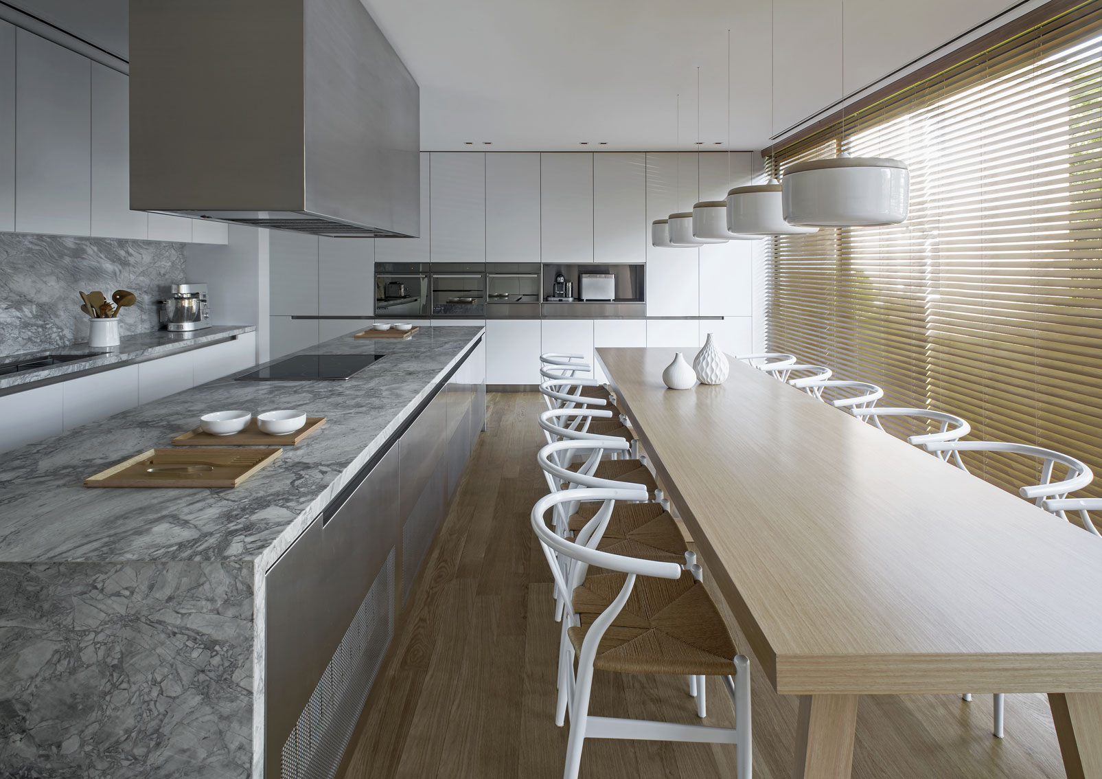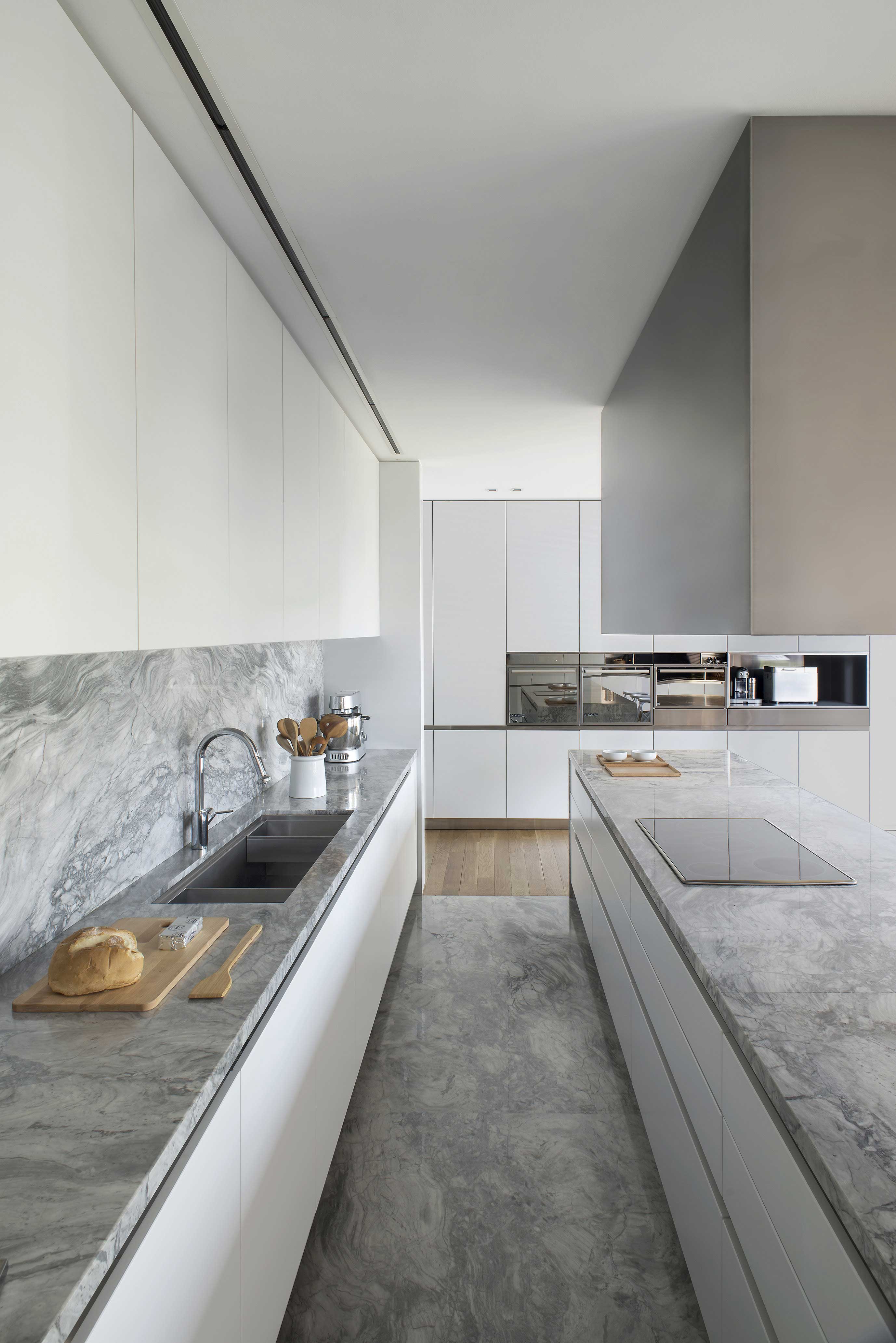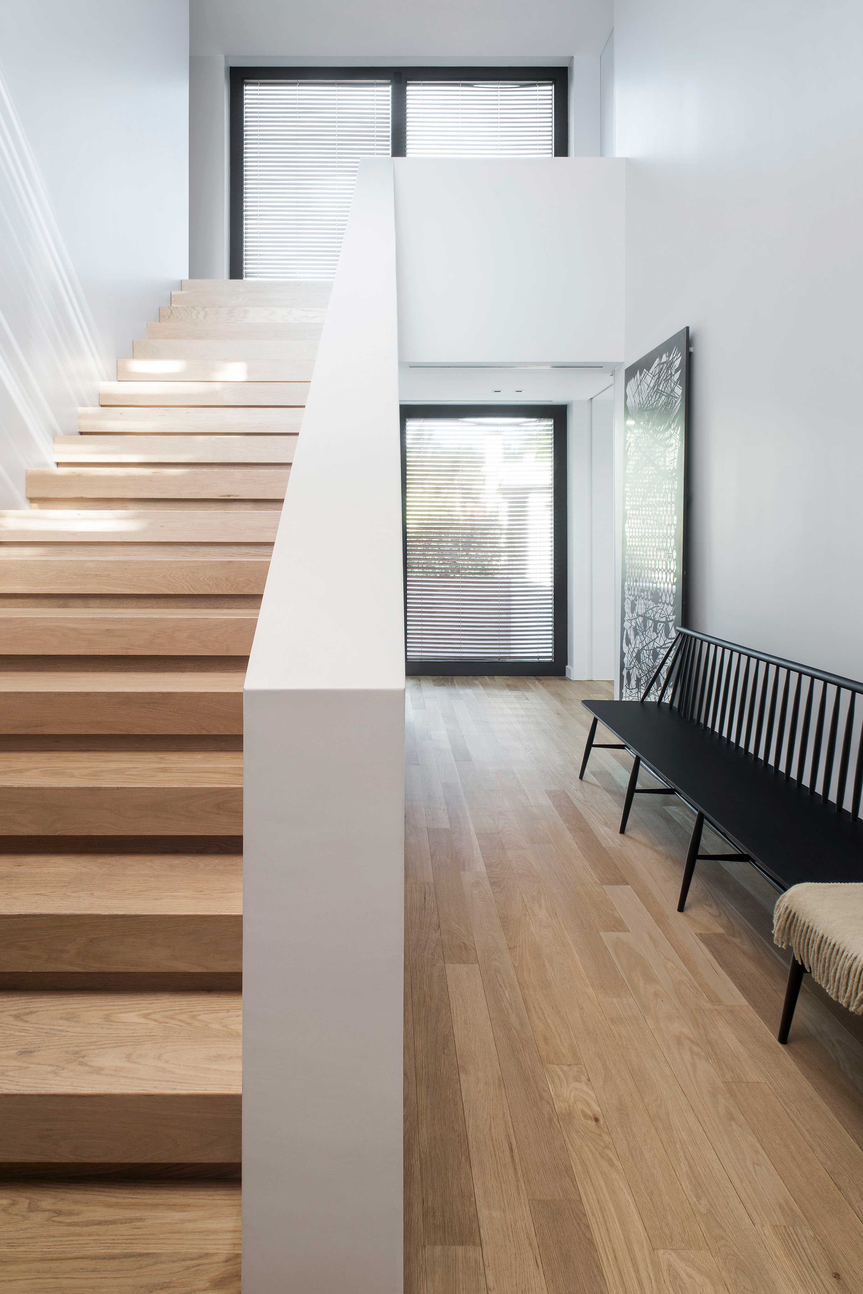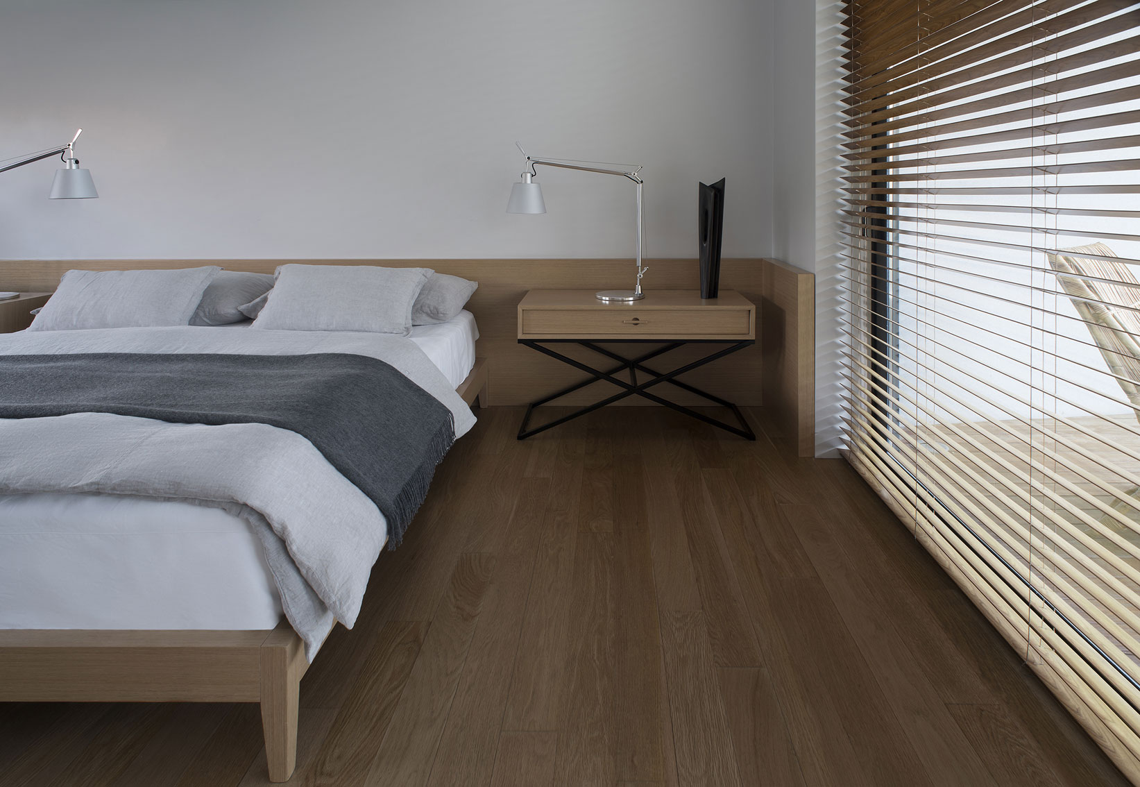 The Studio created this house inspired by two main challenges: the irregular lot with a view to a spectacular golf course, and the will to create the perfect stage for day to day family life. So the project contemplated the existence of two blocks, which included a basement and two stories, connected by a central hallway that allowed for vertical circulation. Between the two blocks, as a sort of breathing transition, this area was conceived as a metallic and glass structure, which creates a sense of lightness and transparency. In sync with the lot’s trapezoidal layout, the back module duplicates the front one in size. Grand windows blend the construction into the greenery that surrounds it. Gray reigns within the color scheme on exterior wall coverings, with openings in black aluminum. Oak wood was used for all house flooring. The Studio was also in charge of interior equipment, which consisted of custom furniture, modules and built-in shelves with a lacquer finish and exquisitely detailed workmanship. Modern 1950’s inspired furniture combined with other pieces with a touch of Scandinavian flair complete the interior decoration.