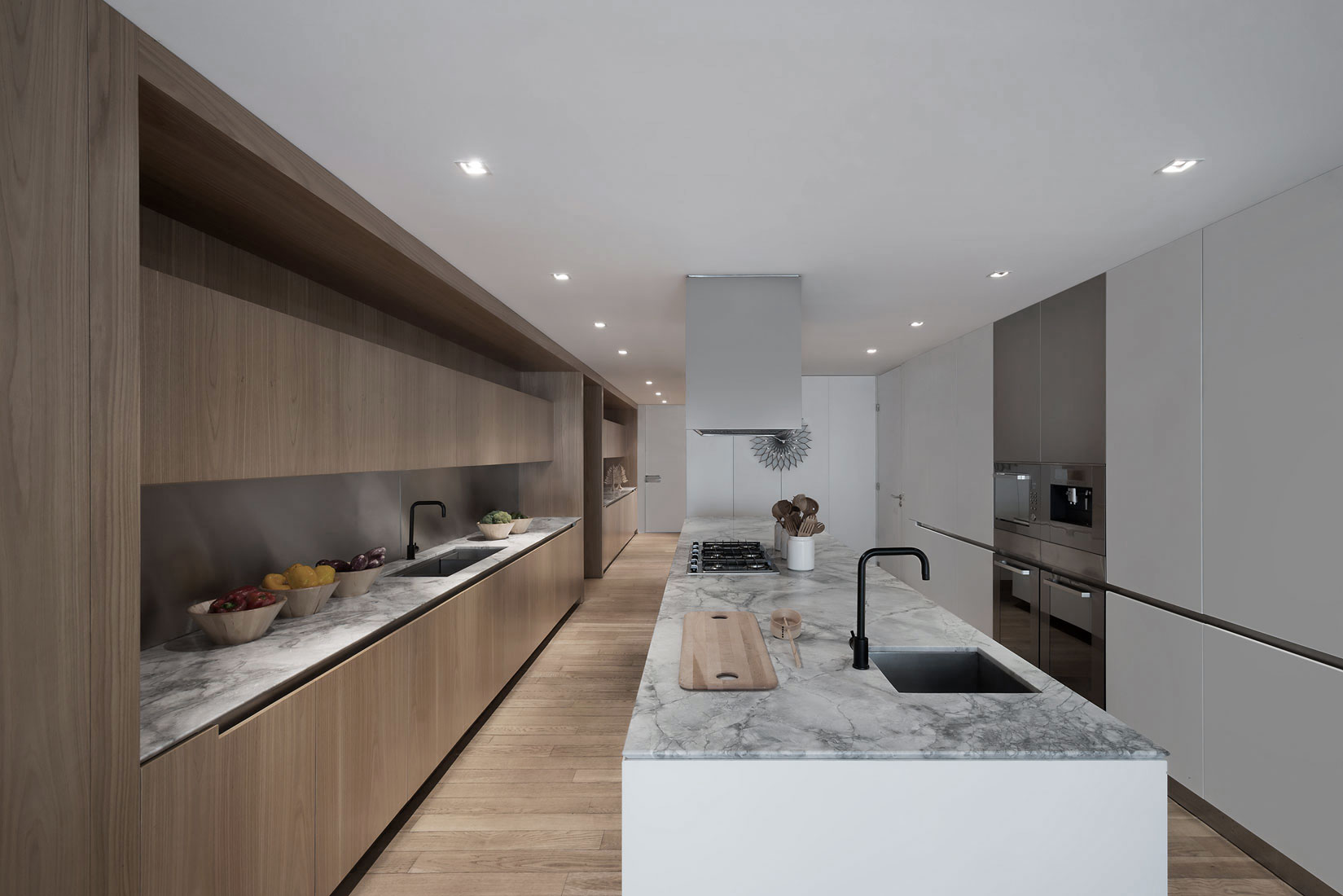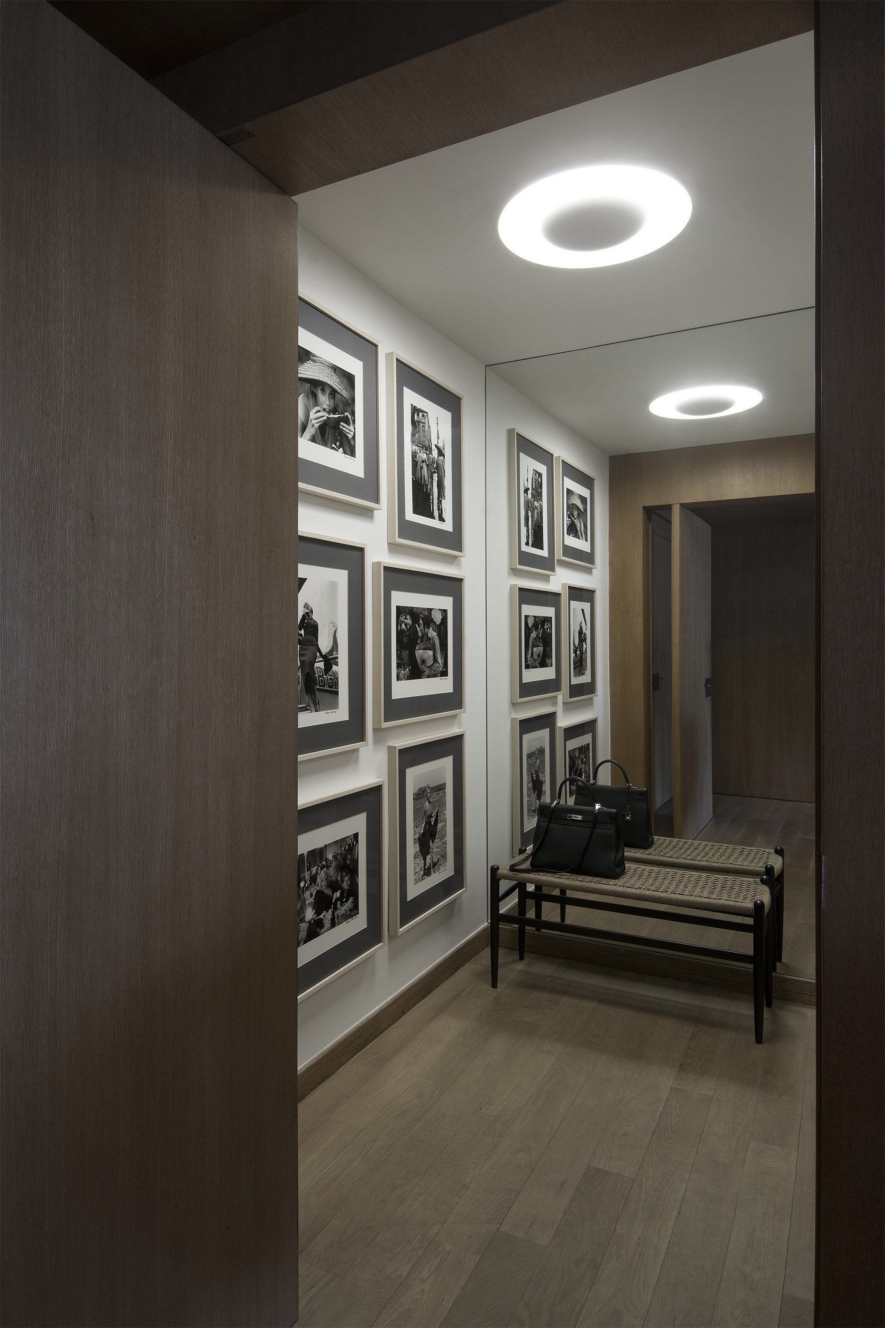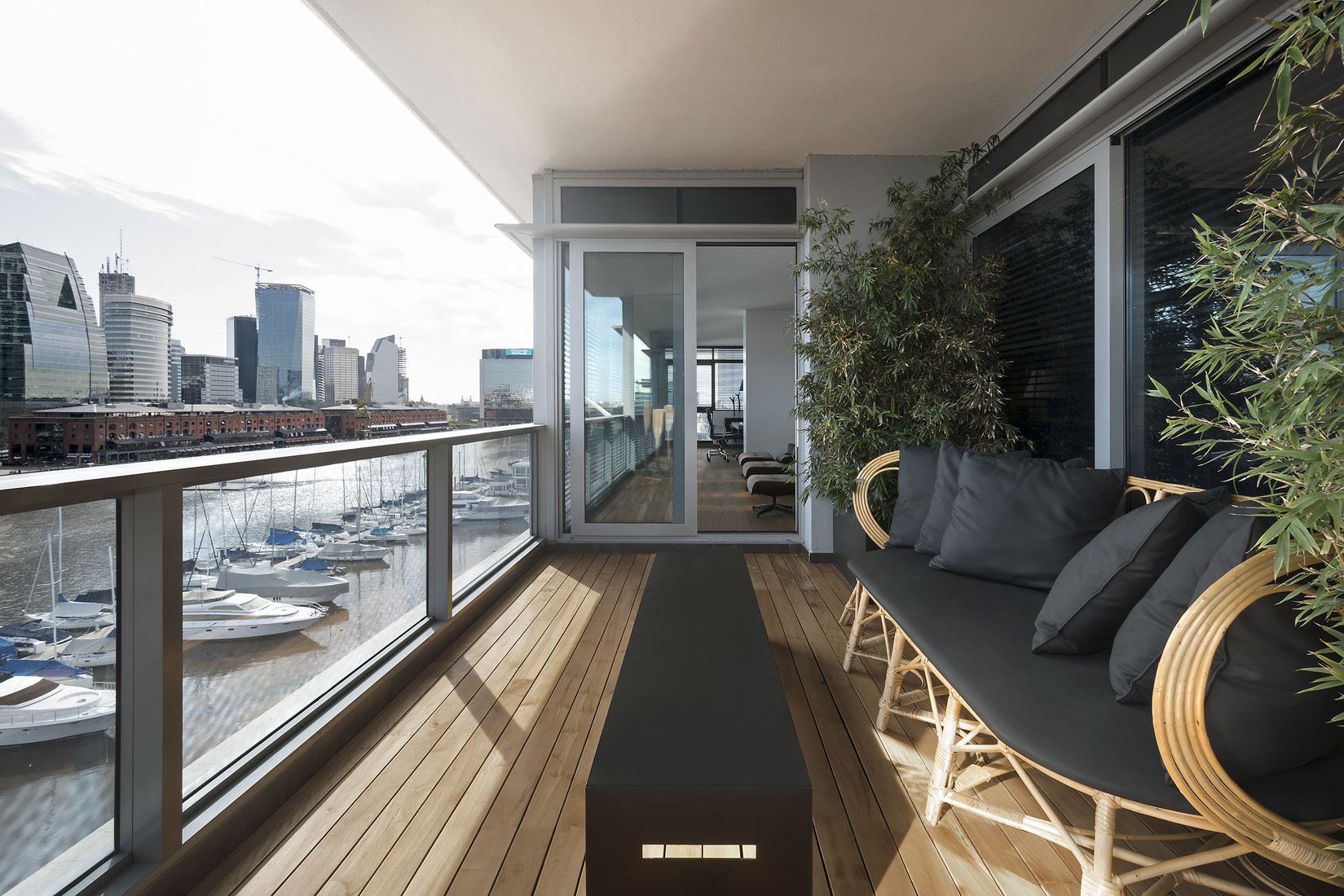 In this case, the Studio received a request to create everything almost from scratch in order to develop a complete renewal on this very spacious 450 square meter apartment. Walls were torn down, bathroom locations changed, rooms were switched around, everything that was needed to accommodate the needs of a married couple and their three children. Within the architectural style and interior design for which the Studio is well known, the goal was to generate continuity in the apartment, so as few elements as possible were used to seamlessly bring together the totality of the space. A good example of this is the American oak flooring that extends throughout the whole apartment, including the kitchen and the entrance hall. All equipment was custom-designed for each room, mostly made out the same wood. In the reception area two significant integrated sectors where designed, to exalt the extraordinary view granted by this apartment. There is a sense of being on the deck of a ship, enjoying the view from the dock, watching the boats go by, as well as observing some urban landmarks as if on a giant screen. Custom carpets extend along the whole home which features two art pieces by Pablo Siquier in the corners and a sculpture by Pablo Reinoso in the center. The large bedroom suites were built with the same materials found in the social area, once again with oak in a leading role. The kitchen was virtually subdivided into different sectors: the central area for cooking, with a family dining room to the side and, on the opposite end, an area to store dishes that is connected to the dining room. Unifying materials was also the concept at play here in the kitchen – the heart of the house- where the oak wood and lacquer finish furniture amplify the sense of uninterruptedness. All the huge bathrooms were covered with Calacatta marble.