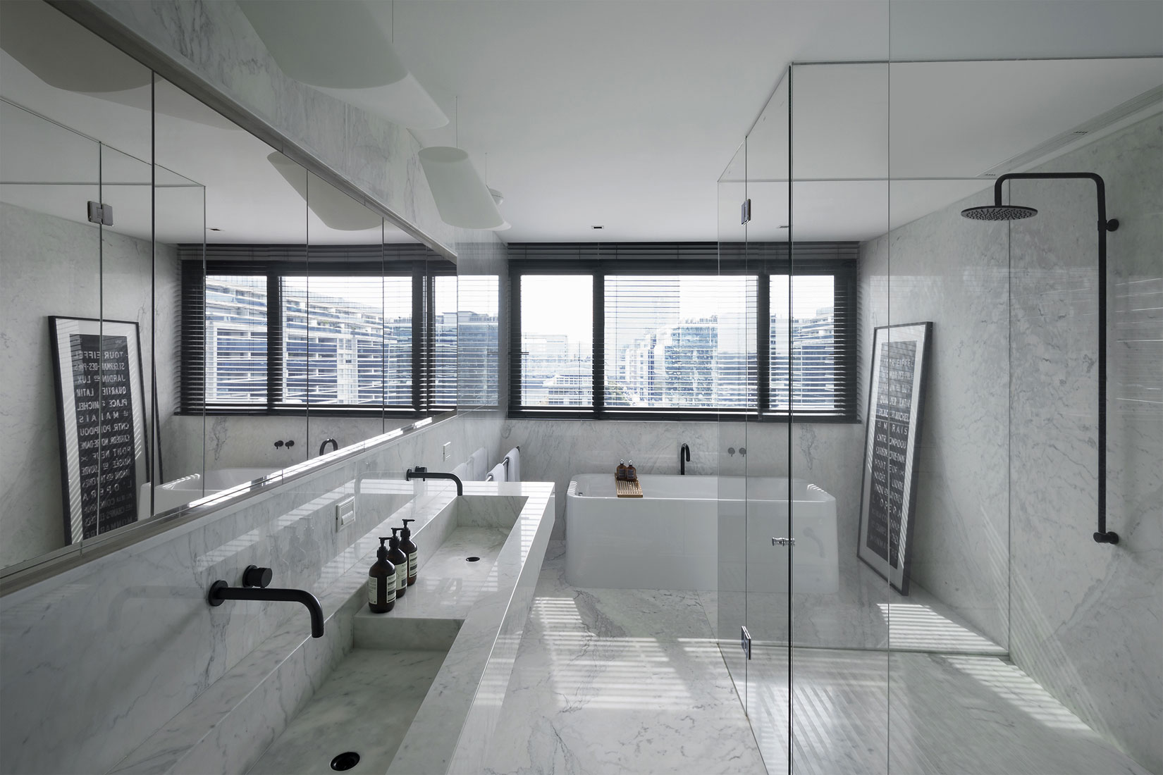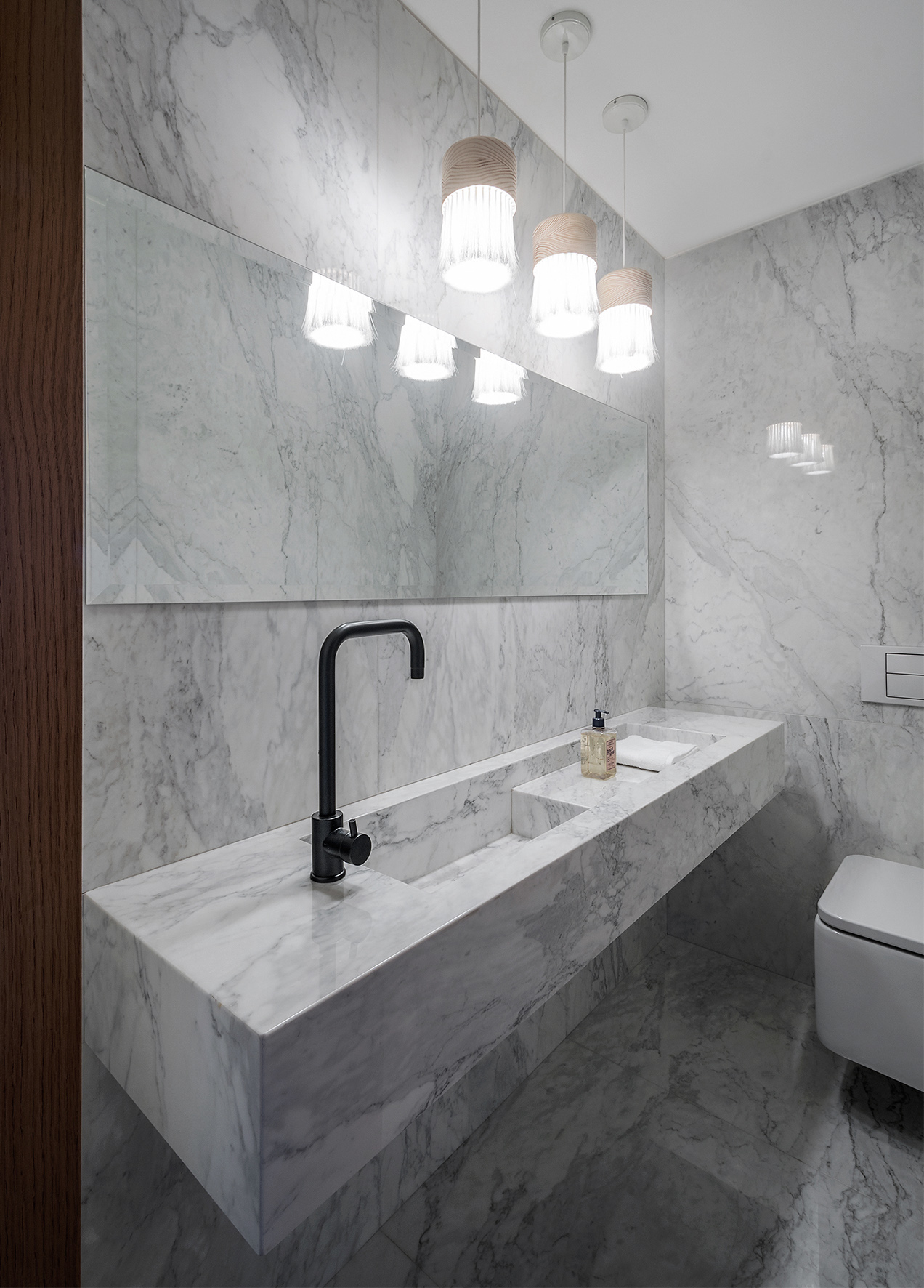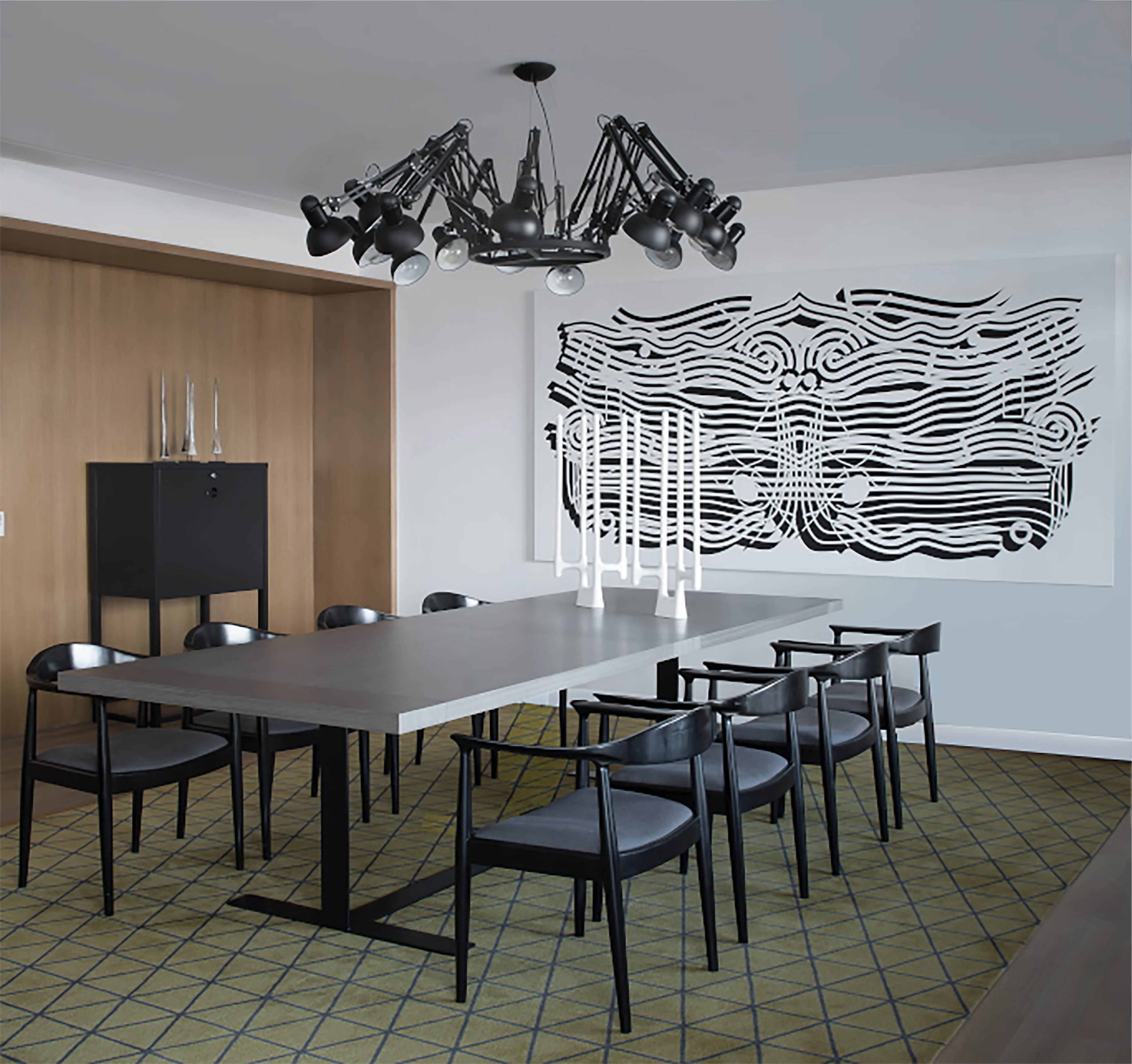 In this case, the Studio received a request to create everything almost from scratch in order to develop a complete renewal on this very spacious 450 square meter apartment. Walls were torn down, bathroom locations changed, rooms were switched around, everything that was needed to accommodate the needs of a married couple and their three children. Within the architectural style and interior design for which the Studio is well known, the goal was to generate continuity in the apartment, so as few elements as possible were used to seamlessly bring together the totality of the space. A good example of this is the American oak flooring that extends throughout the whole apartment, including the kitchen and the entrance hall. All equipment was custom-designed for each room, mostly made out the same wood. In the reception area two significant integrated sectors where designed, to exalt the extraordinary view granted by this apartment. There is a sense of being on the deck of a ship, enjoying the view from the dock, watching the boats go by, as well as observing some urban landmarks as if on a giant screen. Custom carpets extend along the whole home which features two art pieces by Pablo Siquier in the corners and a sculpture by Pablo Reinoso in the center. The large bedroom suites were built with the same materials found in the social area, once again with oak in a leading role. The kitchen was virtually subdivided into different sectors: the central area for cooking, with a family dining room to the side and, on the opposite end, an area to store dishes that is connected to the dining room. Unifying materials was also the concept at play here in the kitchen – the heart of the house- where the oak wood and lacquer finish furniture amplify the sense of uninterruptedness. All the huge bathrooms were covered with Calacatta marble.