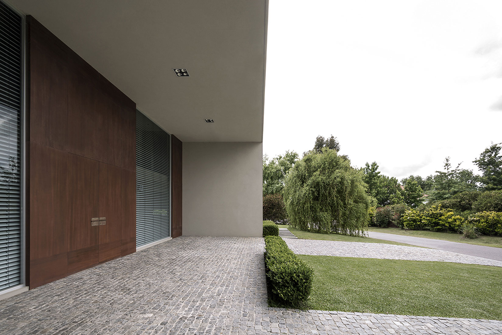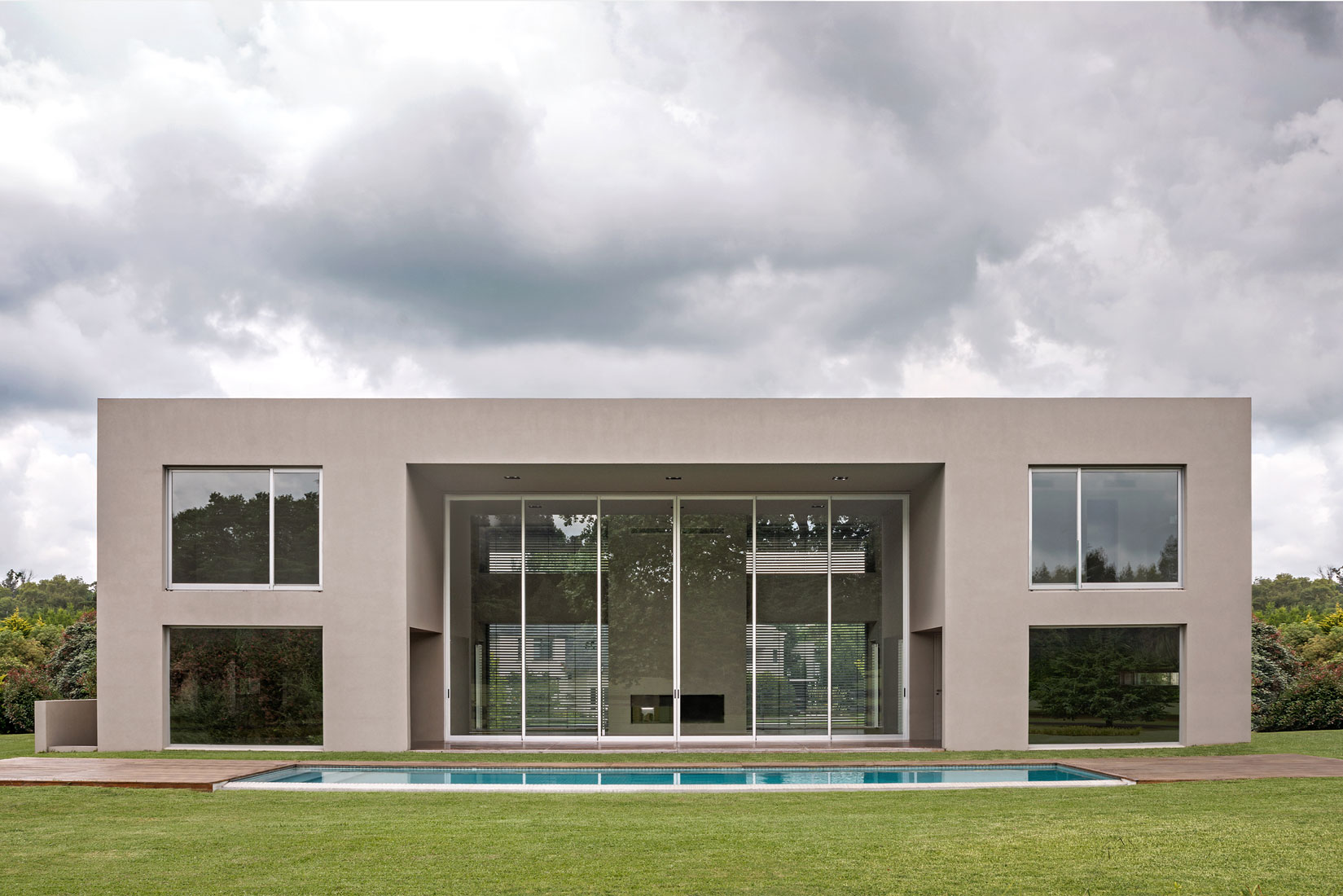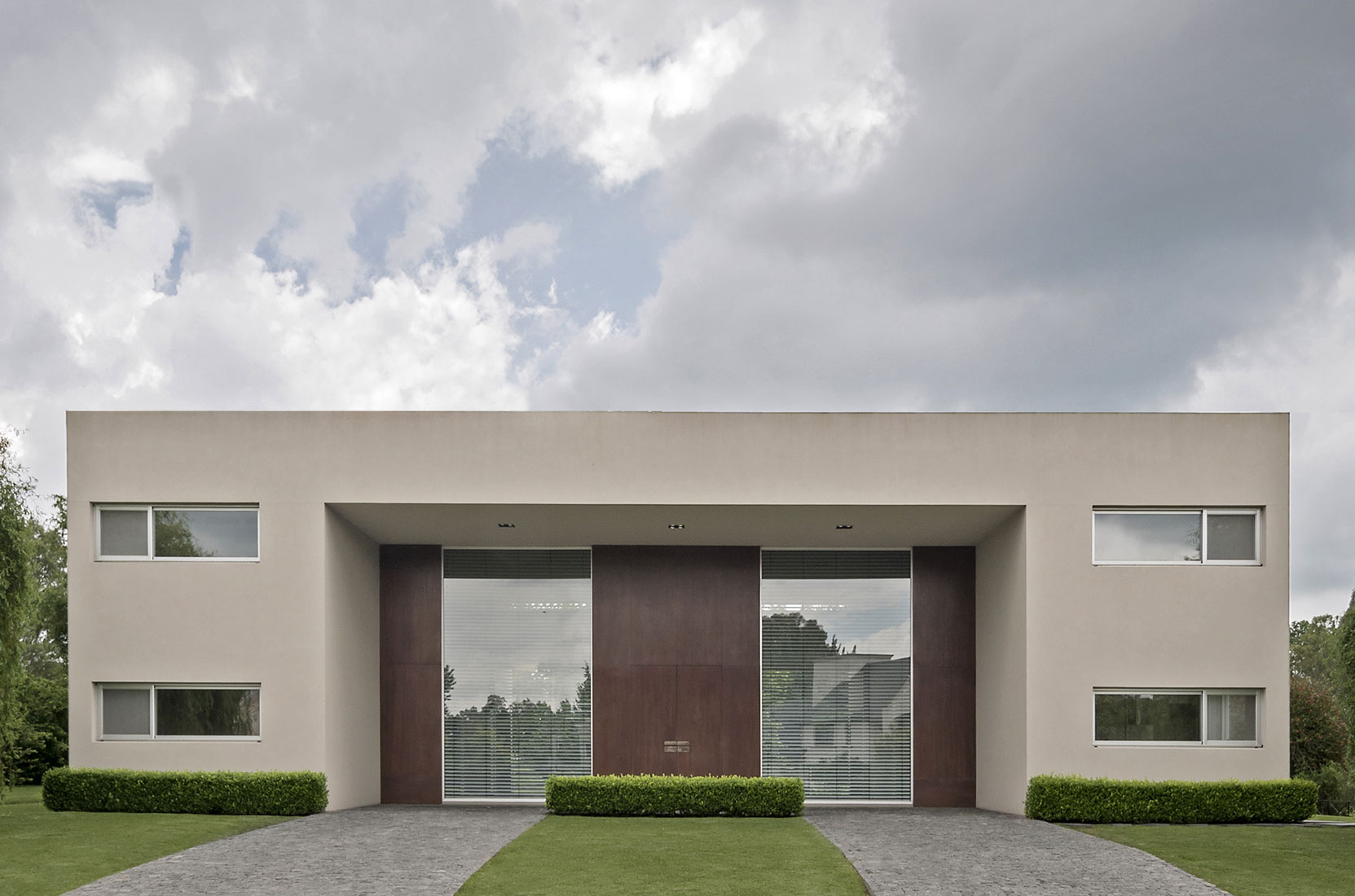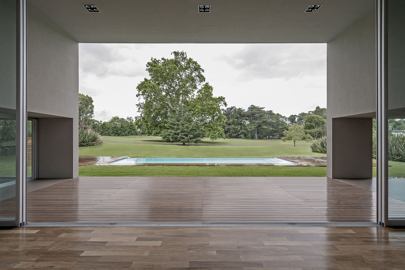 While one area includes the kitchen and dining room and, the master suite and study on the top story, the other lateral is dedicated to the younger generation and includes a playroom and guest room with the children’s bedrooms on the upper floor. Both sectors are connected on the top story by a bridge that provides a balcony over the social area on the ground floor. By joining these two blocks a public area was generated in the home, made up of an expansive living room oriented towards an ancient oak which, thanks to the double height of the space, can be appreciated in all its magnitude. On the front facade, besides the impressive 12 meter porch, an intended privacy reigns, with an entrance which alternates wooden panels and glass panes equipped with an automated curtain system. The side which faces the garden opens up completely, generating continuity between inner and outer spaces. The living room and gallery share the same wood flooring which enhances the sense of integration. A neutral color was chosen for the whole house to highlight visual continuity. The design has been stripped of accessories for the strength of architectural language to prevail. Anodized aluminum accounts for the carpentry, while wood is reserved for spaces without exposure to the outdoors. The humid zones, such as the kitchen and bathrooms, were constructed with materials in the same neutral tones.