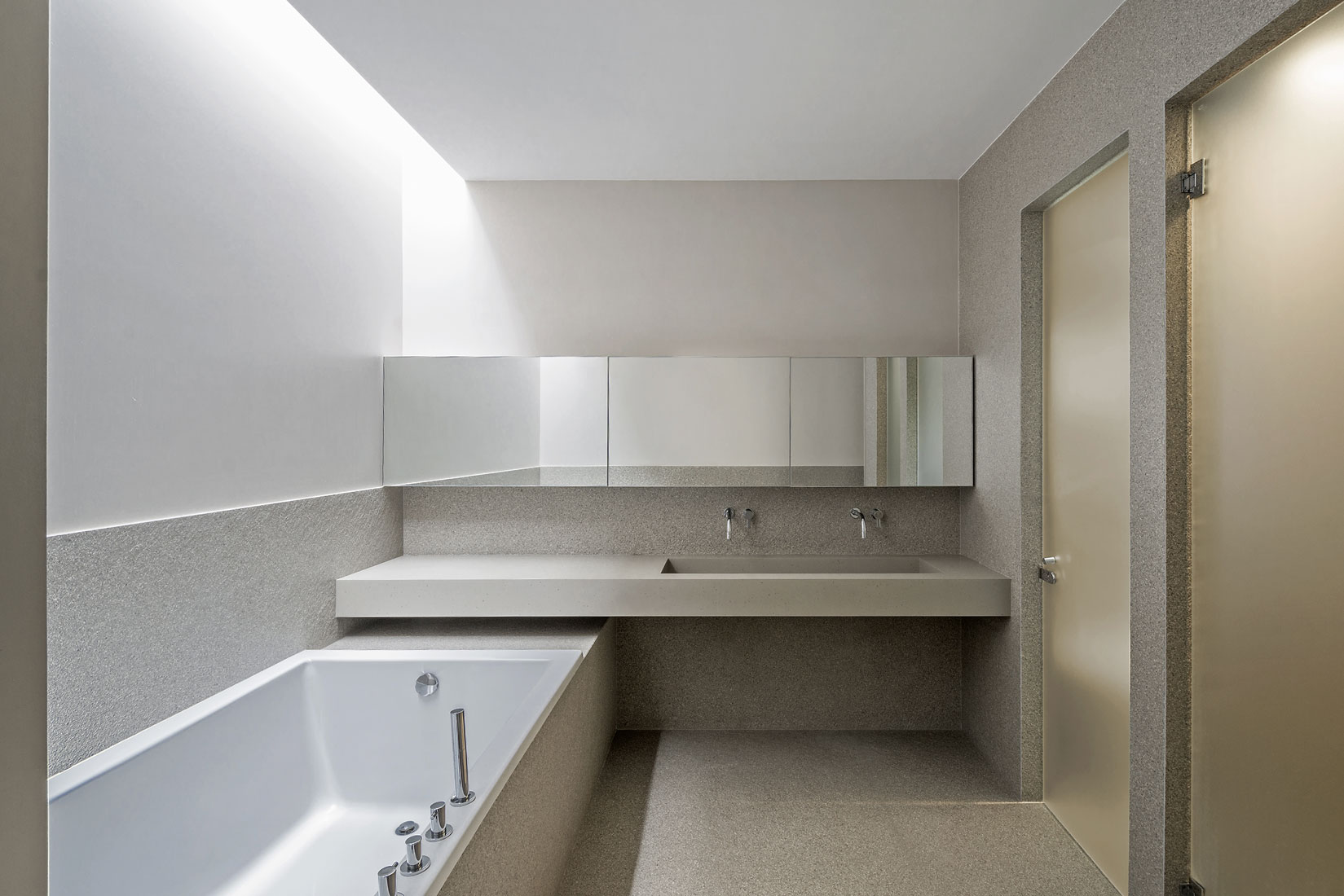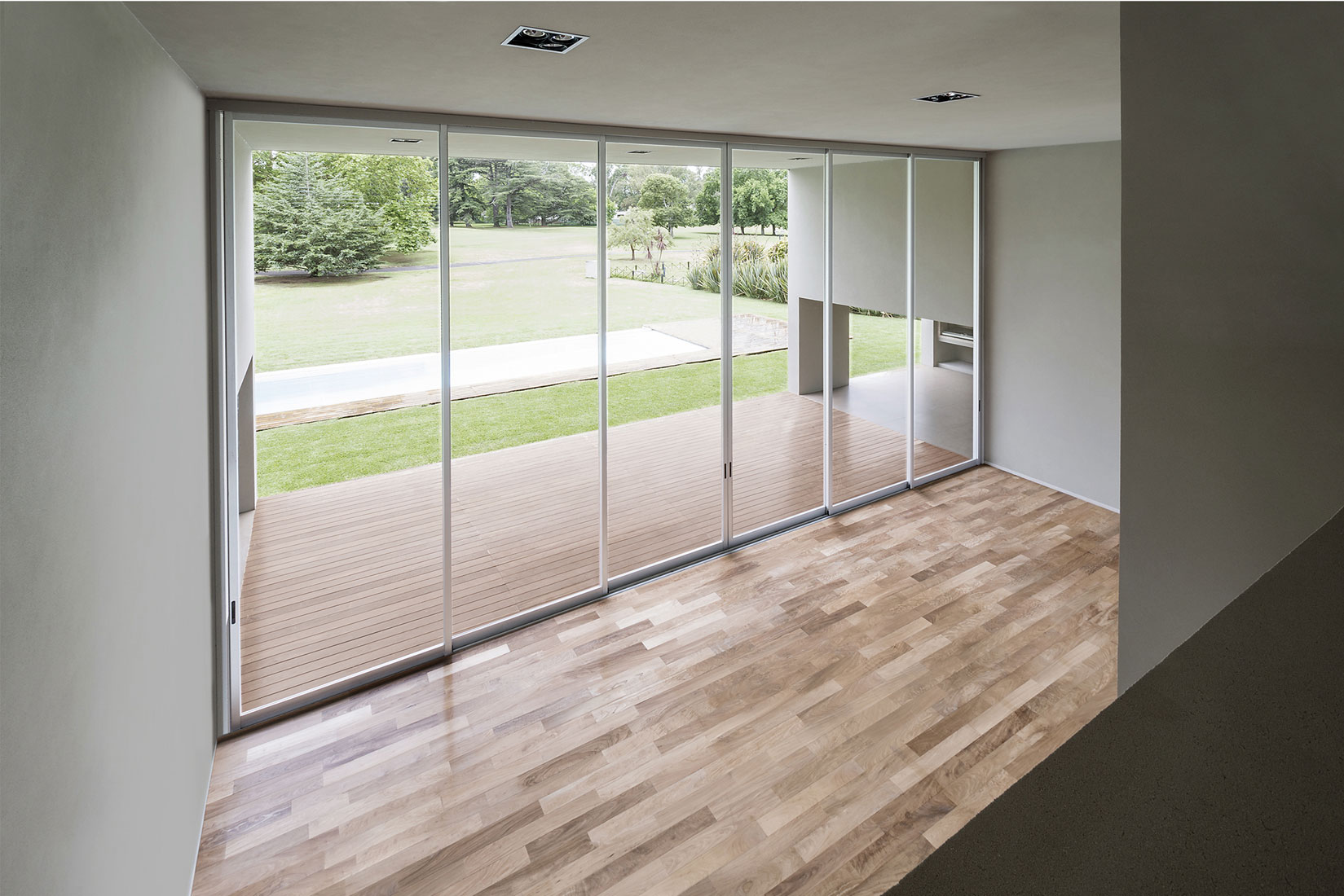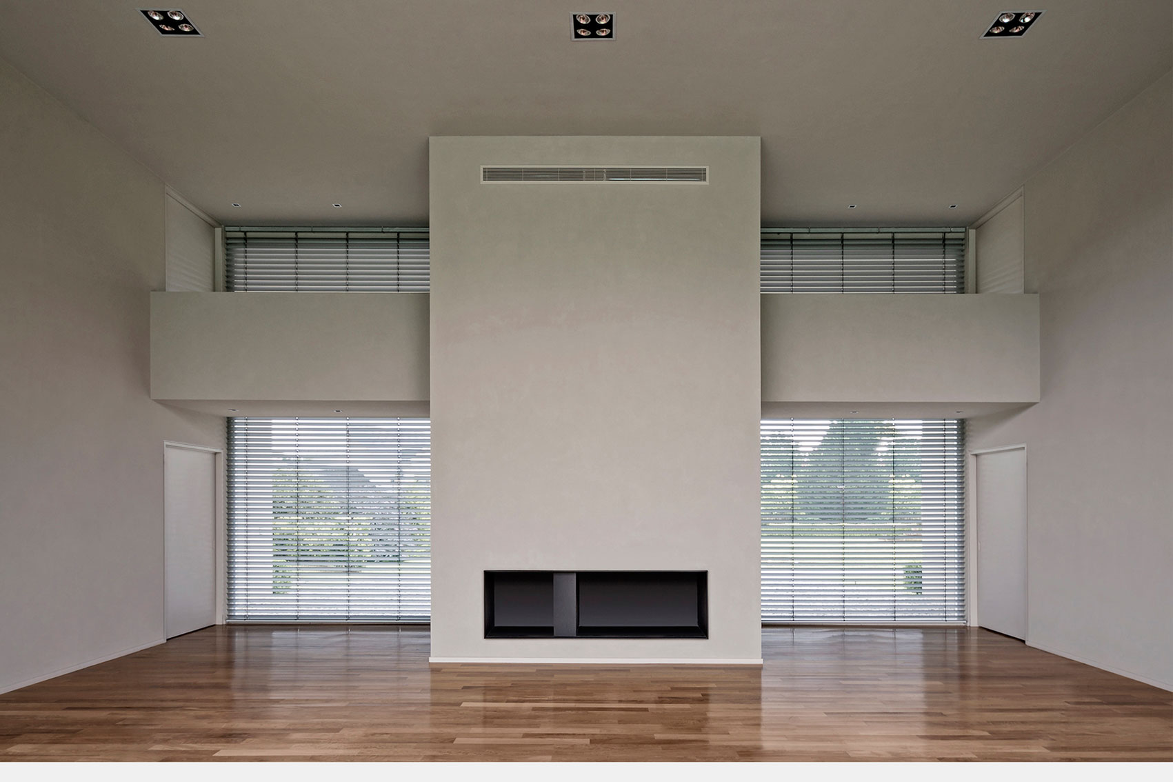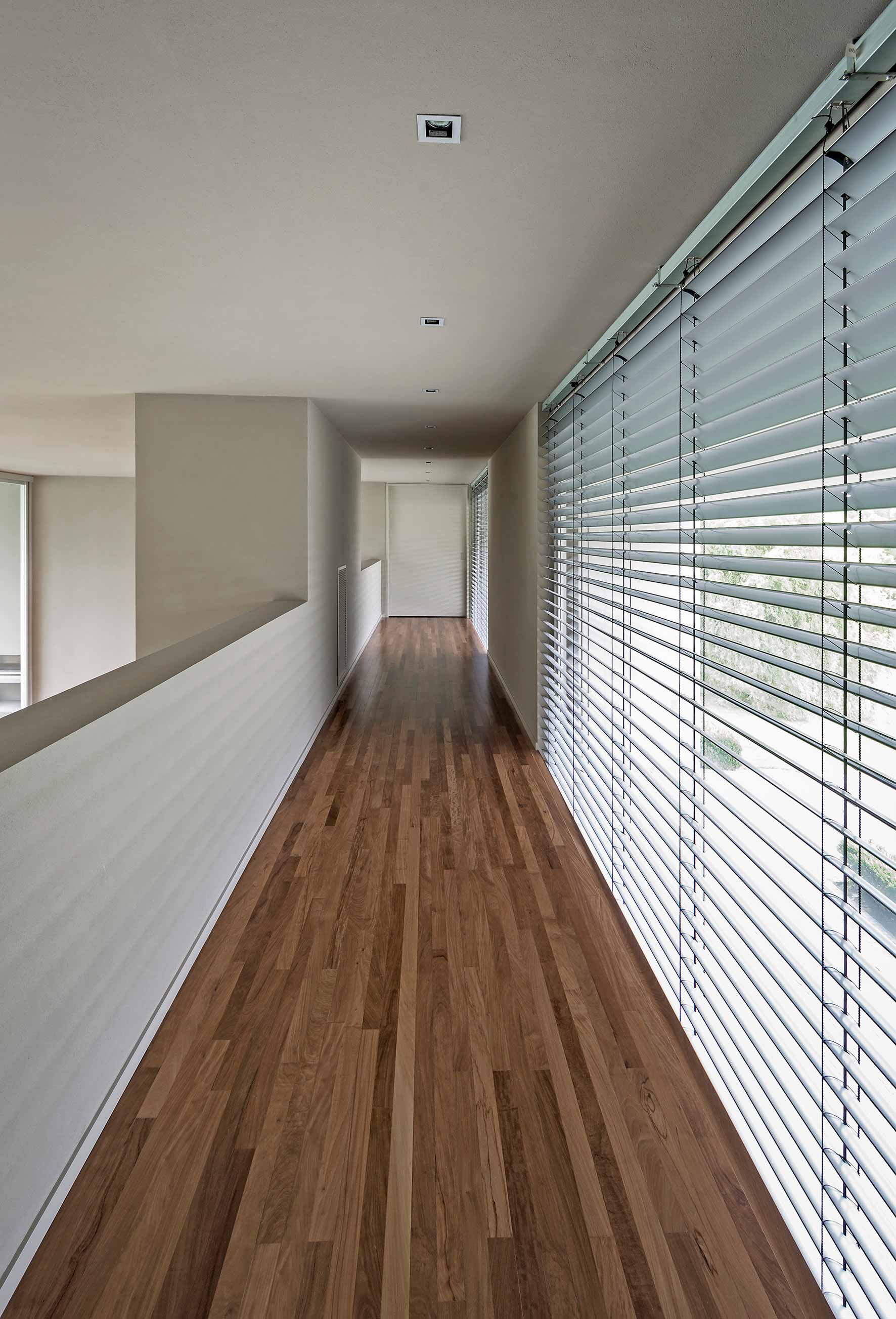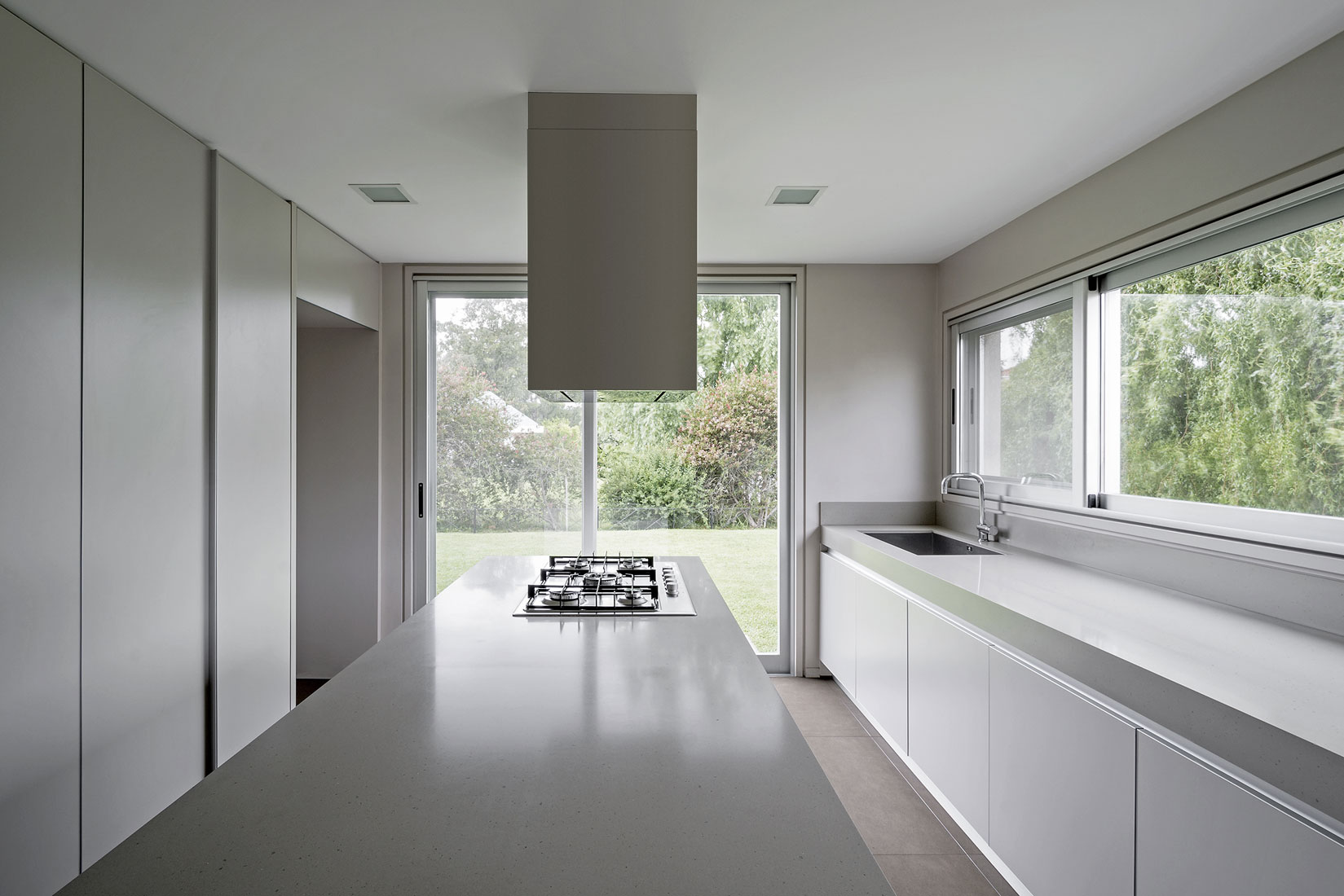 While one area includes the kitchen and dining room and, the master suite and study on the top story, the other lateral is dedicated to the younger generation and includes a playroom and guest room with the children’s bedrooms on the upper floor. Both sectors are connected on the top story by a bridge that provides a balcony over the social area on the ground floor. By joining these two blocks a public area was generated in the home, made up of an expansive living room oriented towards an ancient oak which, thanks to the double height of the space, can be appreciated in all its magnitude. On the front facade, besides the impressive 12 meter porch, an intended privacy reigns, with an entrance which alternates wooden panels and glass panes equipped with an automated curtain system. The side which faces the garden opens up completely, generating continuity between inner and outer spaces. The living room and gallery share the same wood flooring which enhances the sense of integration. A neutral color was chosen for the whole house to highlight visual continuity. The design has been stripped of accessories for the strength of architectural language to prevail. Anodized aluminum accounts for the carpentry, while wood is reserved for spaces without exposure to the outdoors. The humid zones, such as the kitchen and bathrooms, were constructed with materials in the same neutral tones.